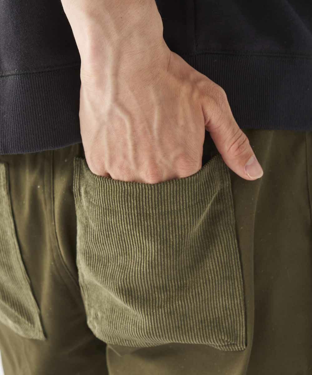 ツイルパンツにコーデュロイを部分使いで使用しています。
