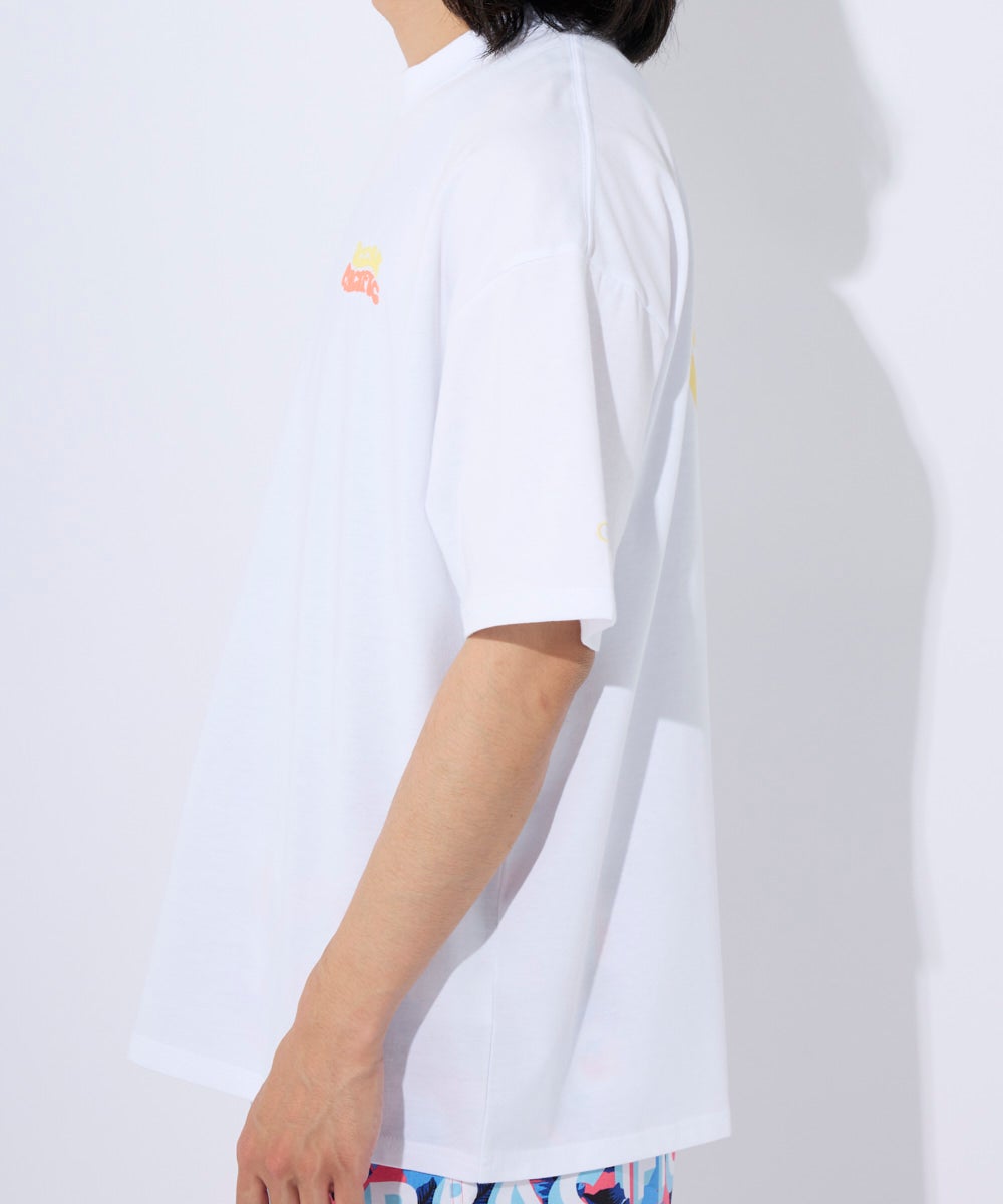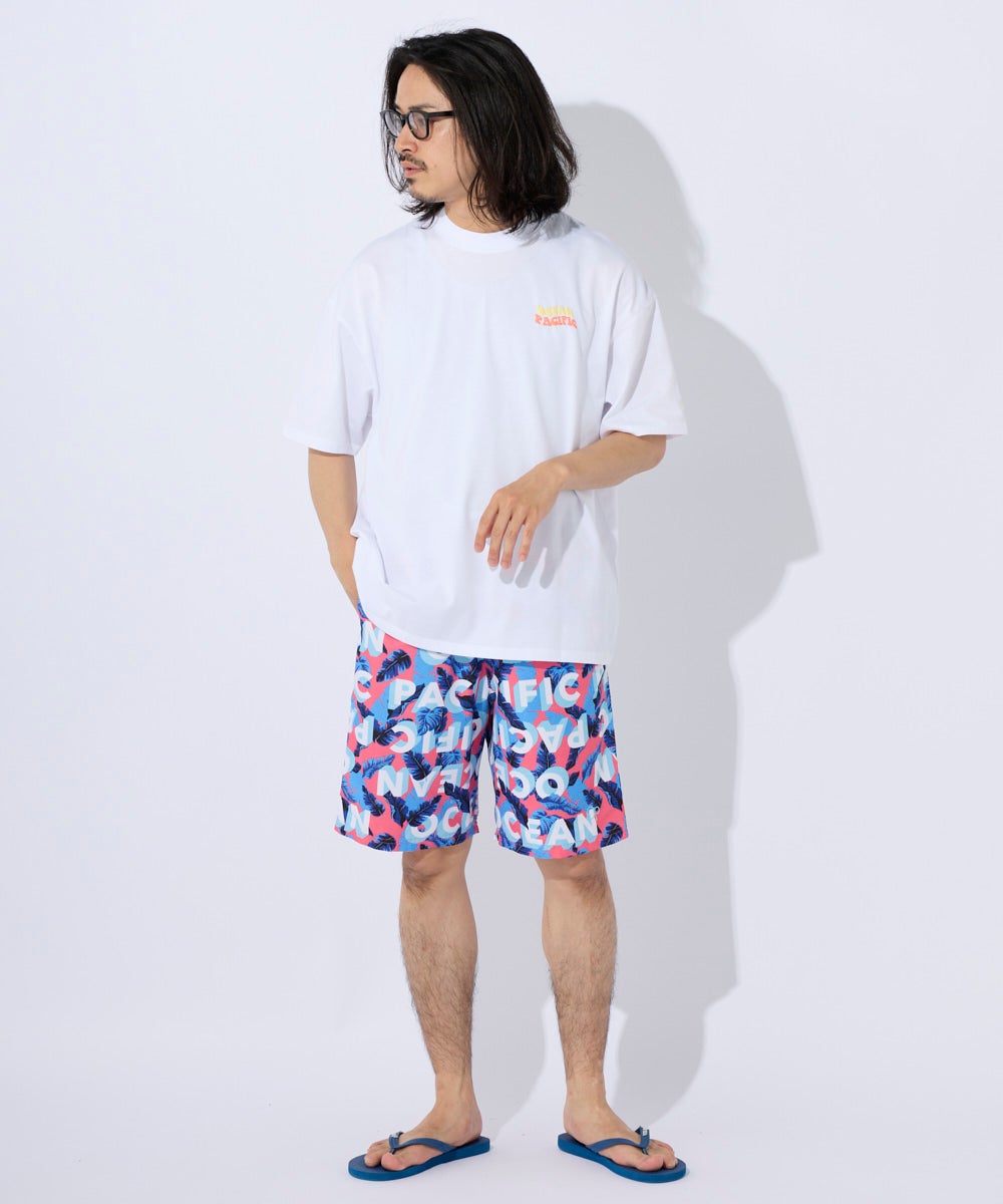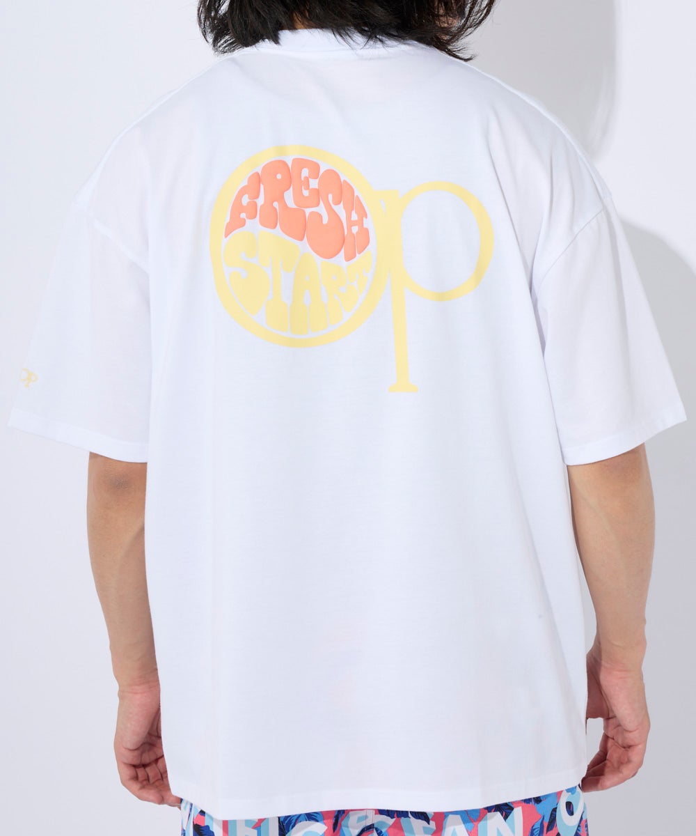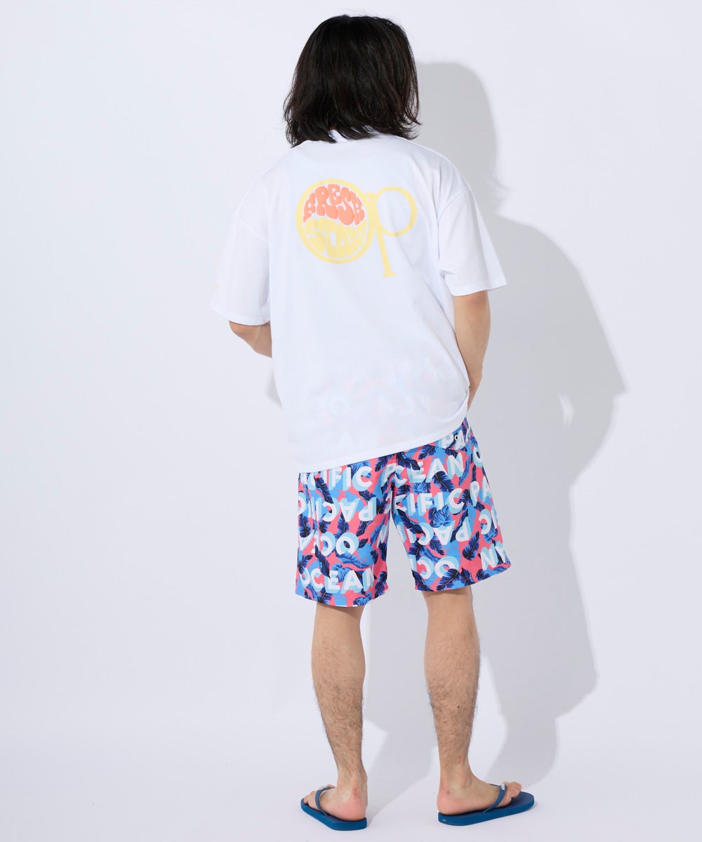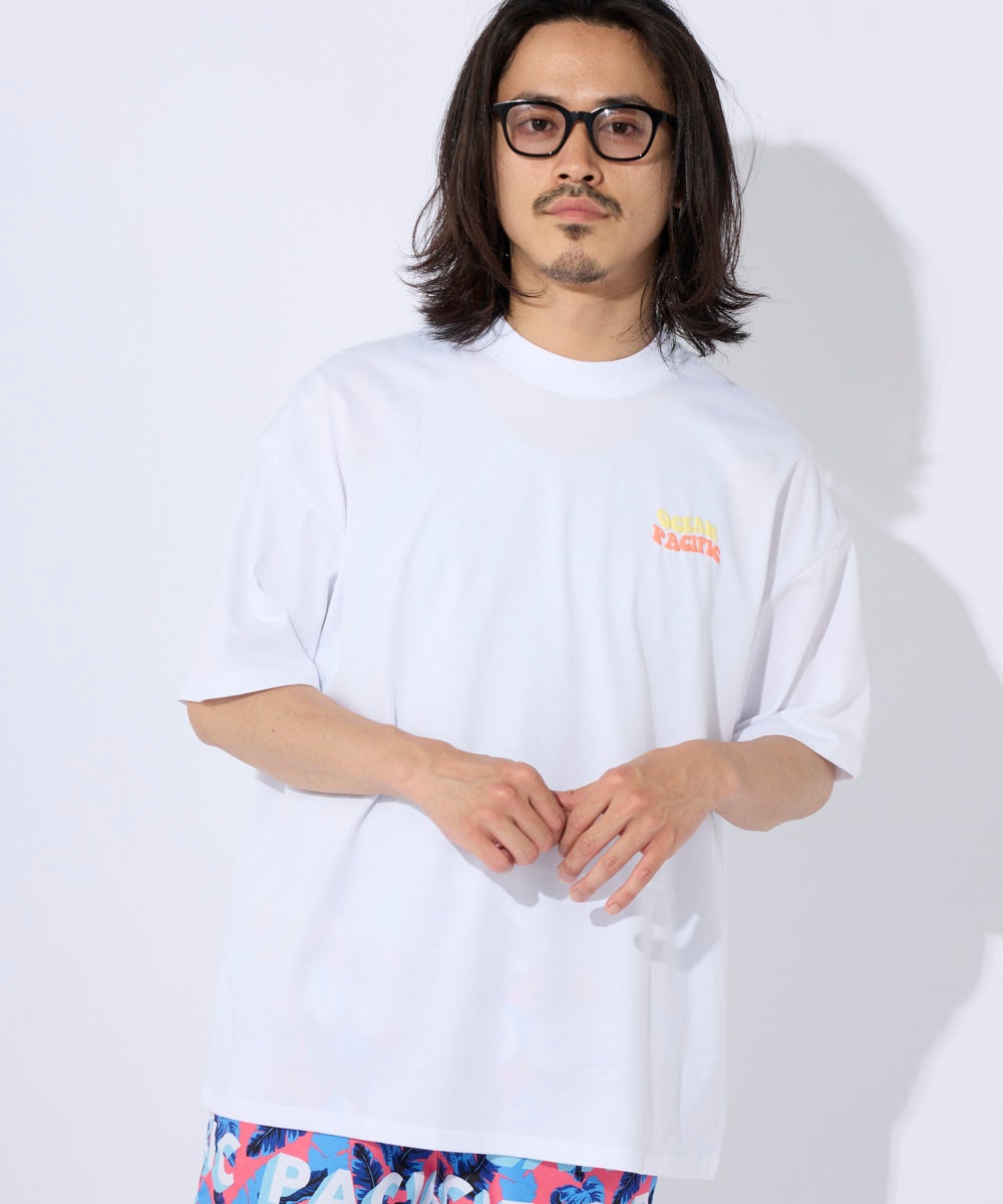 カジュアルにも水回りのレジャーにも使いやすいDRY天竺。 フロントとバックにロゴとocean pacificアイコンを発砲プリントしています。