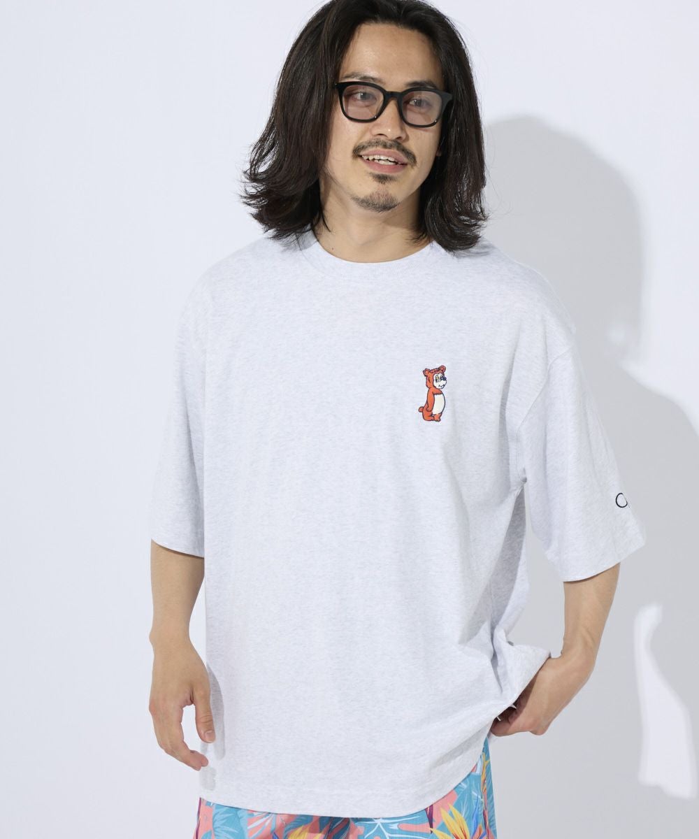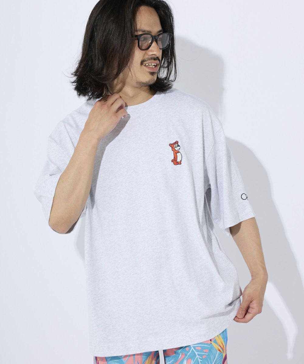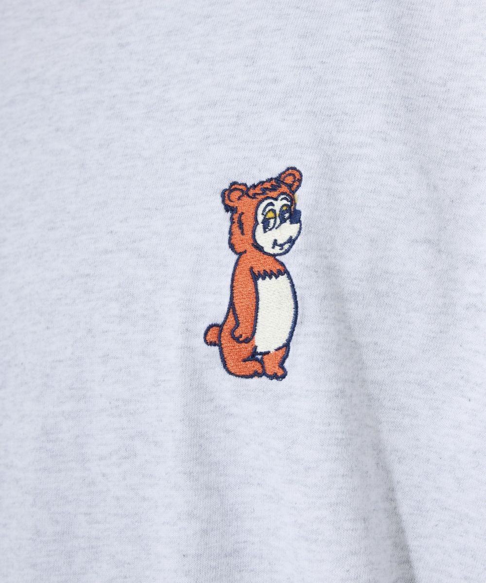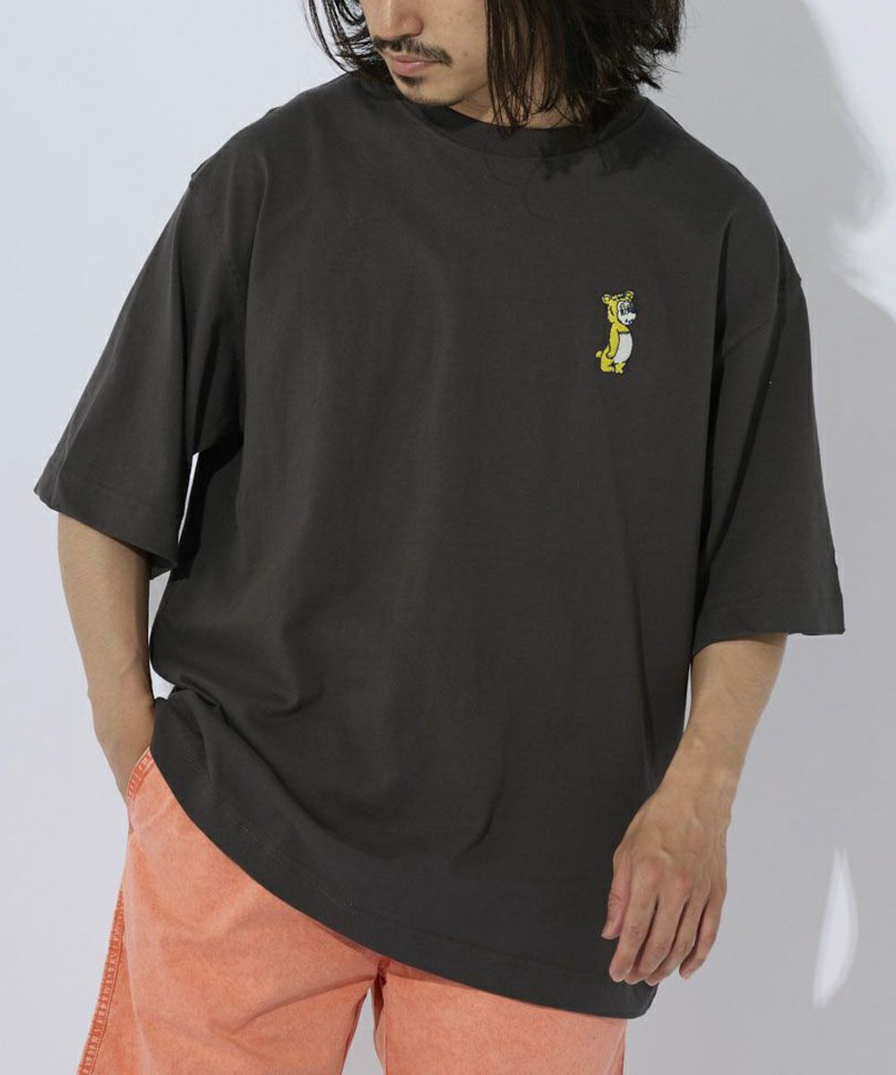 厚手でカジュアル感のあるOE天竺を使用。 フロントにはワンポイントでキャラクターの刺繍がPOPでおしゃれポイントに。