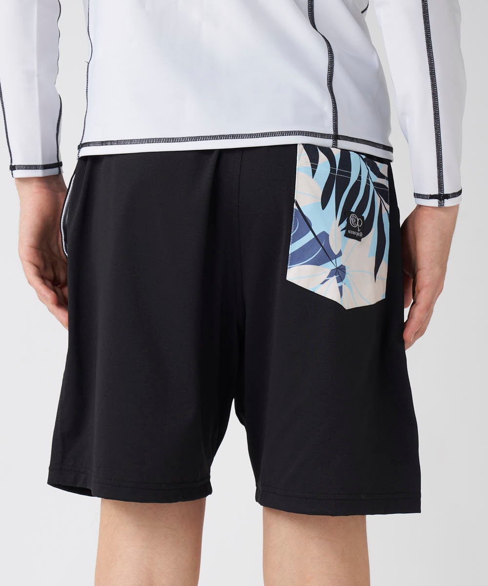 メンズハイブリッドショーツ。PEARTEX素材を使用し、水陸両用・吸汗速乾・UPF50+対応で 快適な着心地。シーズンテーマのリーフ柄を背面ポケットとベルトループの内側に配置し、 機能性とデザイン性を兼ね備えた一枚です。