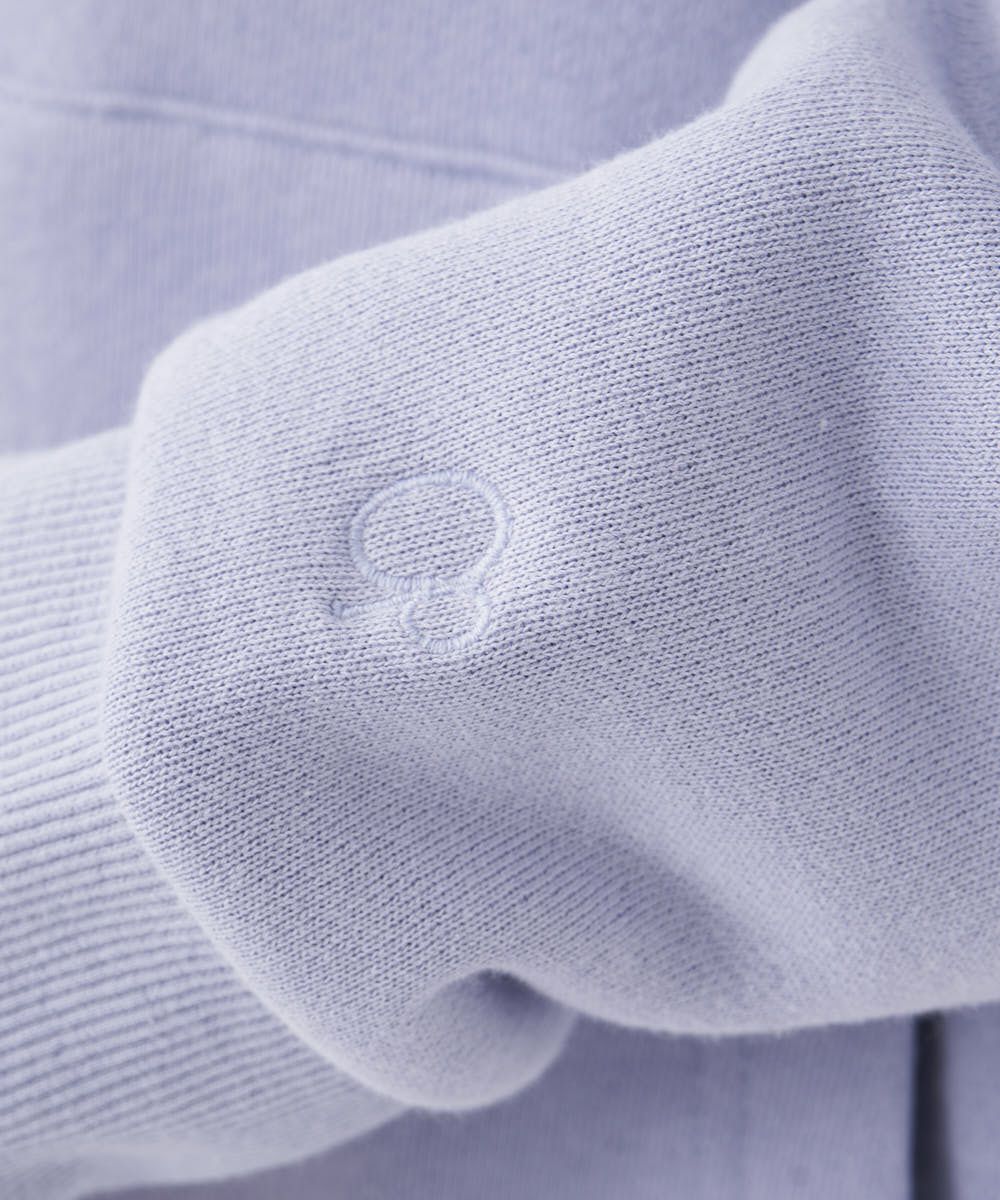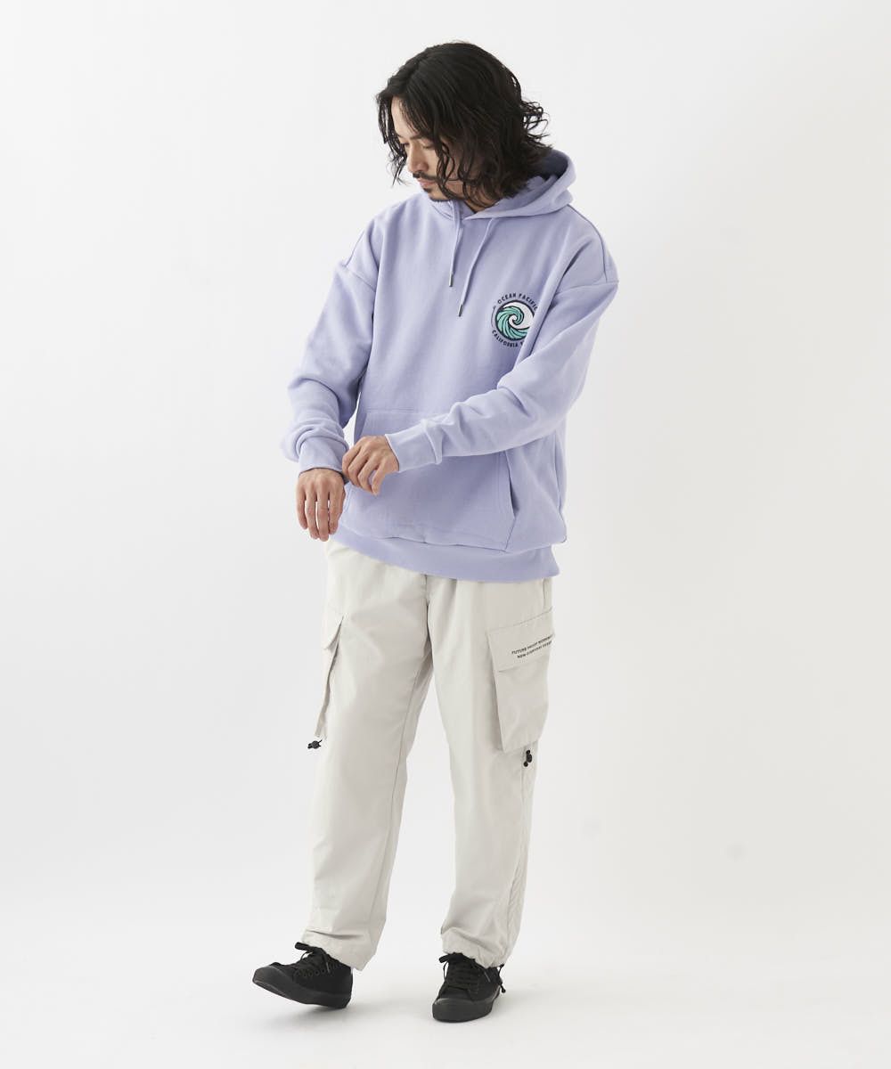 裏起毛のあったかプルパーカー。バックには立体感のあるサガラ刺しゅうで、波モチーフのデザインを施しました。
