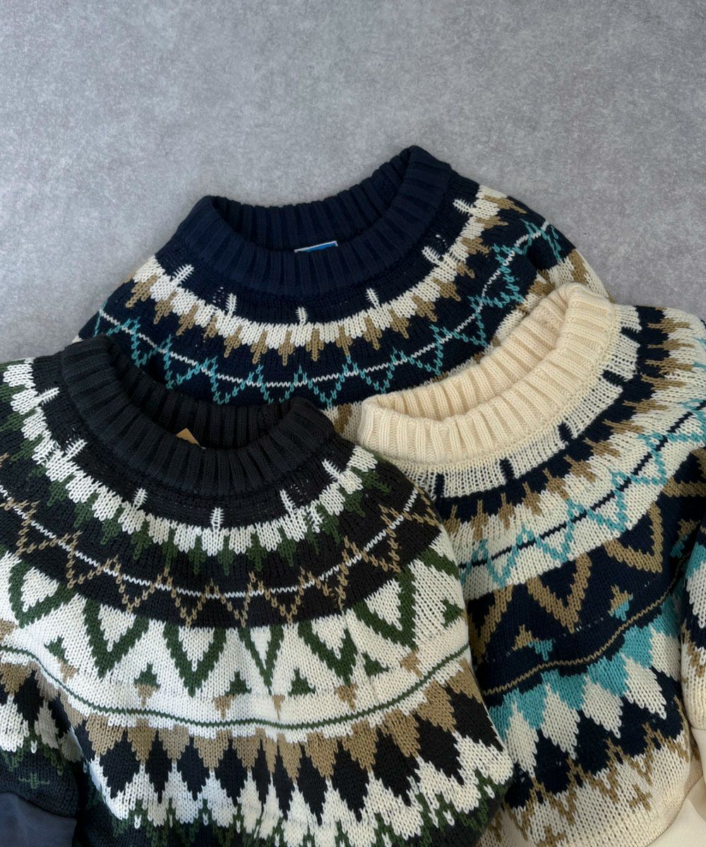 ユニセックスで使える、ノルディック風ニット。ノルディックの柄部分はニット素材で仕上げ、スウェットと異素材の組み合わせが楽しめるデザインです。上部分のみにノルディック柄をデザインすることで、メリハリを出しました◎秋冬に欠かせない、定番人気のほっこりとした暖かみのある1枚です。コーディネートの主役としてもこの冬おすすめの1枚。首周りはしっかりニットであったか♪おうちで洗えるのも嬉しいポイント!! 女性にもゆるっとルーズな着こなしがおすすめなので、おそろコーデやリンクコーデにもピッタリ!!