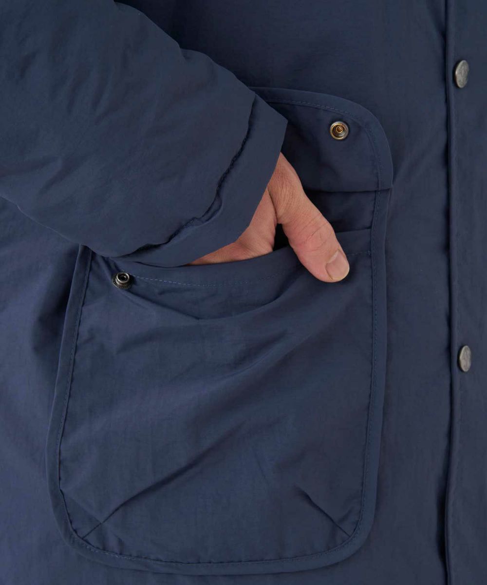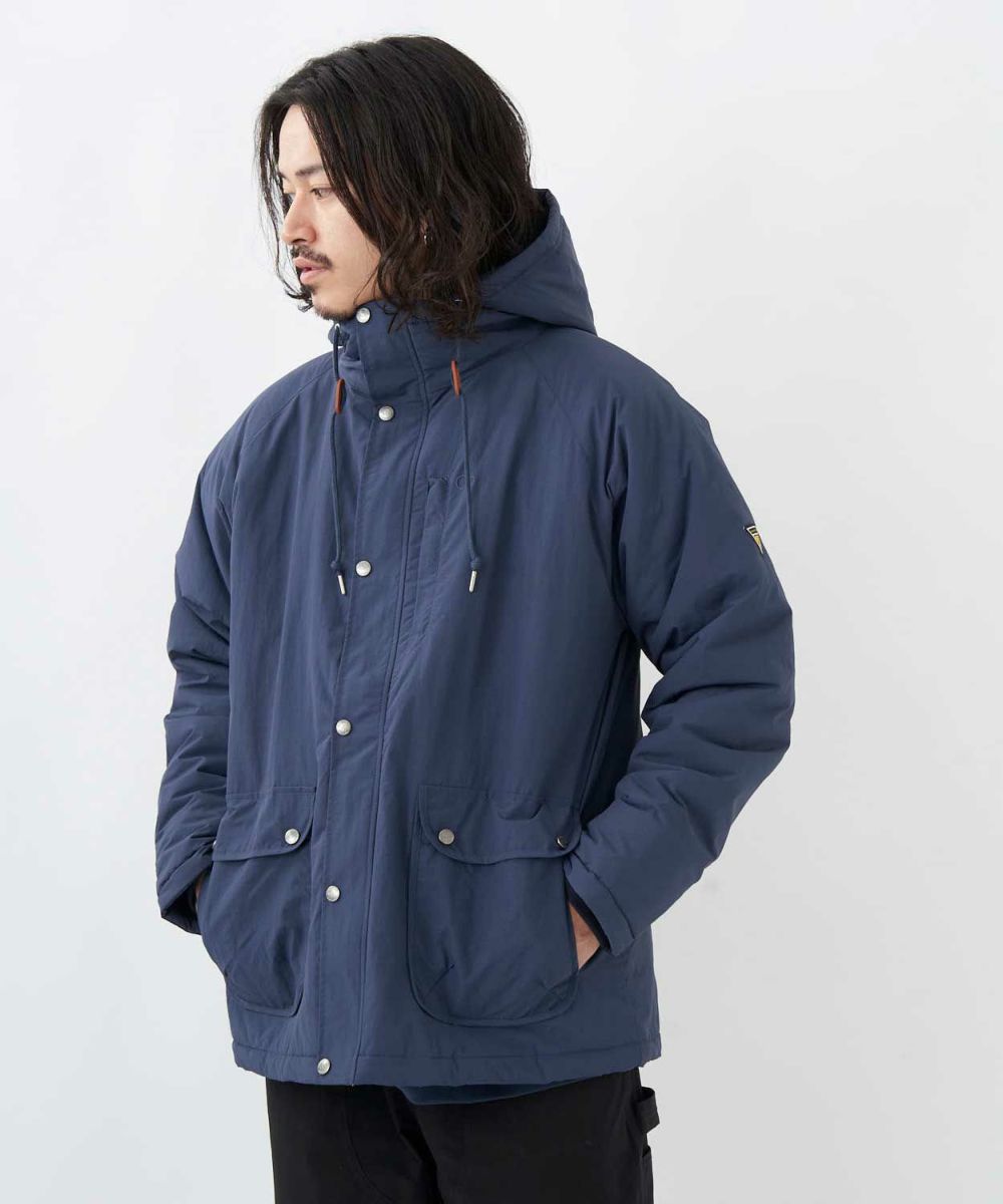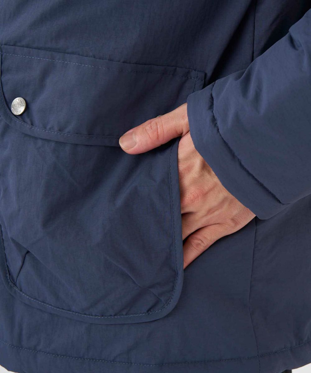 驚くほどの軽量で、着用時のストレスを感じにくいジャケットです。寒さ対策もばっちりできる中綿入り。ネイビーは単色でシンプルカジュアルに仕上げました。大きめのパッチポケットや胸のスライドポケットもアウトドアや街着でも便利!!