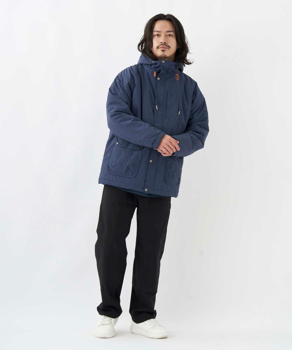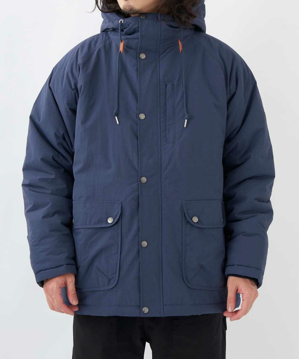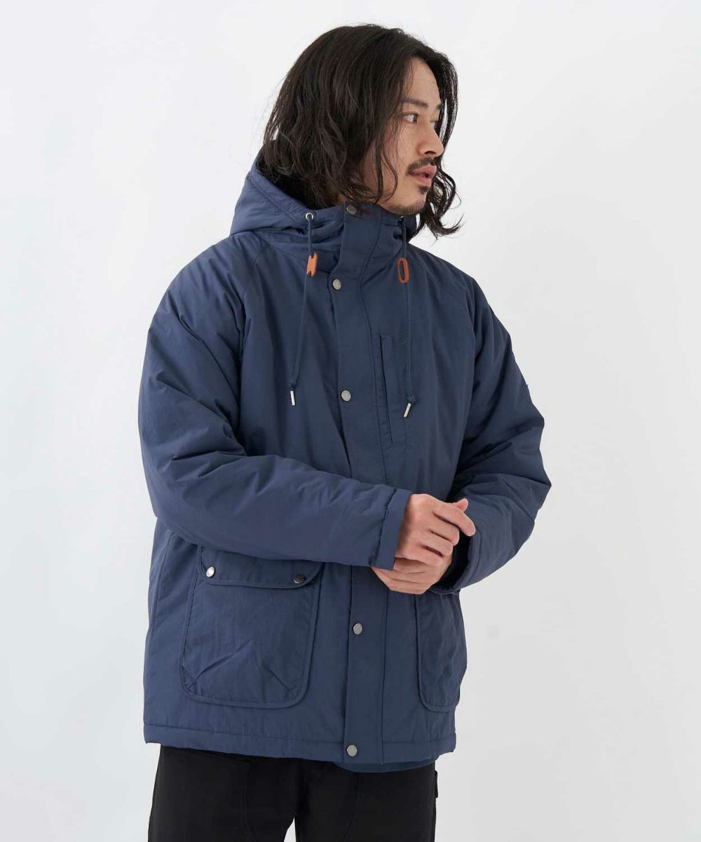 驚くほどの軽量で、着用時のストレスを感じにくいジャケットです。寒さ対策もばっちりできる中綿入り。ネイビーは単色でシンプルカジュアルに仕上げました。大きめのパッチポケットや胸のスライドポケットもアウトドアや街着でも便利!!