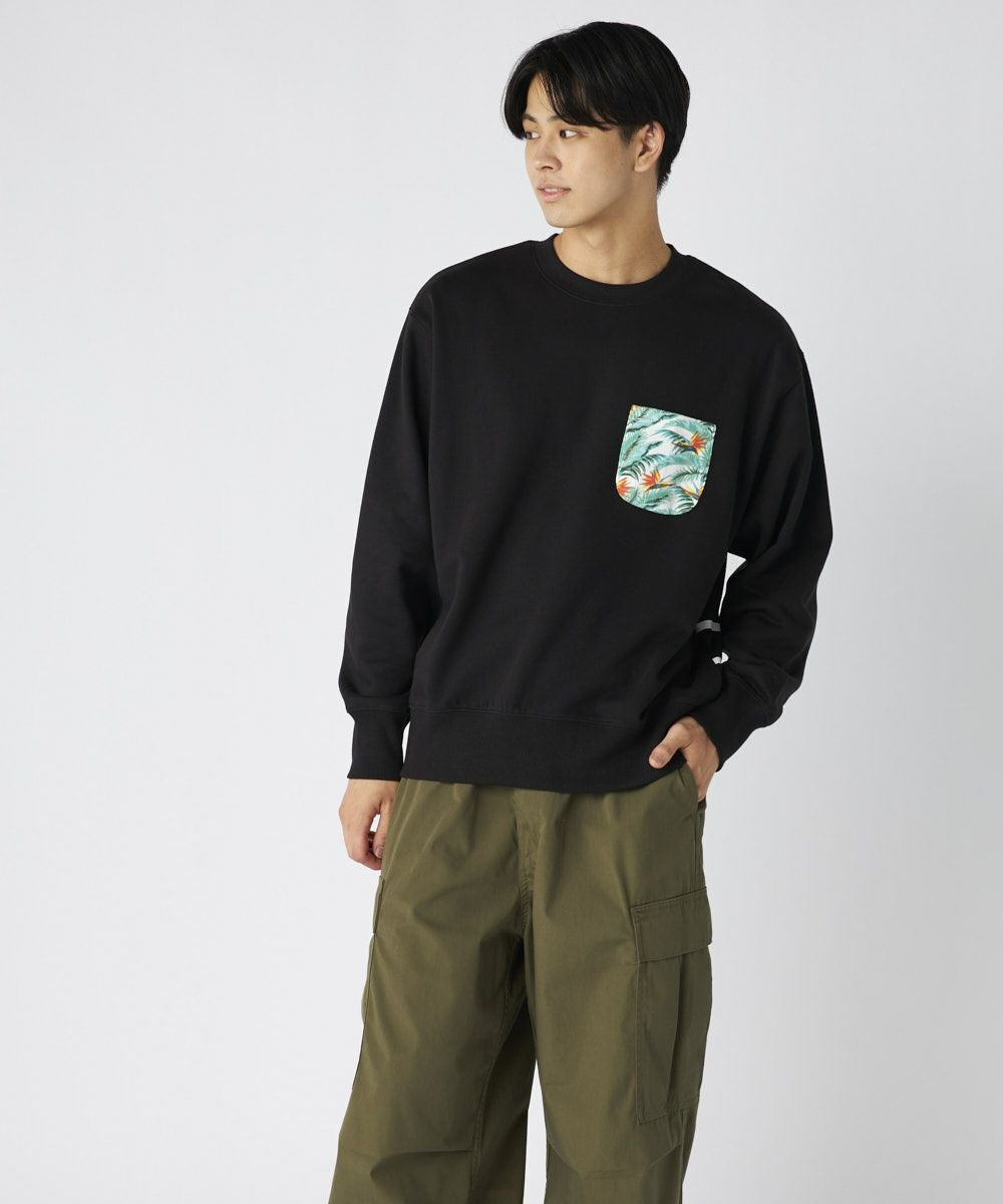 胸ポケットに総柄プリントをあしらった、遊び心のある裏起毛スウェット。