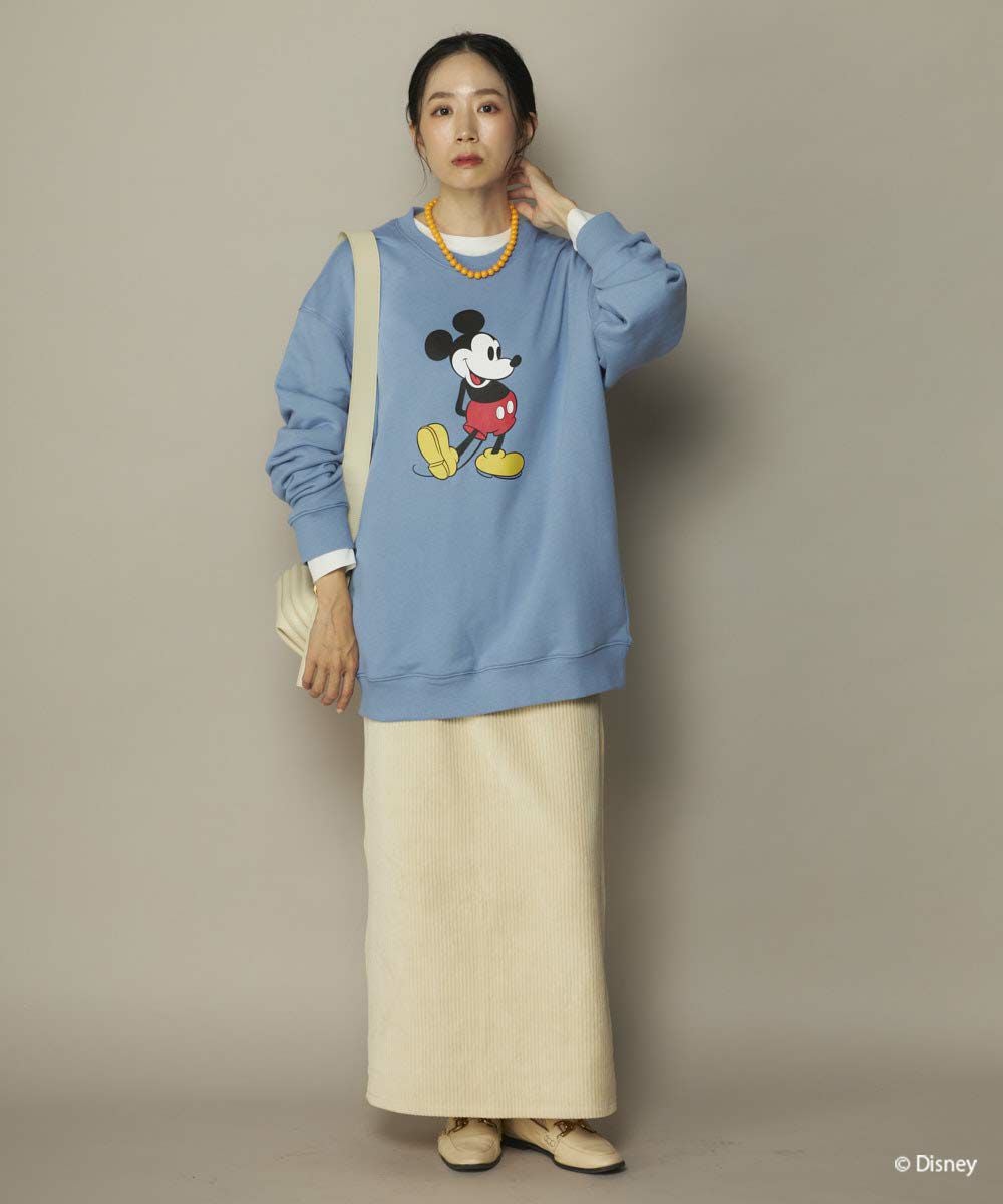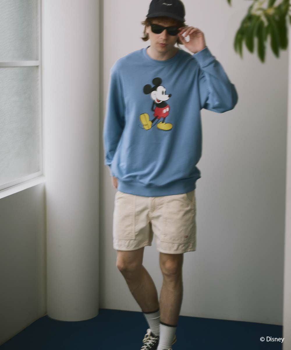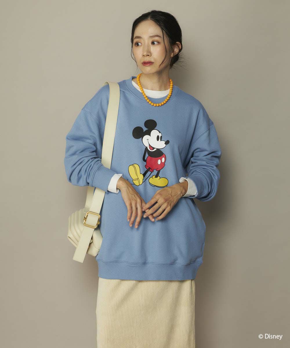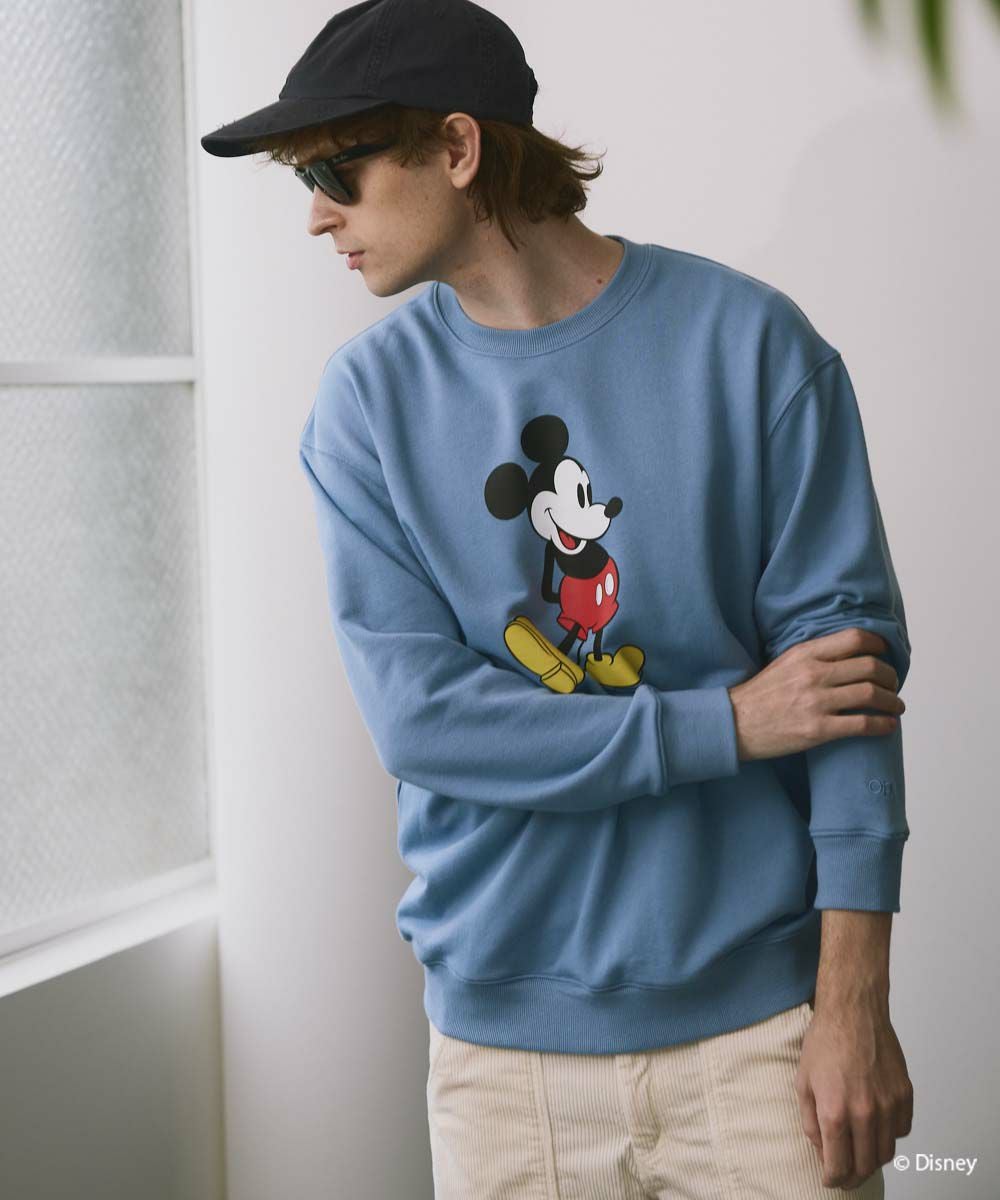 存在感のある大きなミッキープリントが目を惹く、ユニセックス仕様のクルースウェット。
