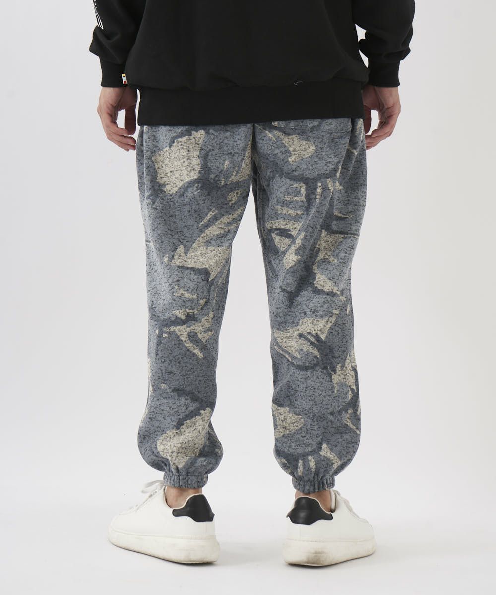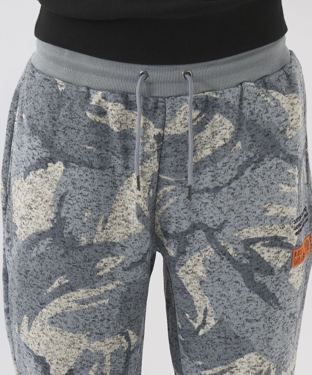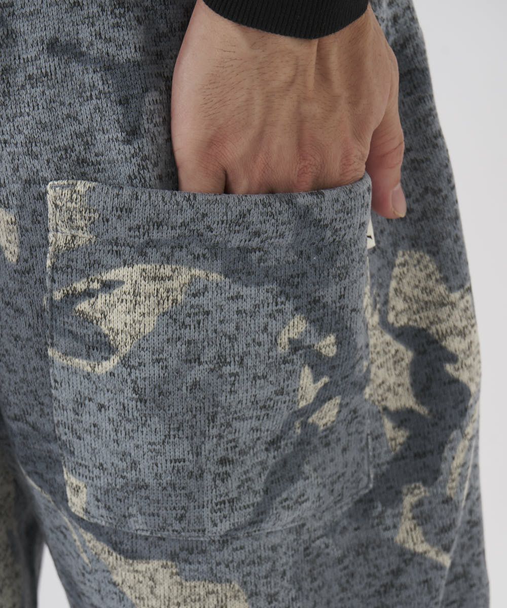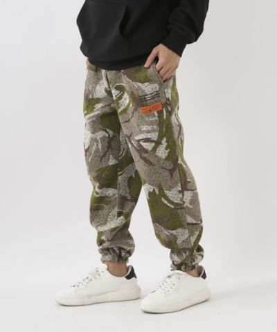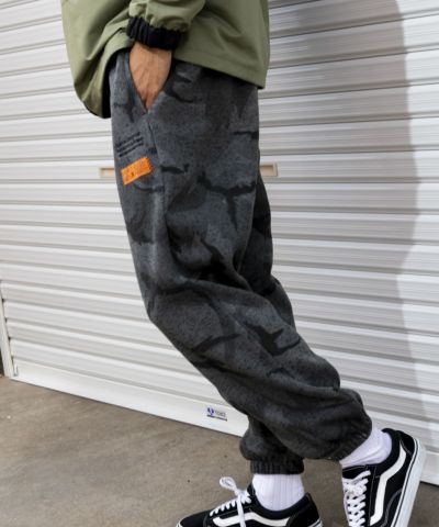 カモフラ柄が印象的なポリエステル100%ニットフリースパンツ。ゴムウエストで履き心地も楽ちん。部屋着はもちろん、タウンユースとしても幅広く活躍する一枚です。