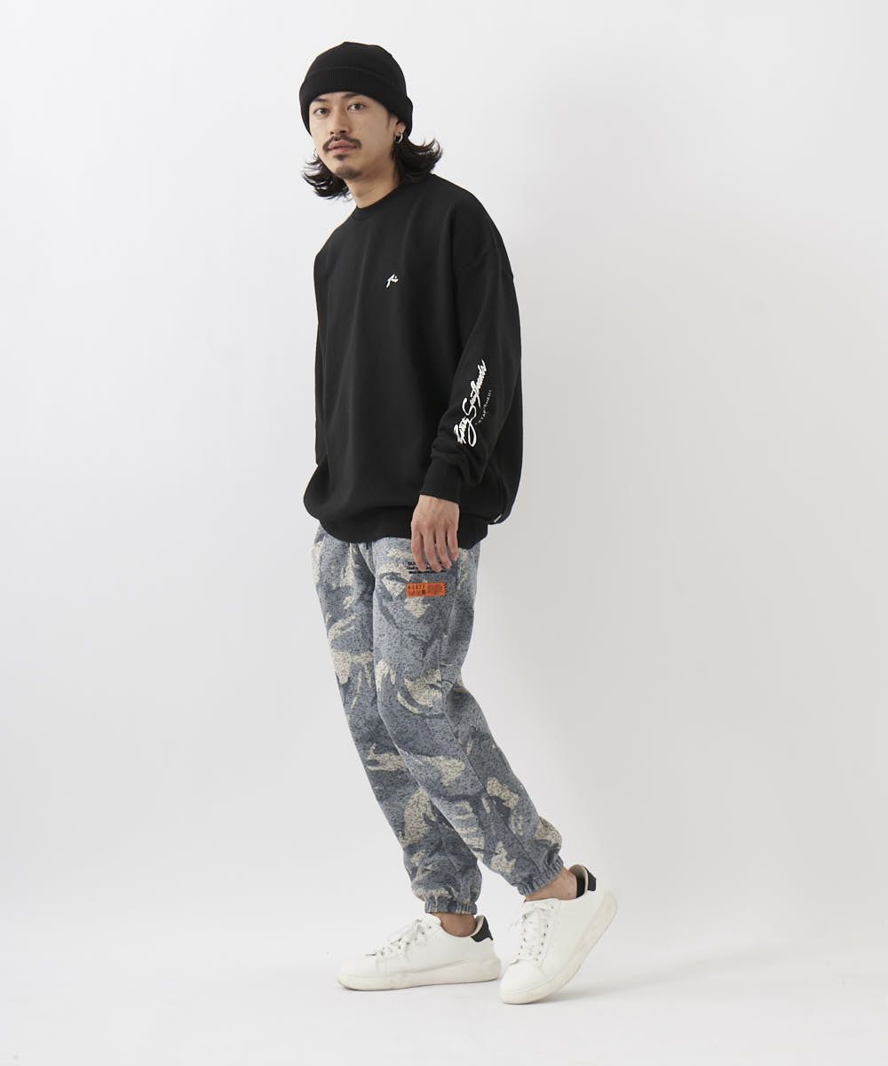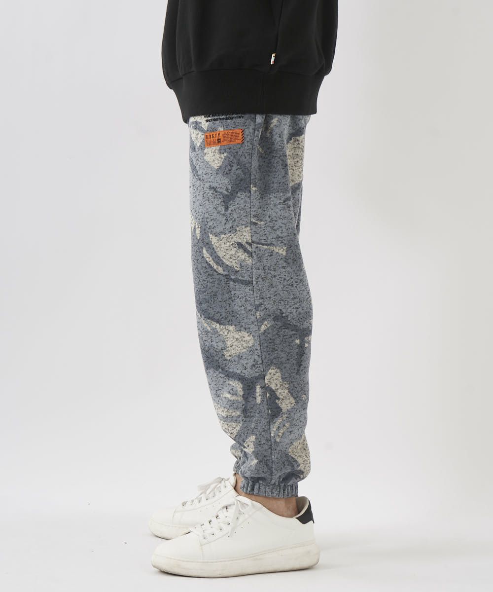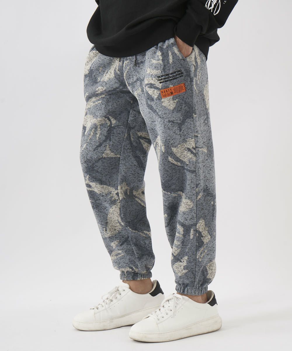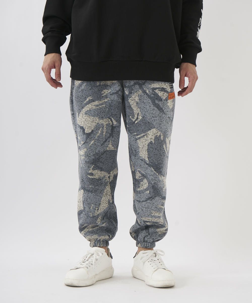 カモフラ柄が印象的なポリエステル100%ニットフリースパンツ。ゴムウエストで履き心地も楽ちん。部屋着はもちろん、タウンユースとしても幅広く活躍する一枚です。