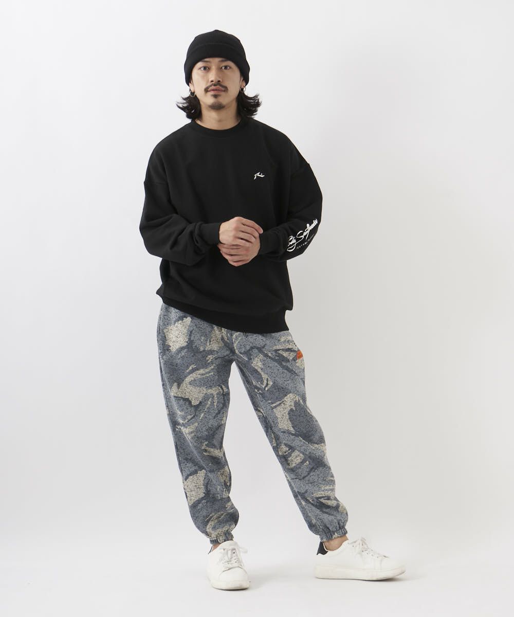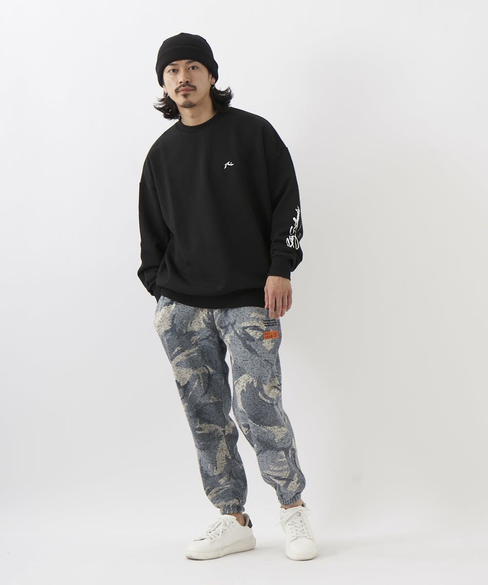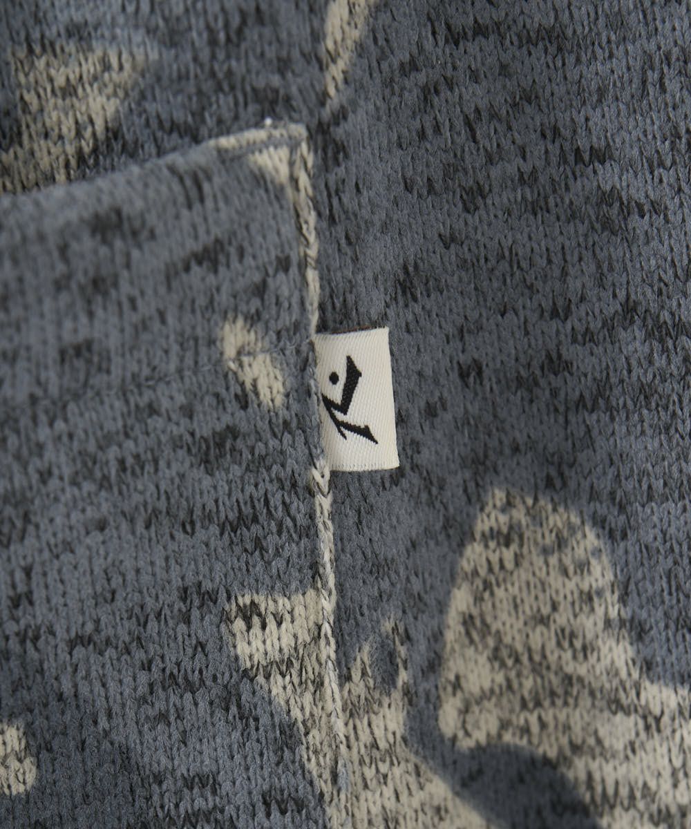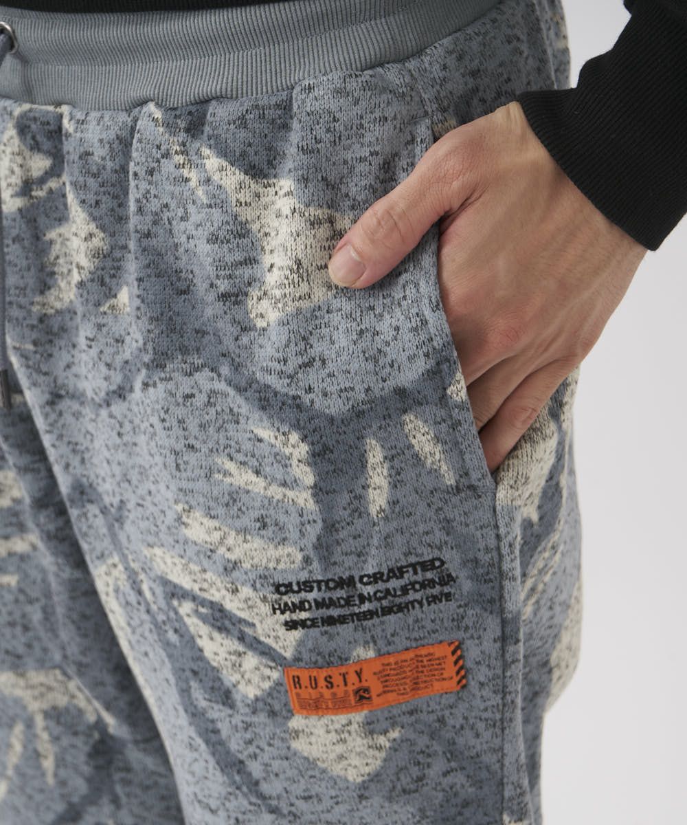 カモフラ柄が印象的なポリエステル100%ニットフリースパンツ。ゴムウエストで履き心地も楽ちん。部屋着はもちろん、タウンユースとしても幅広く活躍する一枚です。