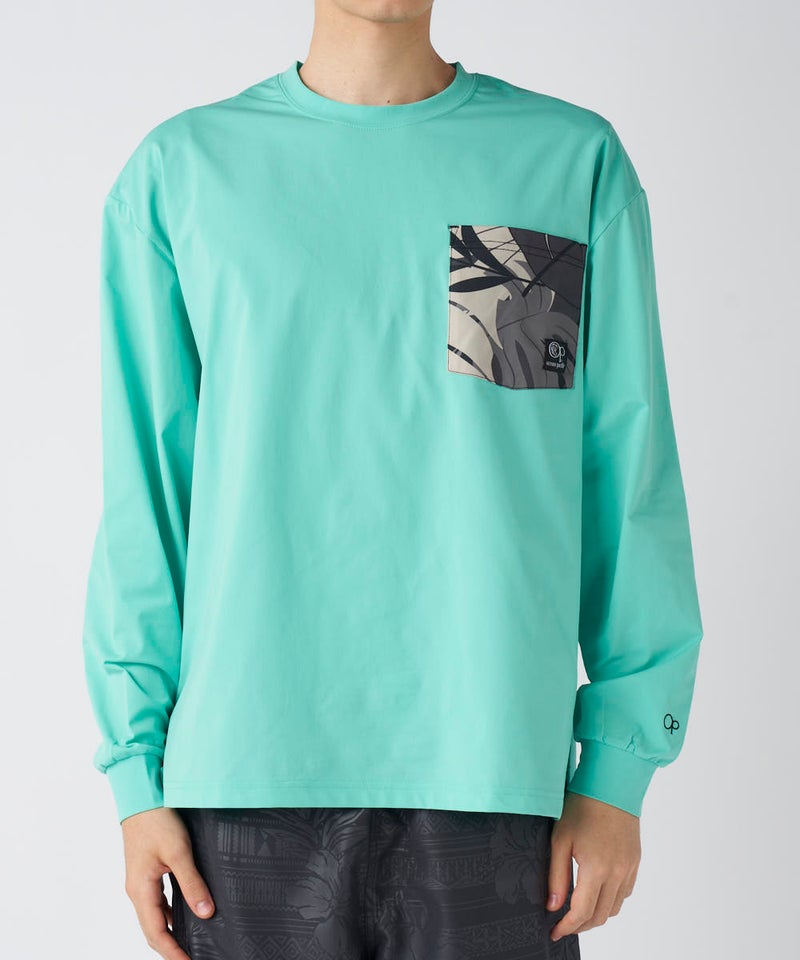 PEARTEX素材のUVロンT。水陸両用で吸汗速乾・UPF50+対応、軽量でソフトな肌触り。 フロント胸ポケットにシーズンテーマのリーフ柄を配置し、機能性とデザイン性を両立した一枚