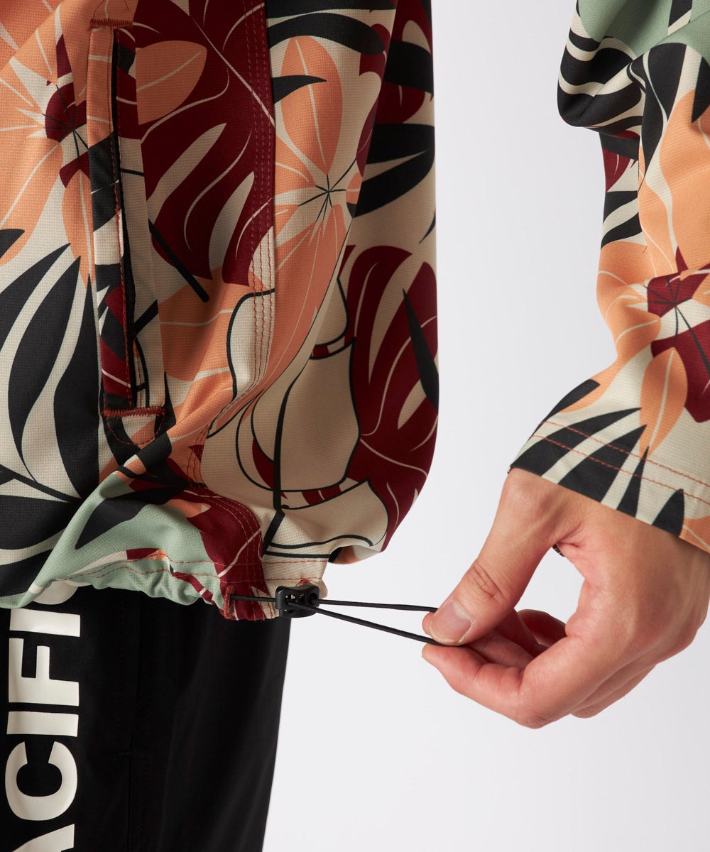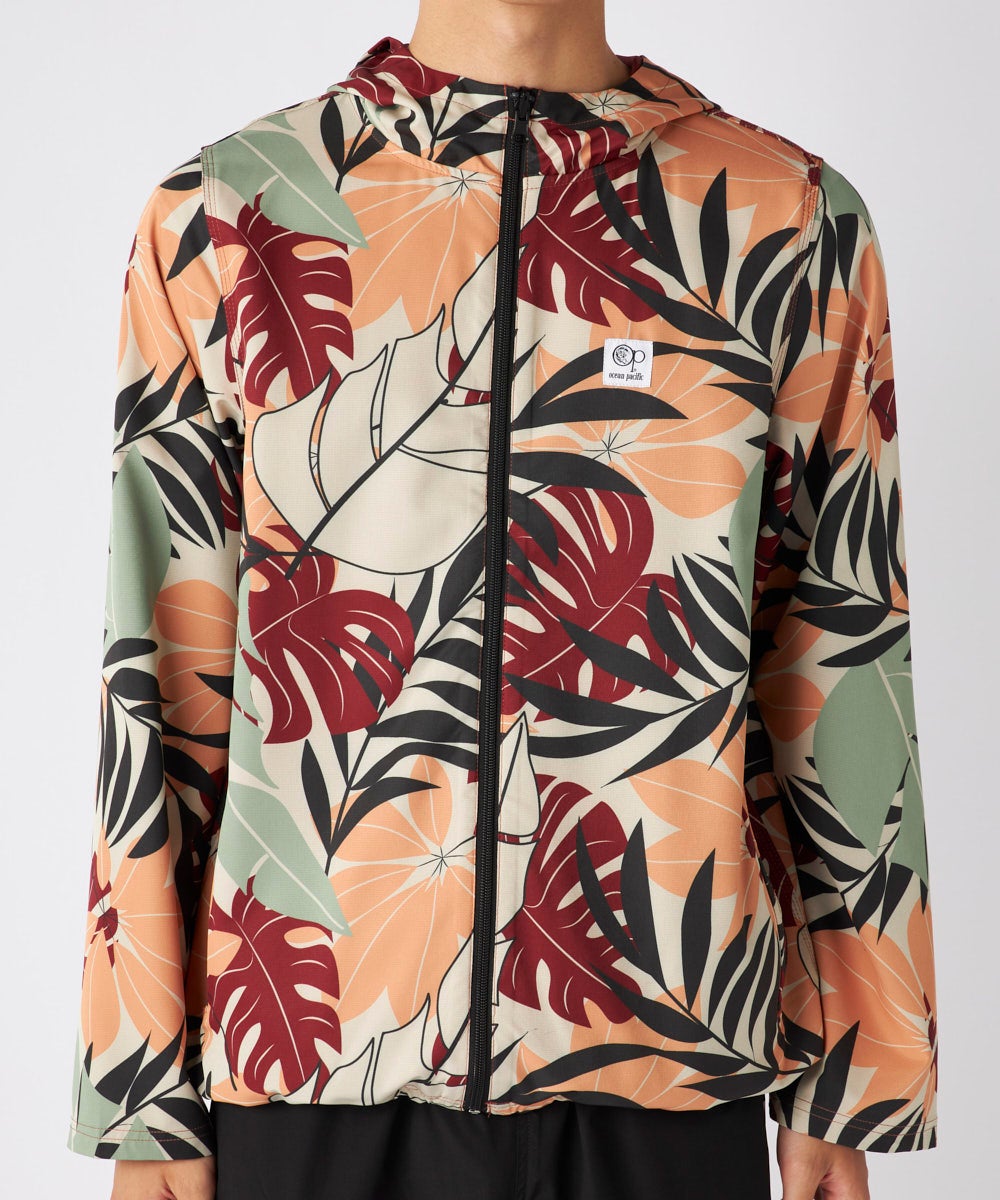 リバーシブルデザインのメンズ長袖UVジップパーカー。 ストレッチ素材で動きやすく、片面にはシーズンテーマのリーフ柄を配置し、機能性とデザイン性を両立させた 一枚です