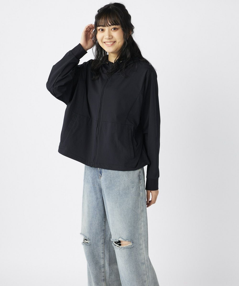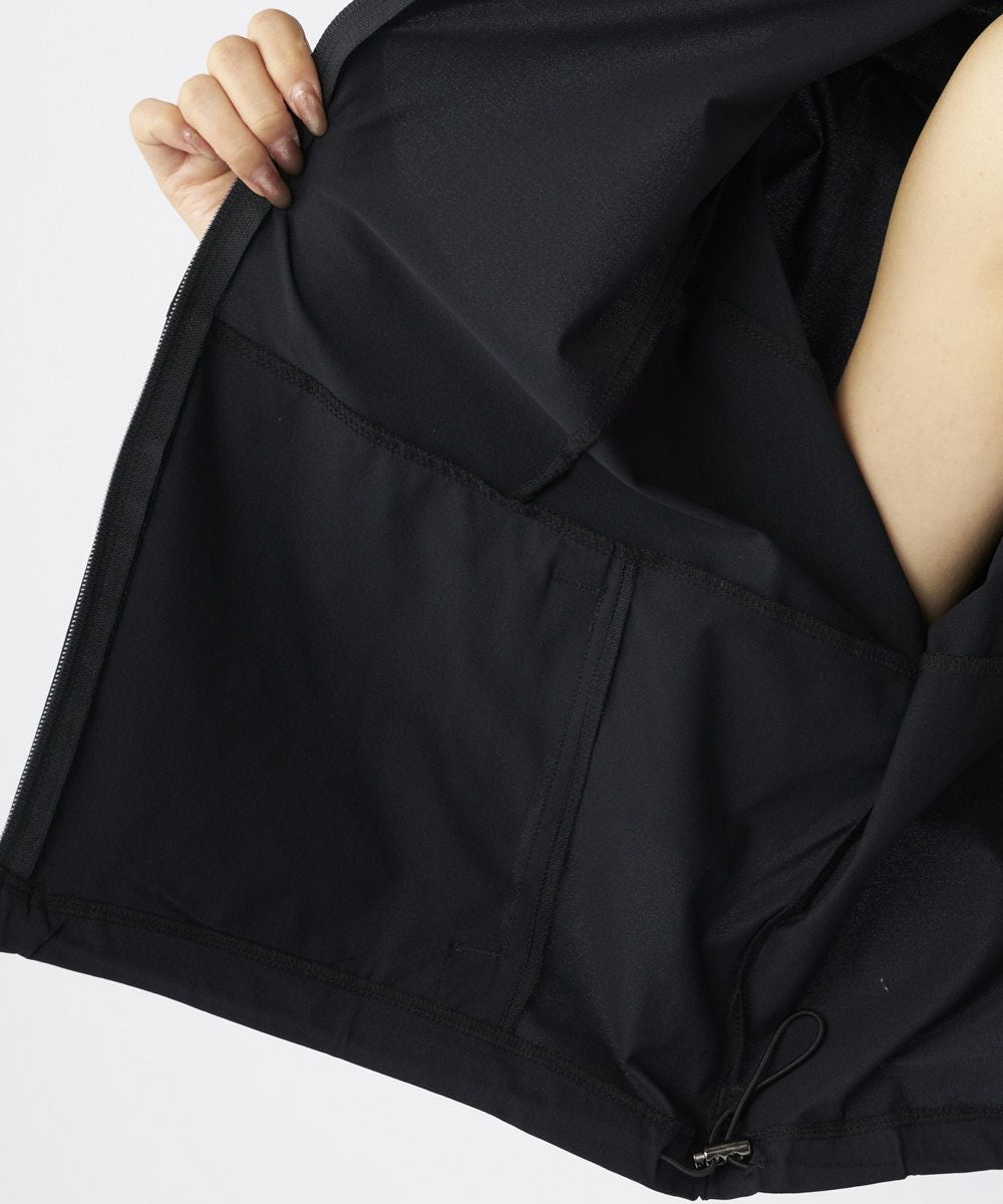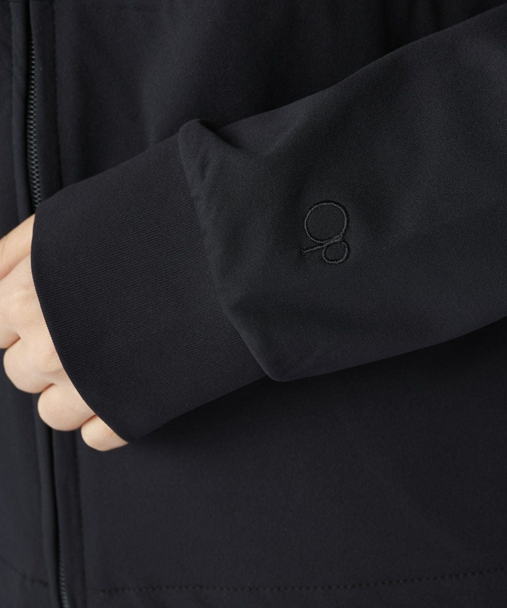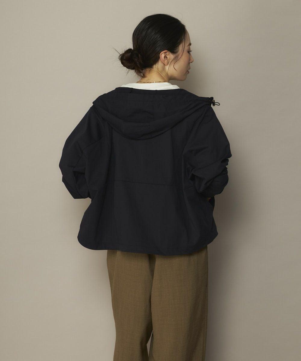ハイネックフードにドローストリングコードがつき、裾口にもコードがついている仕様で、シルエットをお好みに合わせて変えられます。