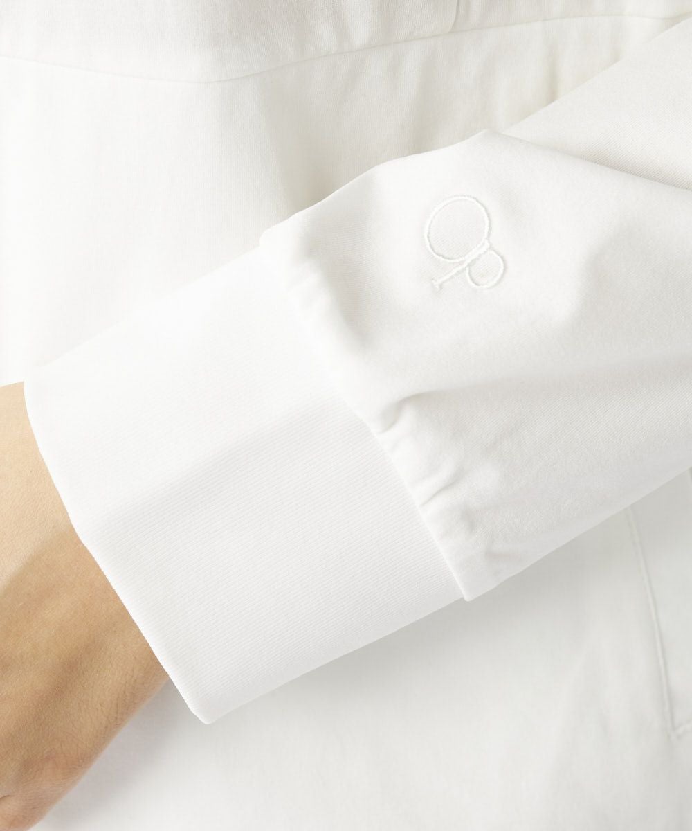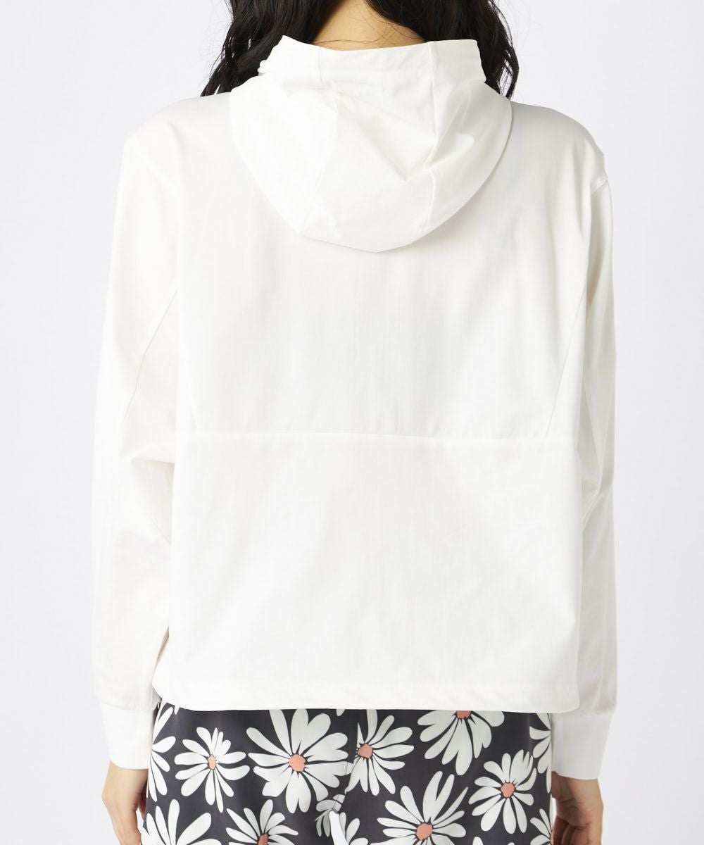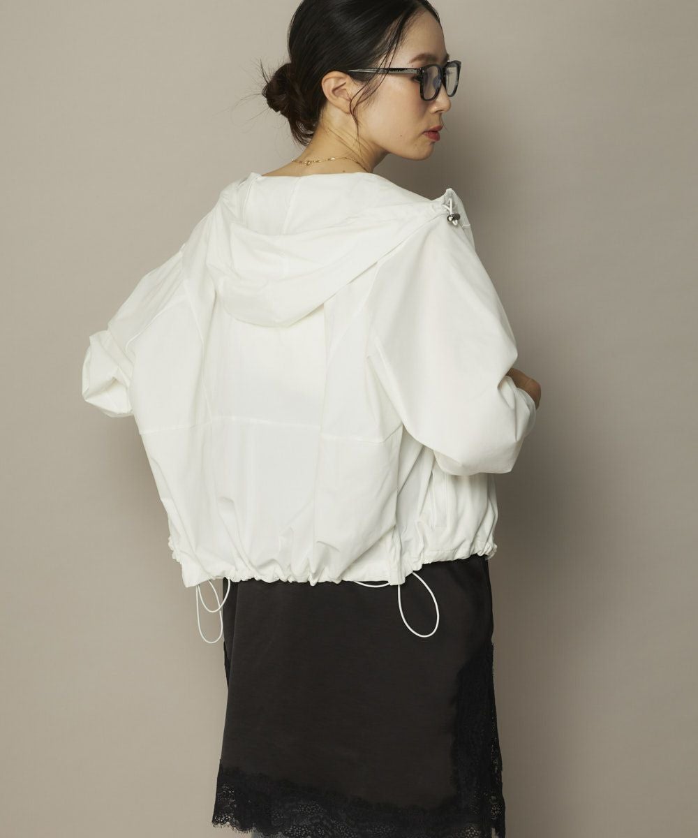 ハイネックフードにドローストリングコードがつき、裾口にもコードがついている仕様で、シルエットをお好みに合わせて変えられます。