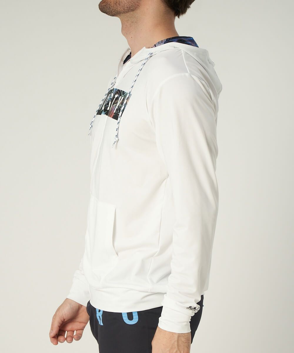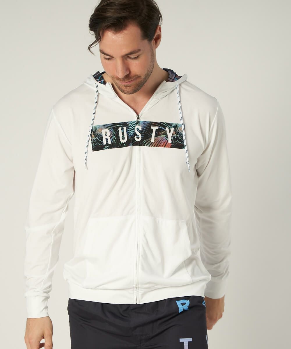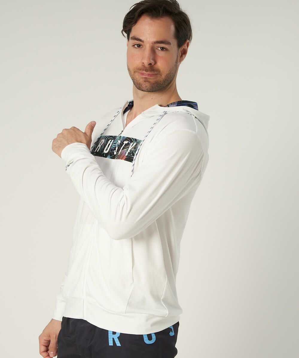 タウンでもレジャーでもOKなソフトタッチのスムースハイブリッドラッシュパーカーハイブリッド、UVCUTトランクスとリンクコーデがオススメ