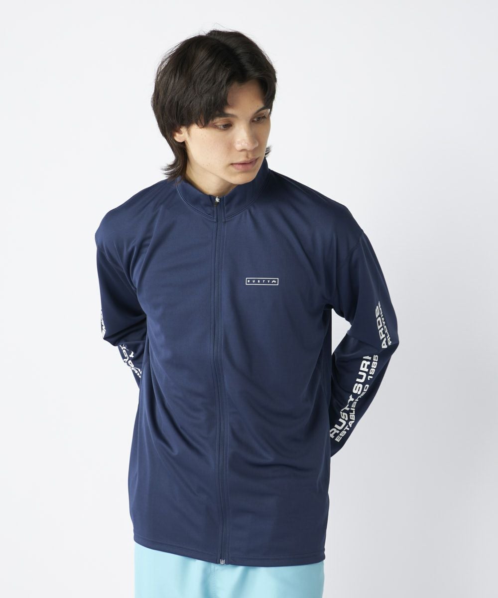 フロントにはシンプルな「RUSTY」ロゴが施され、両袖にはブランドのアイデンティティを感じさせるプリントがアクセントになっています。