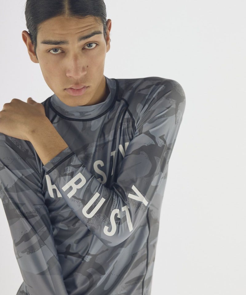 ポリエステル2WAY素材を使用した迷彩総柄のラグランデザイン。 胸にブランドのロゴをプリントした長袖ハイネックプルオーバーラッシュガード。