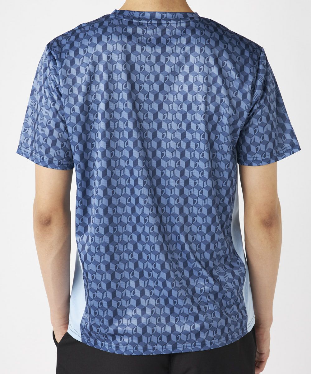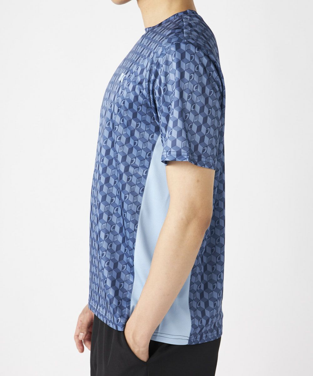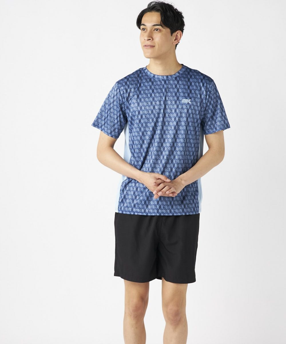 脇の切り替えがシルエットをすっきりと見せてくれる接触冷感生地のTシャツ。パリから届いたMCが散りばめ られた総柄がスポーティーながらもクールな印象の一枚で決まるアイテムです。