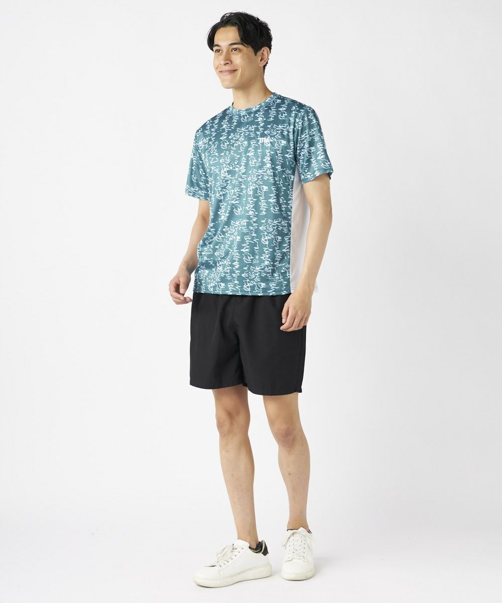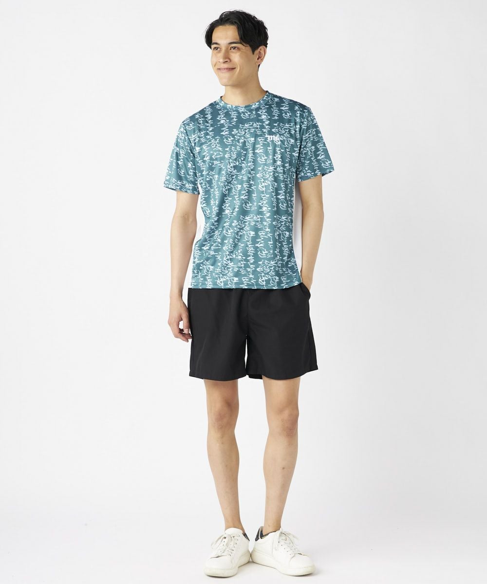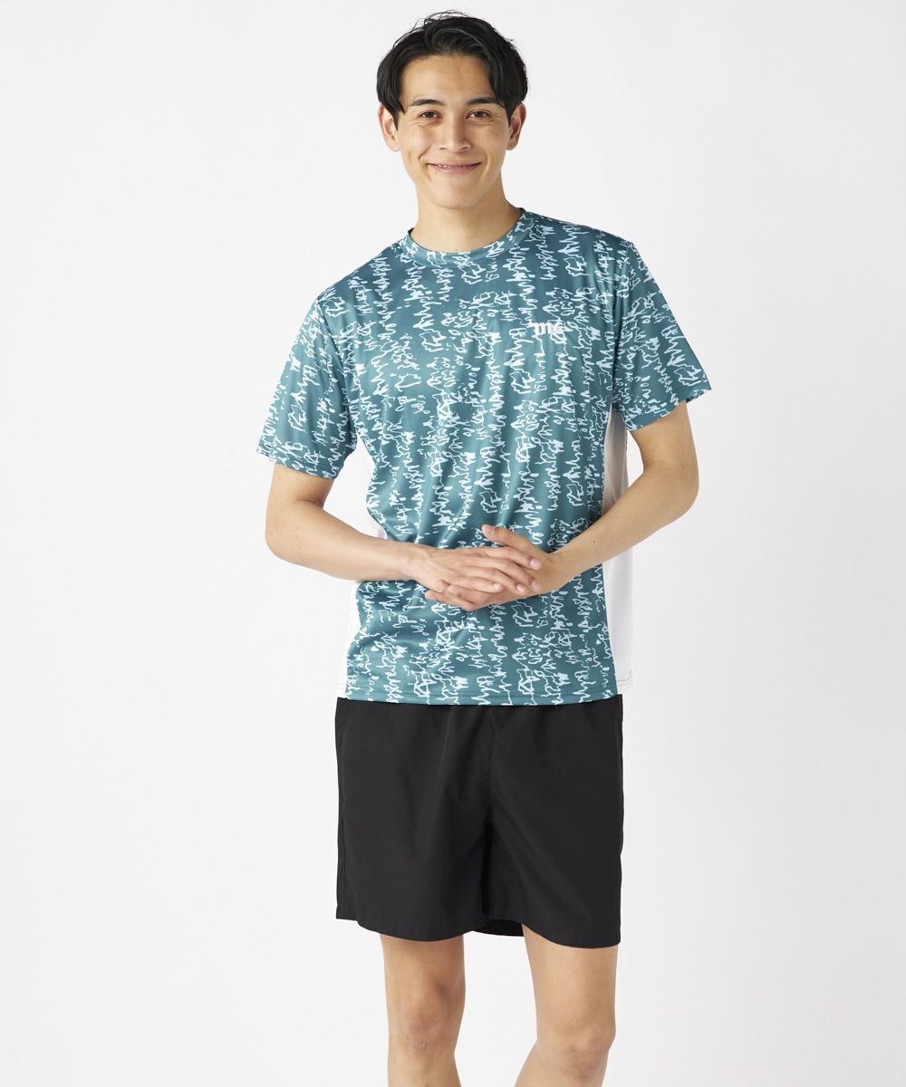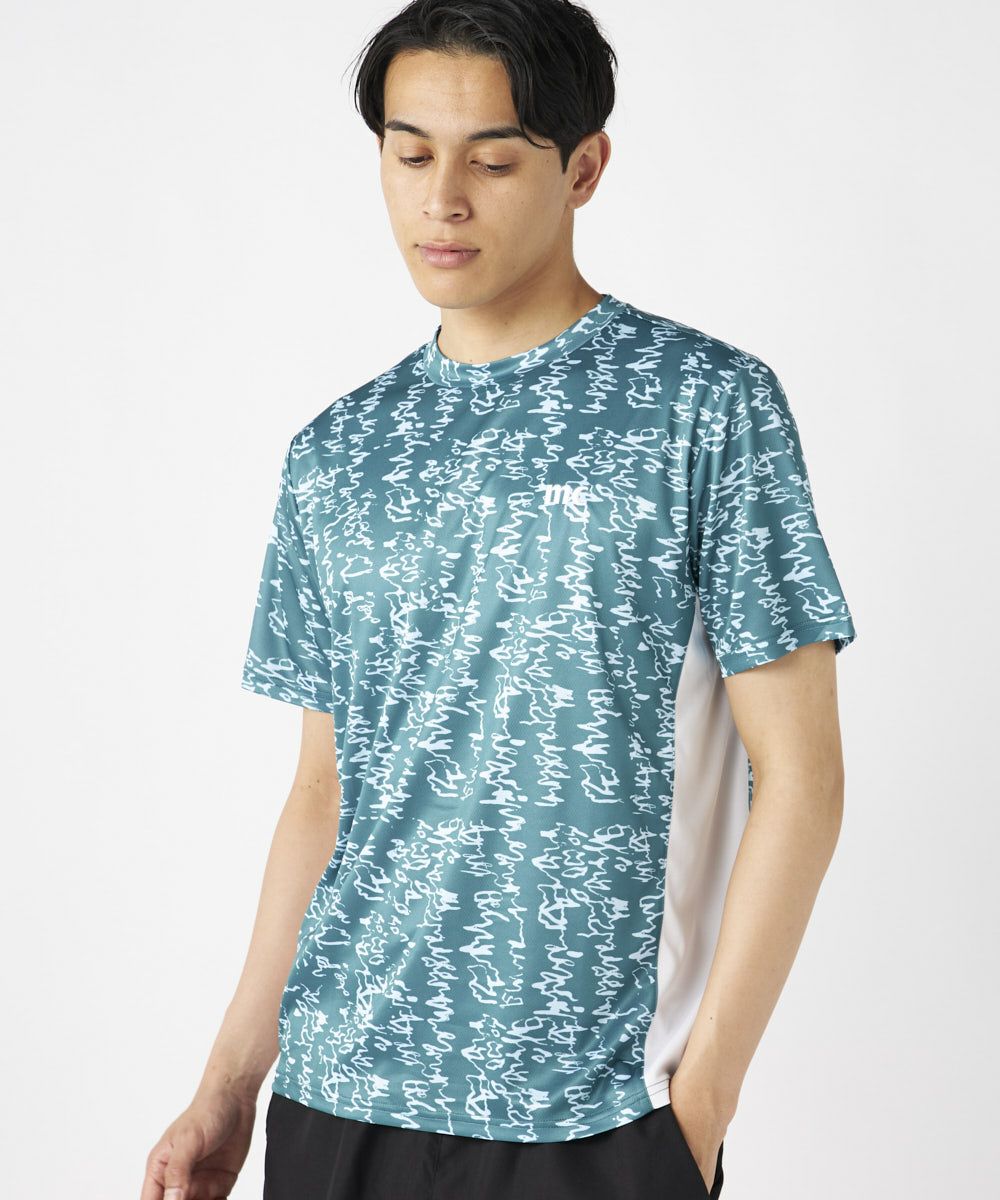 脇の切り替えがシルエットをすっきりと見せてくれる接触冷感生地のTシャツ。パリから届いた他には無いオシ ャレな総柄がコーディネートの主役に間違いなしのアイテムです。
