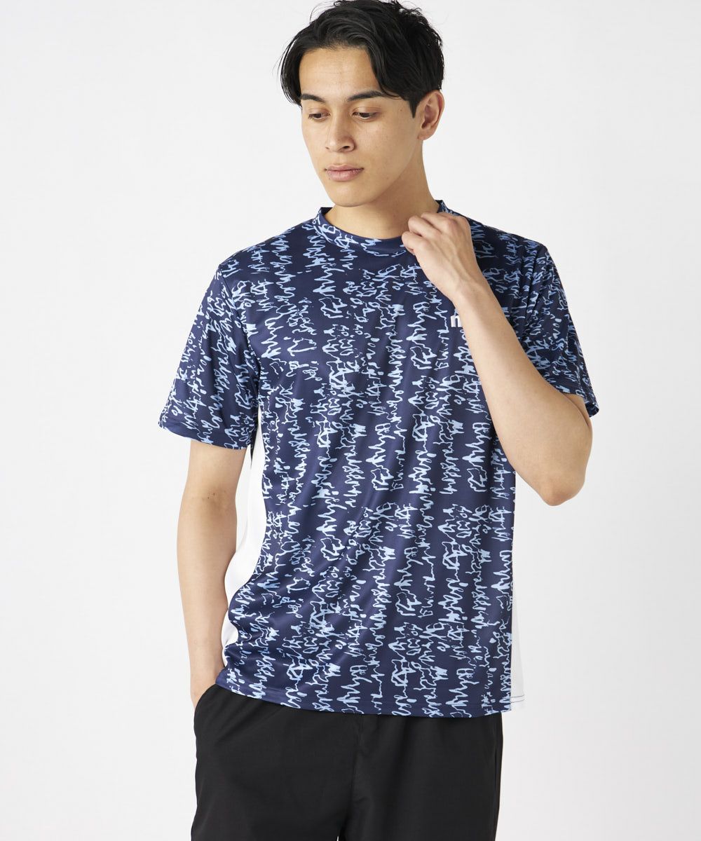 脇の切り替えがシルエットをすっきりと見せてくれる接触冷感生地のTシャツ。パリから届いた他には無いオシ ャレな総柄がコーディネートの主役に間違いなしのアイテムです。