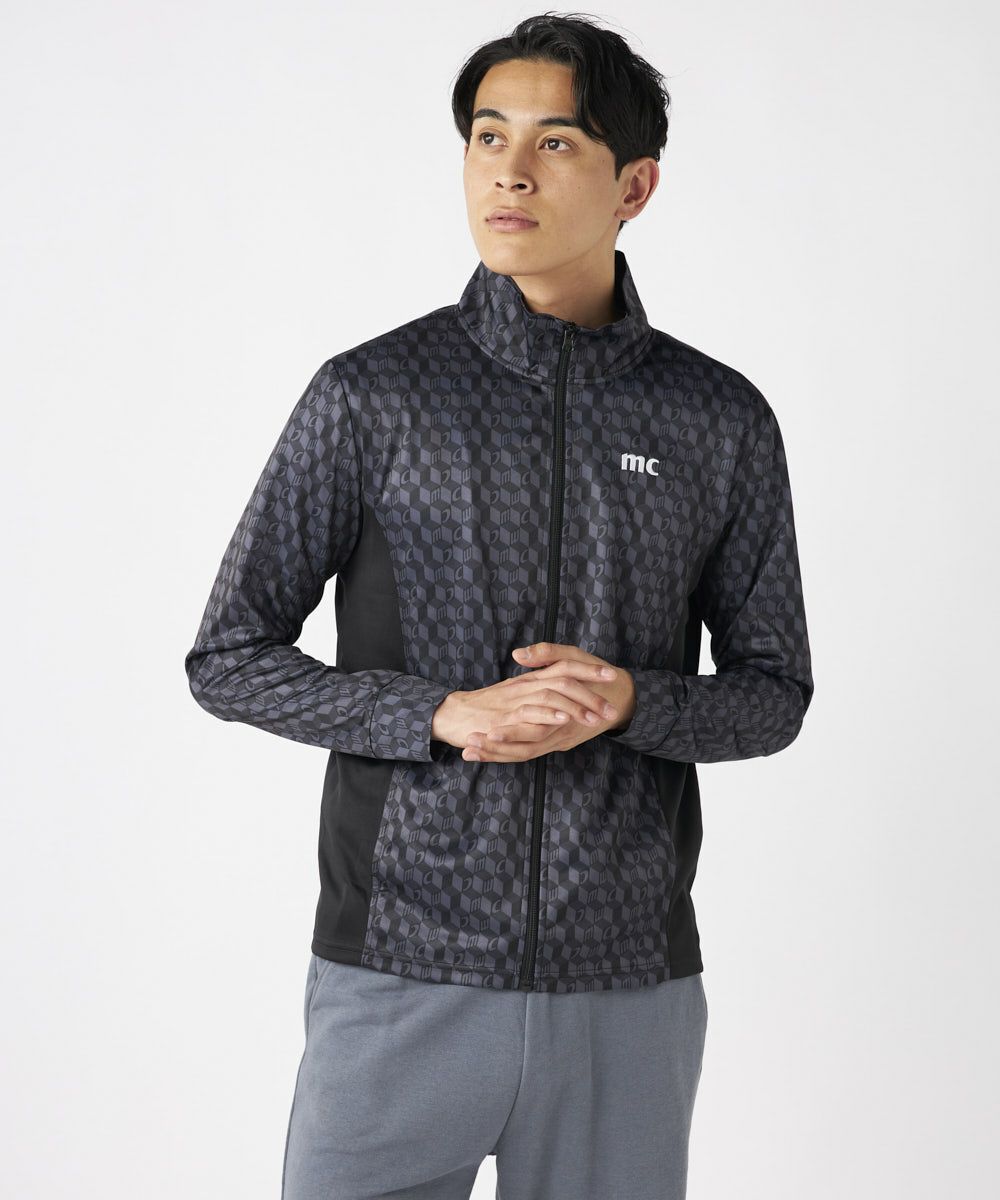 脇の切り替えがシルエットをすっきりと見せてくれる長袖のUVジャケット。衿も高めの設定なのでメンズも気 になる首元の紫外線をしっかり対策してくれます。パリから届いたMCが散りばめられた総柄がスポーティーな がらもクールな印象を与えてくれます。