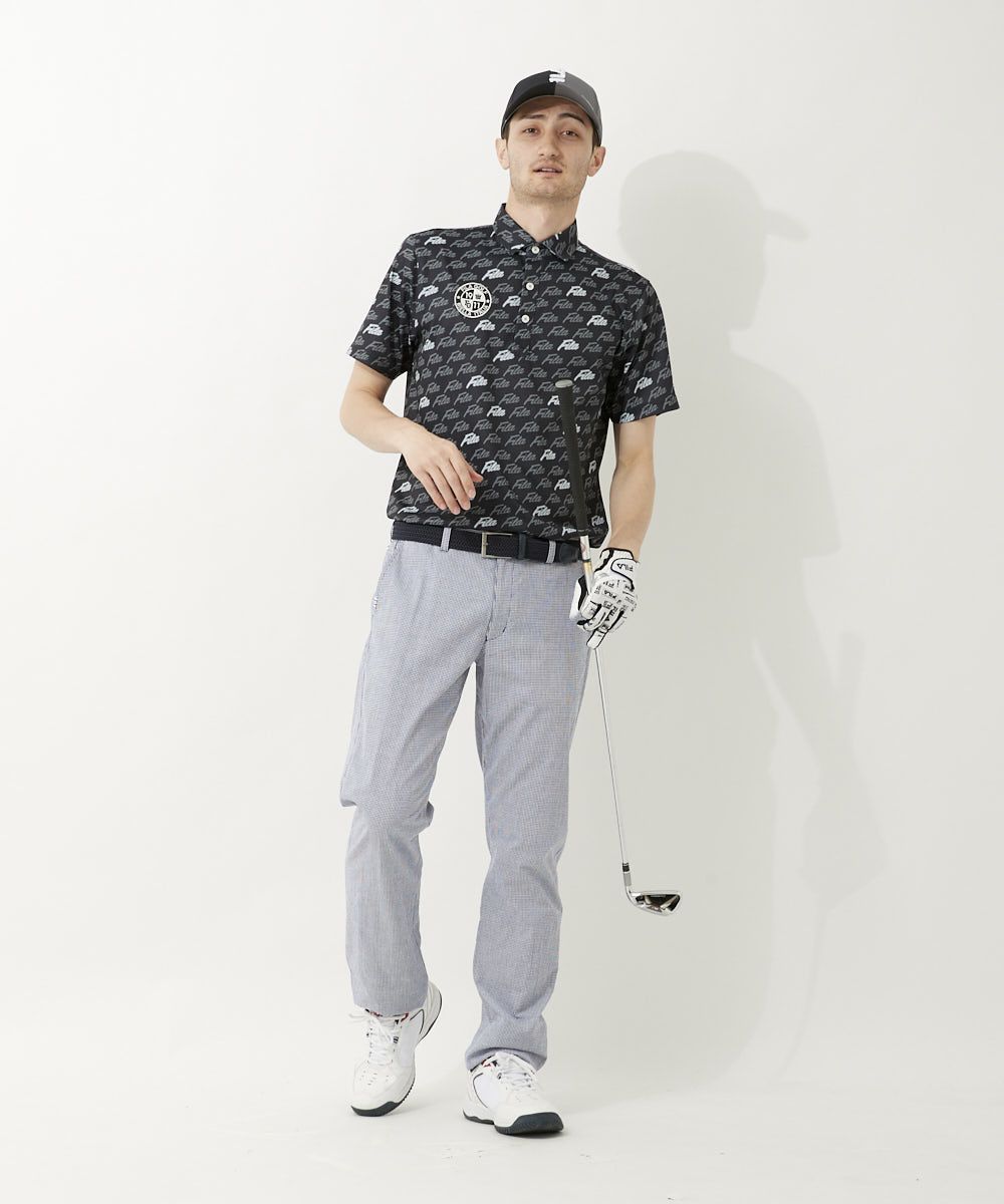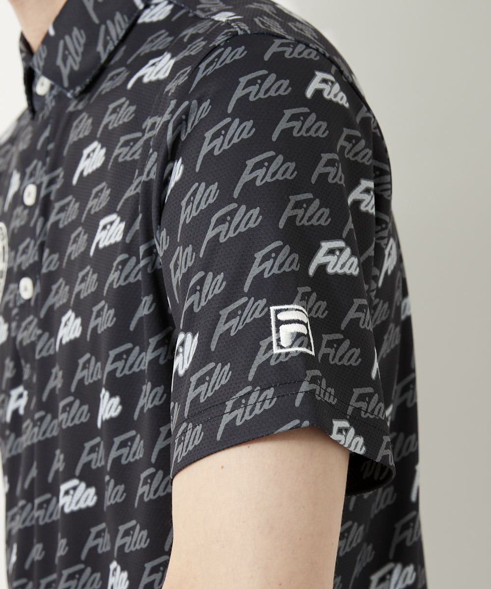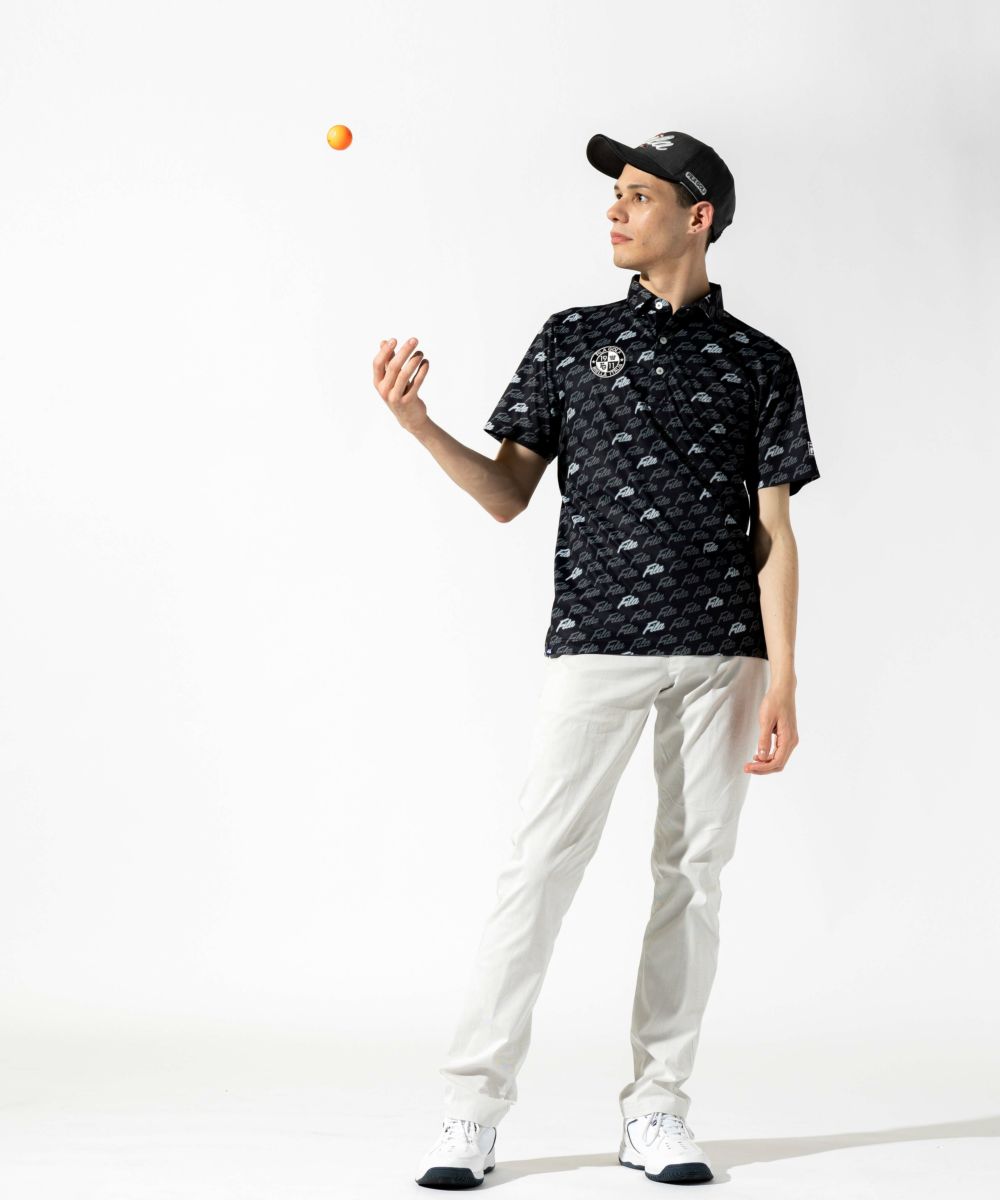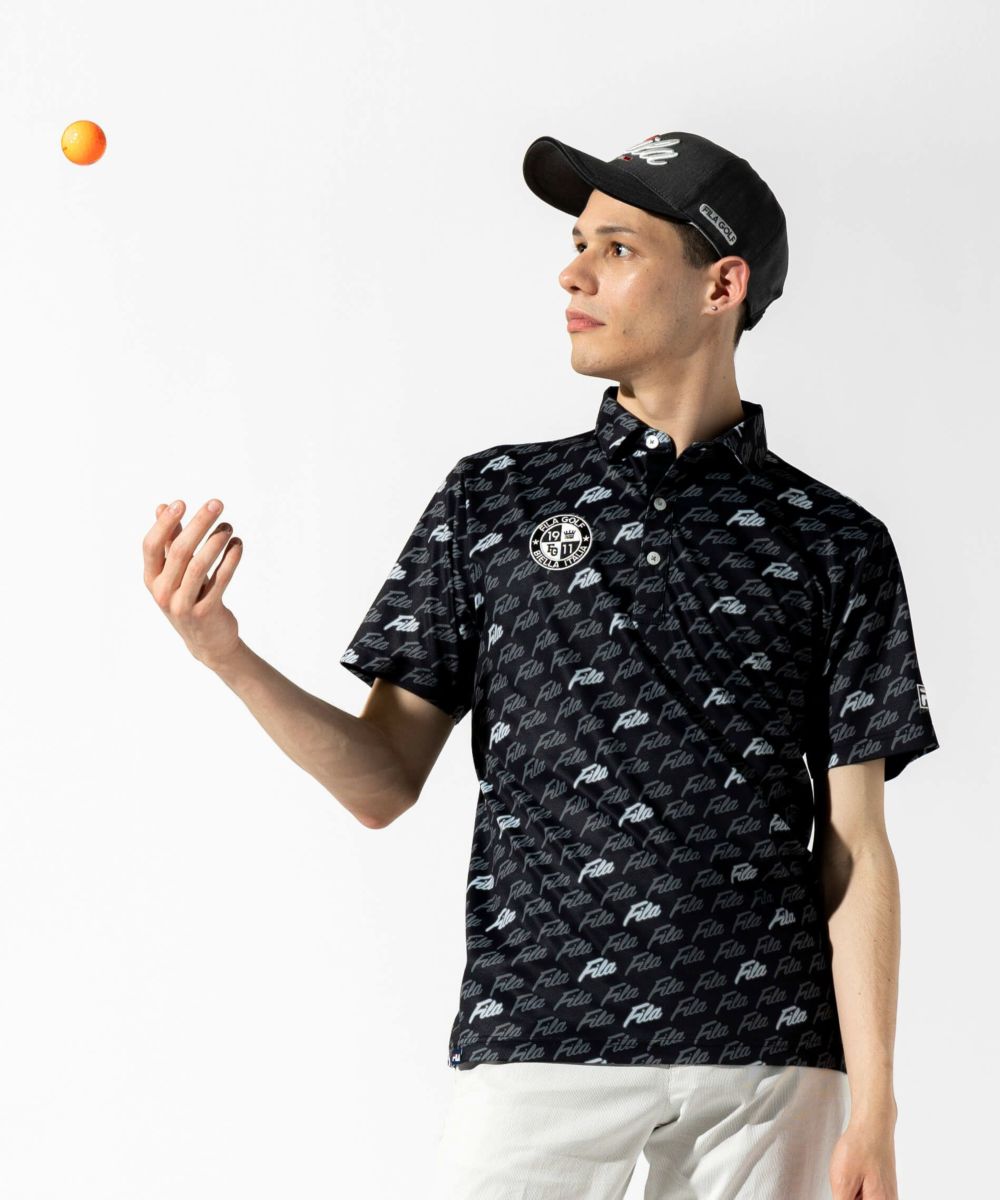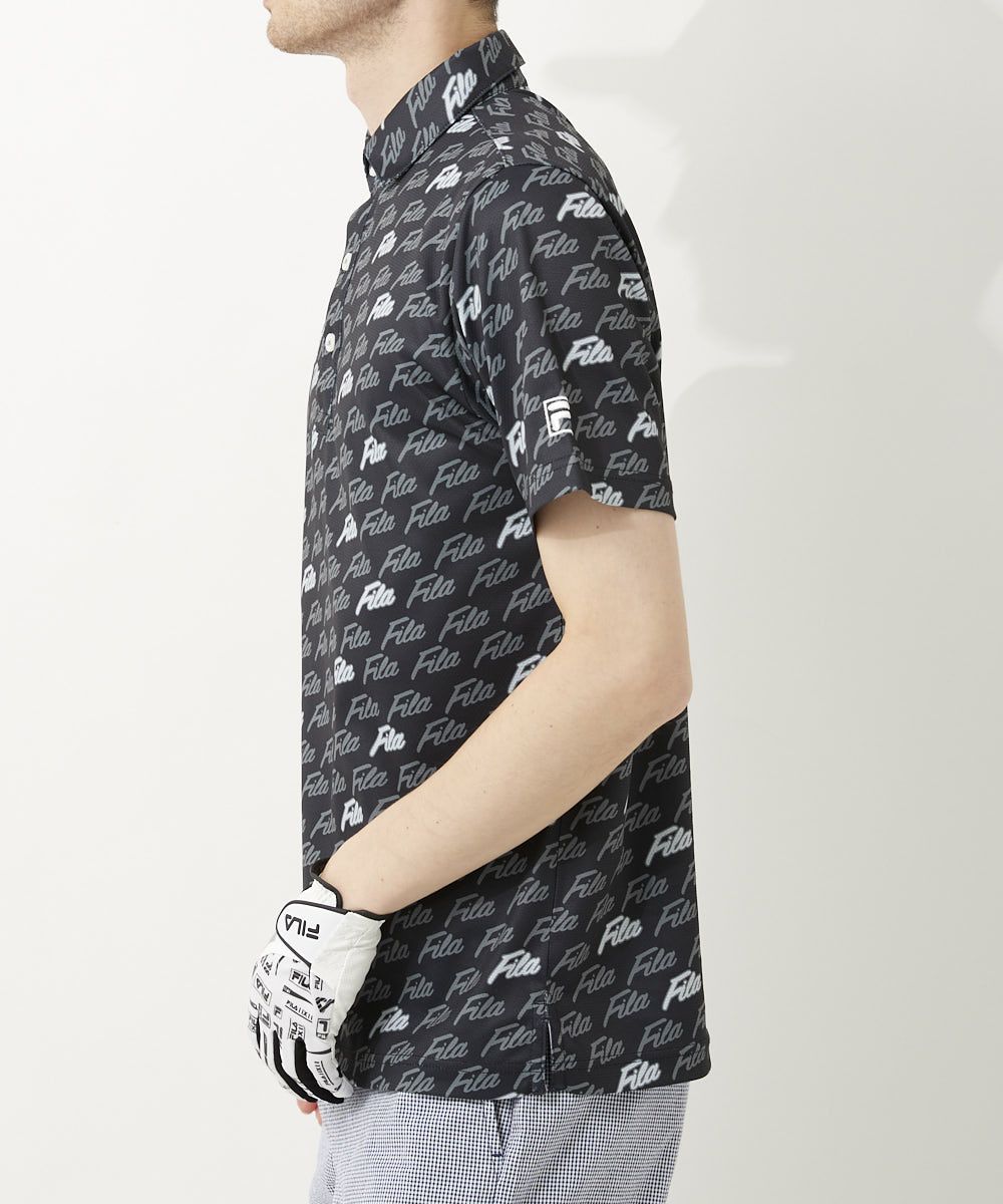 エコに配慮したリサイクル素材を使用した半袖シャツ。ホリゾンタルカラー仕様。FILA GOLFらしいPOPな筆記体ロゴプリントがポイント。裾にスリットを付けて着用時にお腹周りのシワを軽減させます。