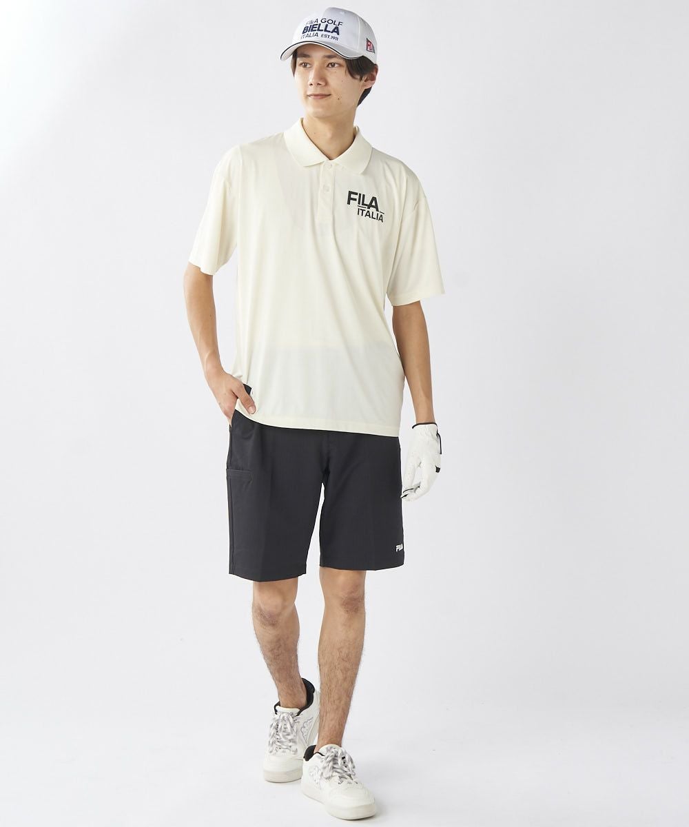 バックプリントがかっこいいポロシャツ。サラッとした素材で、接触冷感機能付き。夏ゴルフも快適に楽しめます。シンプルなデザインなので、ボトムスを選ばず着まわしもきくアイテムです。
