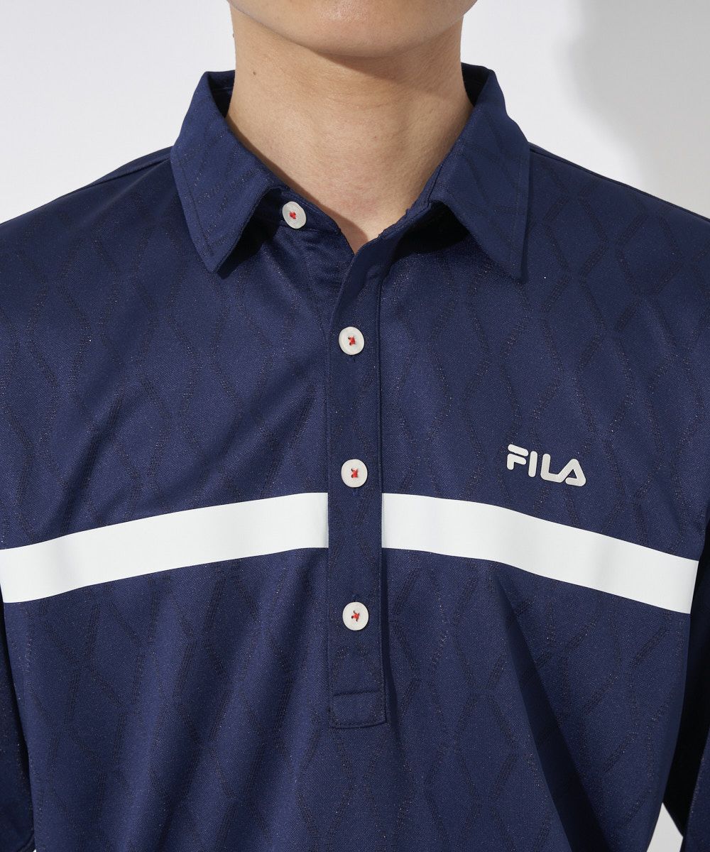 エコに配慮したリサイクル素材を使用。 格子柄をマット系と光沢糸で表現したジャガード素材のシャツ。胸のラインプリントがアクセントとなり、袖付け部分はスイングしやすい様にストレッチパーツを採用しました。