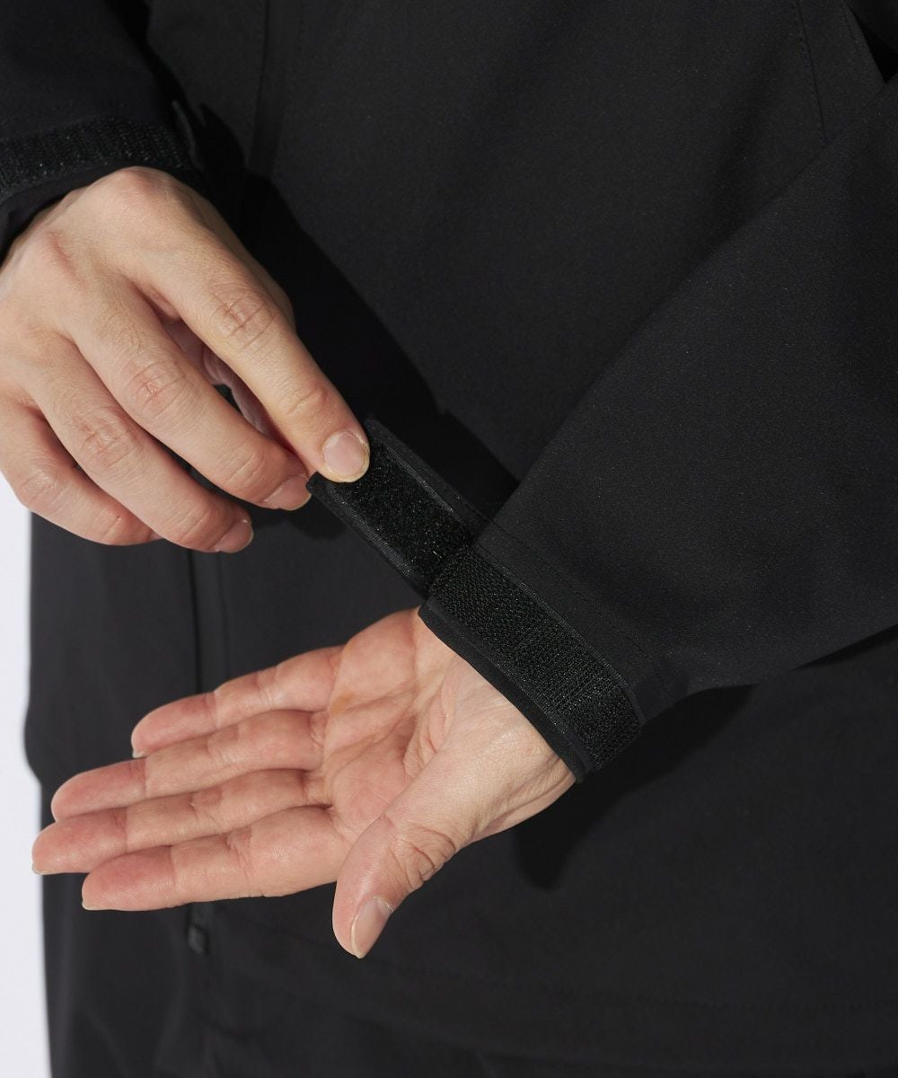 ウエスト・袖口はマジックテープで、裾口は内側スピンドルでしぼり調節が可能。