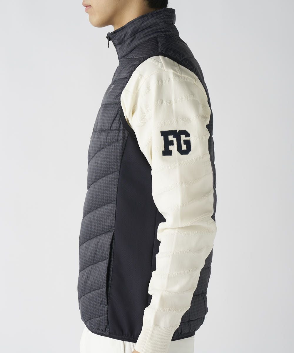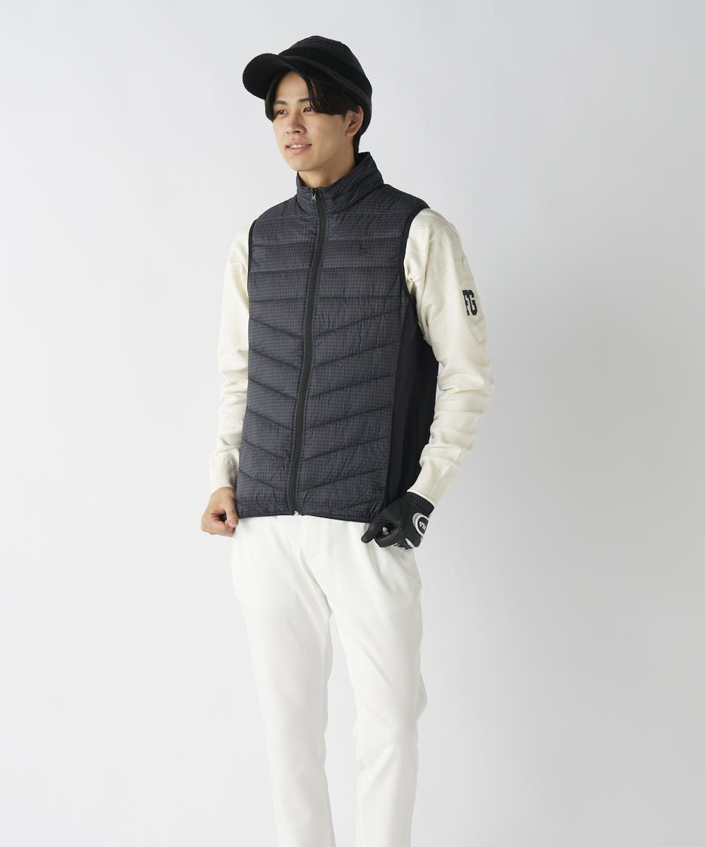 中綿に天然ダウンと高機能ファイバーダウンをブレンドしたハイブリッド中綿を採用。軽量でありながら高い保温力で、体の中心部を効率よく暖めます。撥水加工により、霧や小雨にも対応し、濡れにくく乾きやすいのでお手入れも容易です。脇部分にはストレッチ素材を使用し、腕の可動域を最大化し、スイングを妨げません。
