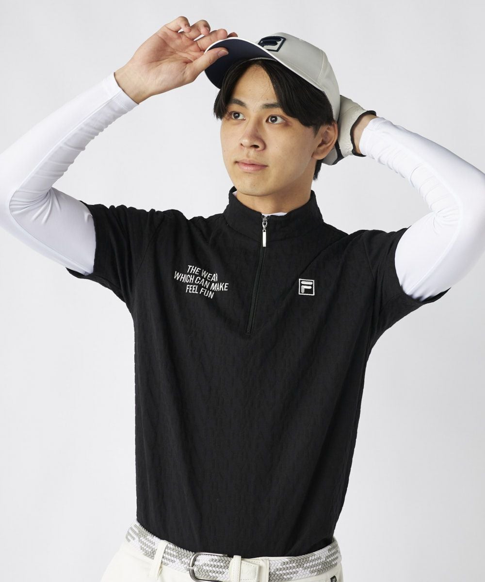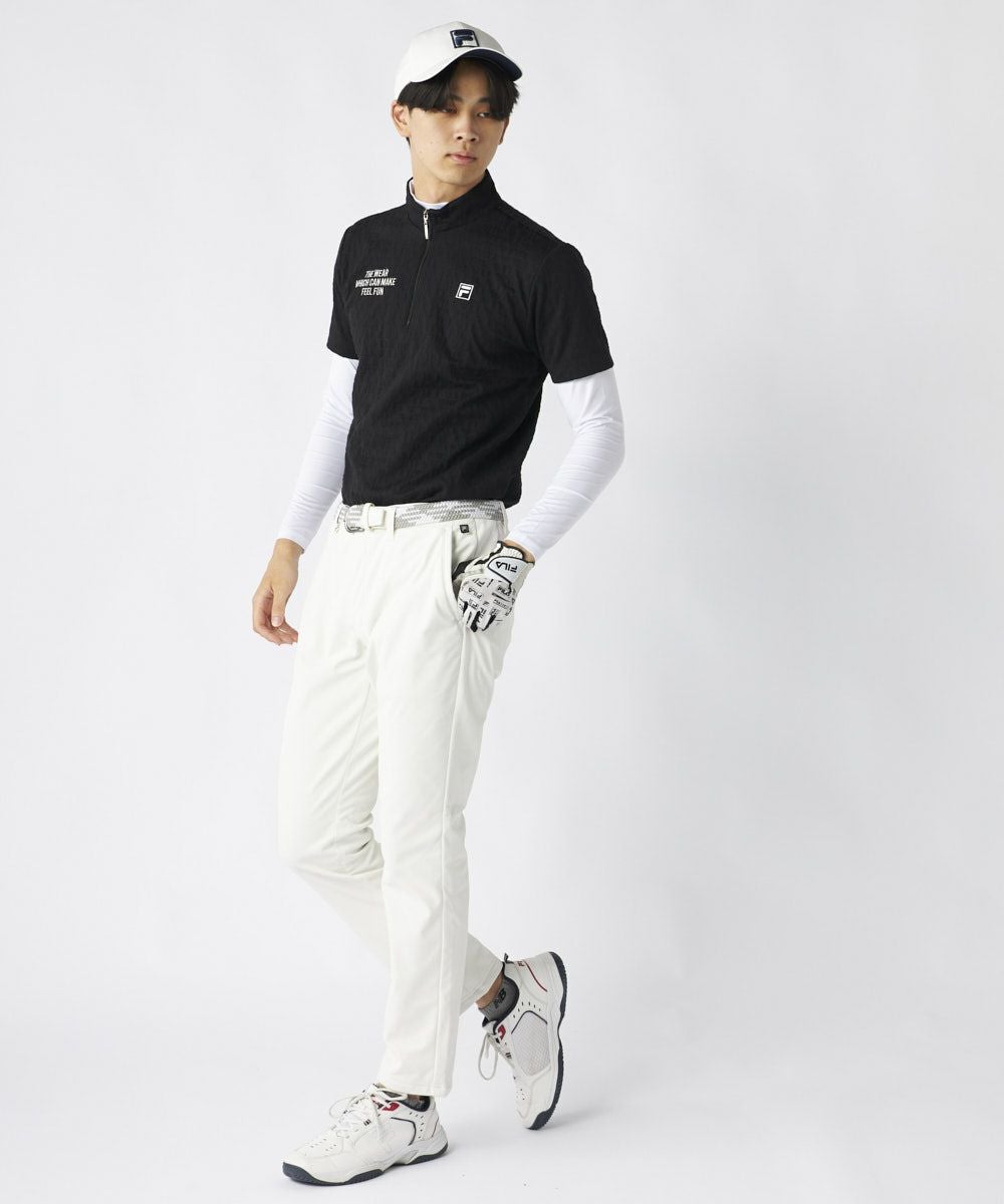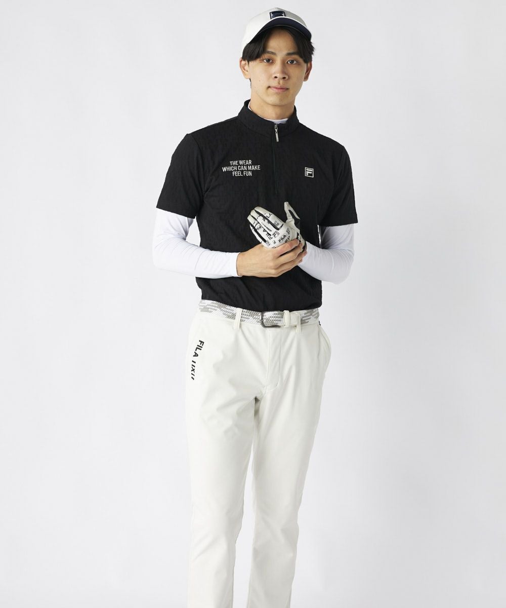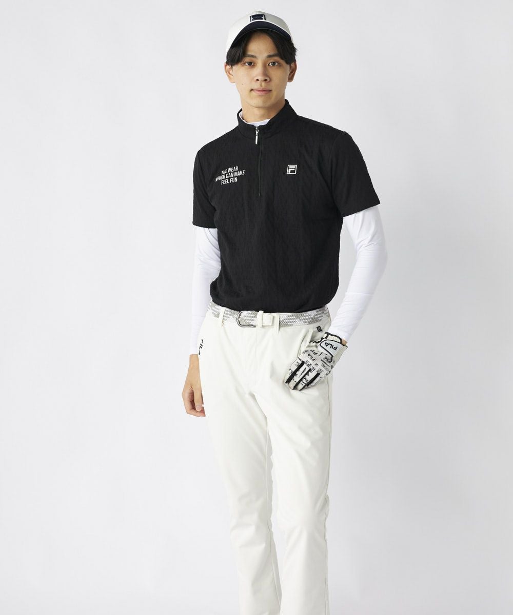 表情豊かな3Dジャガード素材を採用した半袖シャツと、ハイネックインナーのツインセットです。インナーは薄手ながら暖かさを保ち、肌寒い季節も快適なプレーをサポートします。アウター・インナーともにUVカット機能を備え、季節の変わり目や日差しが強い日でも安心してアクティブに動けます。