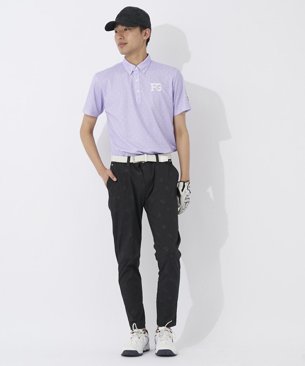 ストレッチの効いた軽量T/Cツイル素材にエンボスでPOPな飛び柄を入れたパンツ。裾上げいらずの9分丈仕様。細身のテーパードシルエット。腰裏とパッチポケットを配色にしてアクセントを付けています。