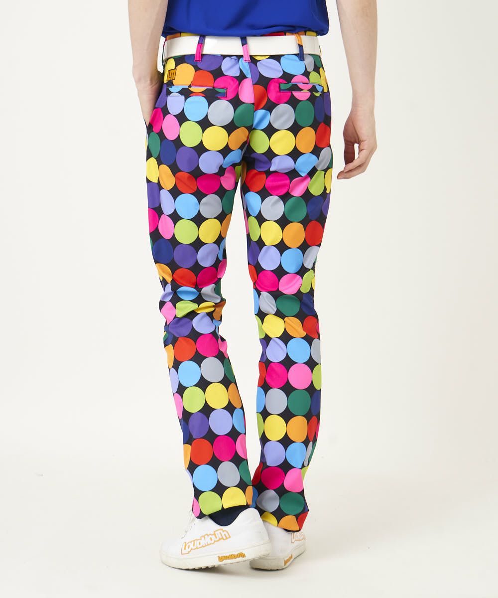 動きやすいポリエステルツイル素材を使用した柄パンツ。タイポグラフィック柄を打ち出しに今シーズンのインパクトのある柄を展開。