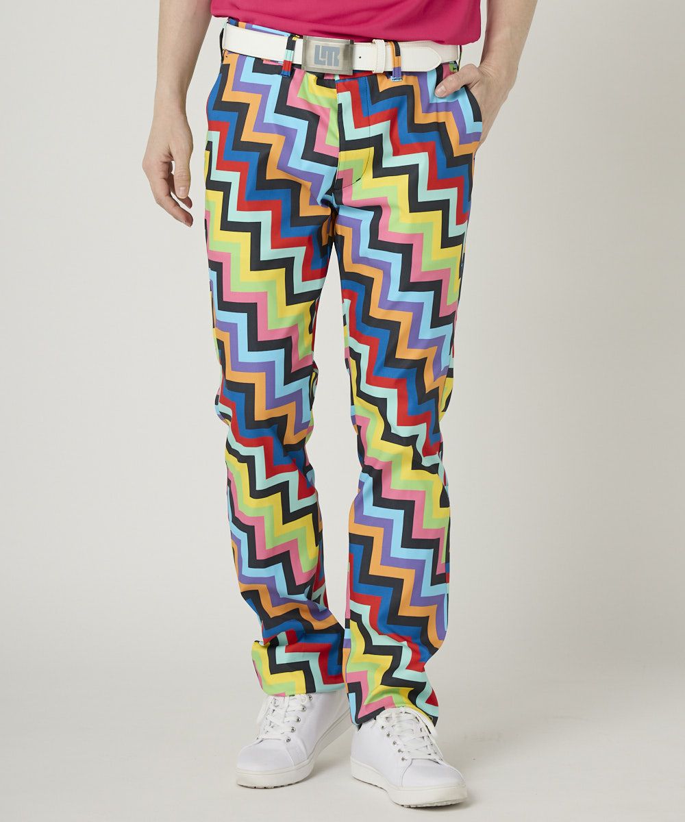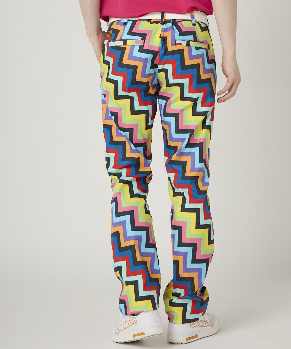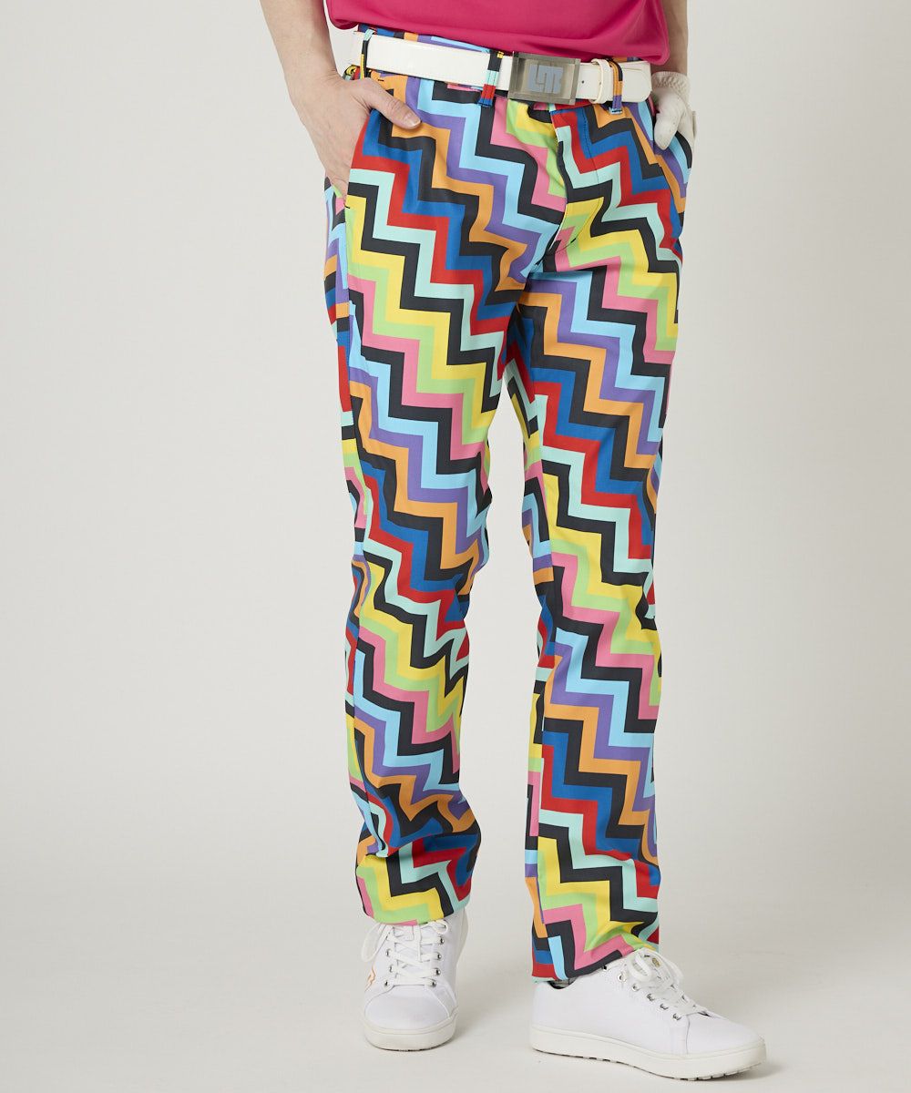 動きやすいポリエステルツイル素材を使用した柄パンツ。