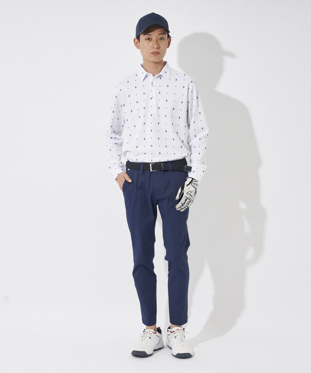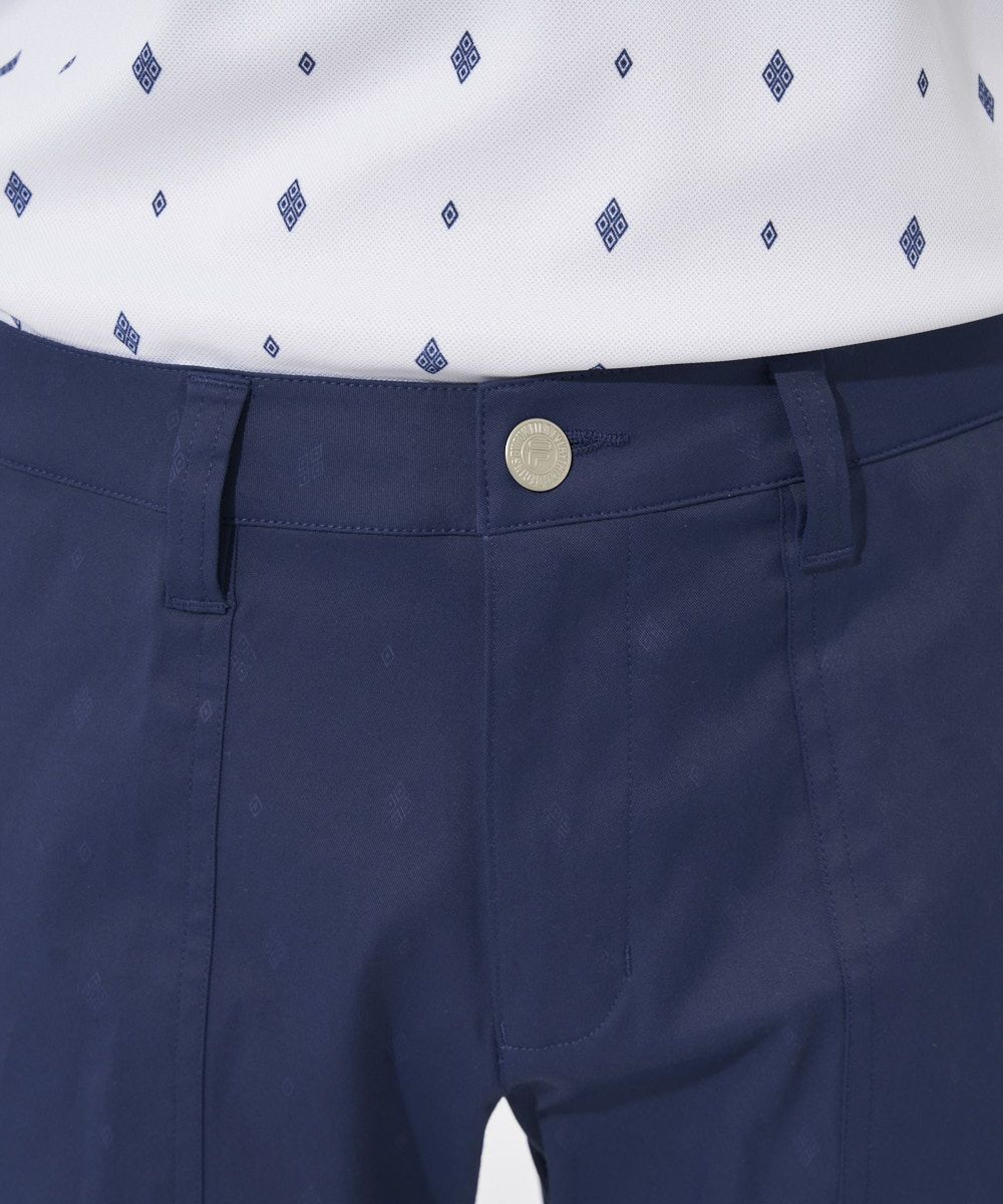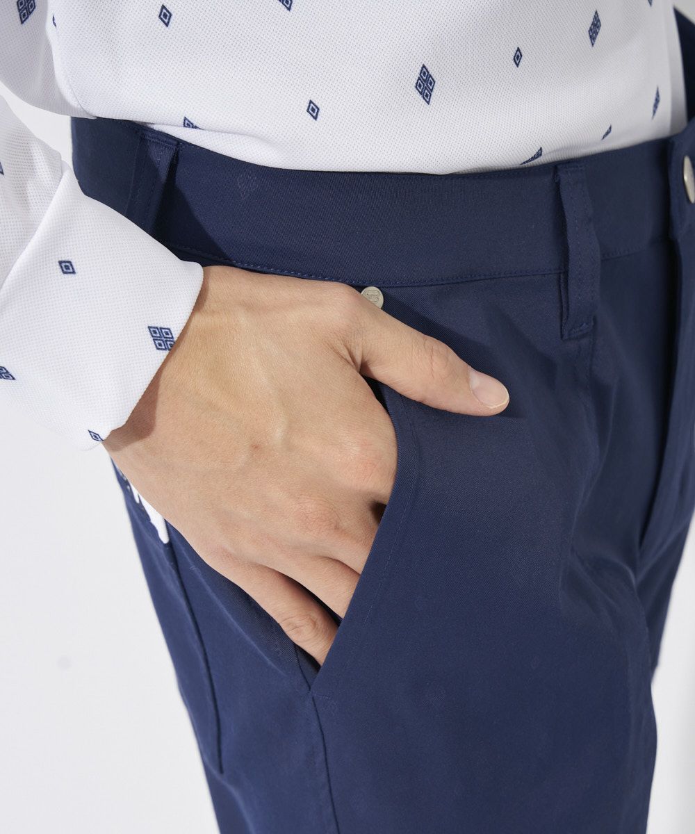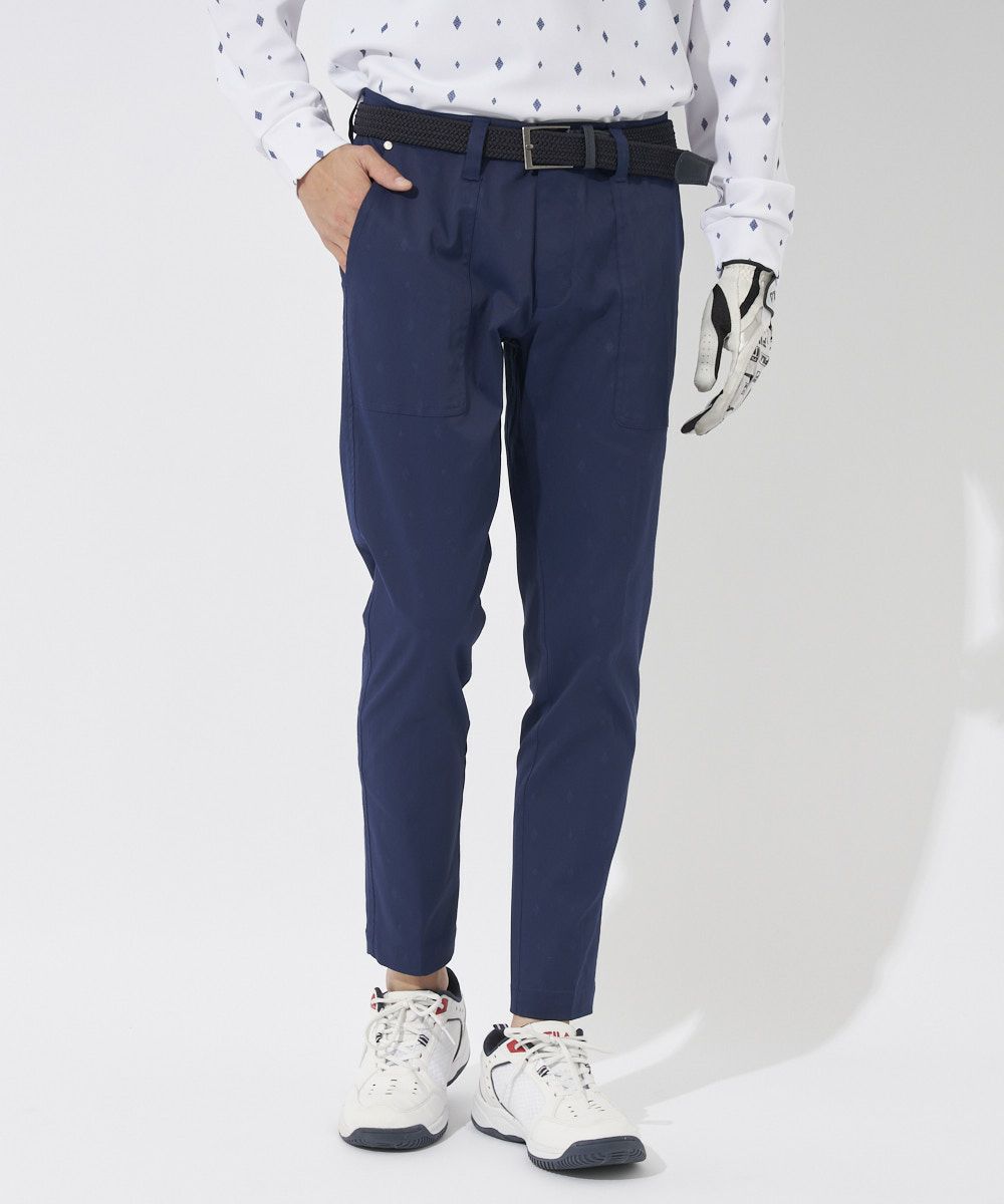 ストレッチの効いた軽量ツイル素材にエンボスで小柄の飛び柄を入れたパンツ。裾上げいらずの9分丈仕様。細身のテーパードシルエット。腰裏とパッチポケットを配色にしてアクセントを付けています。