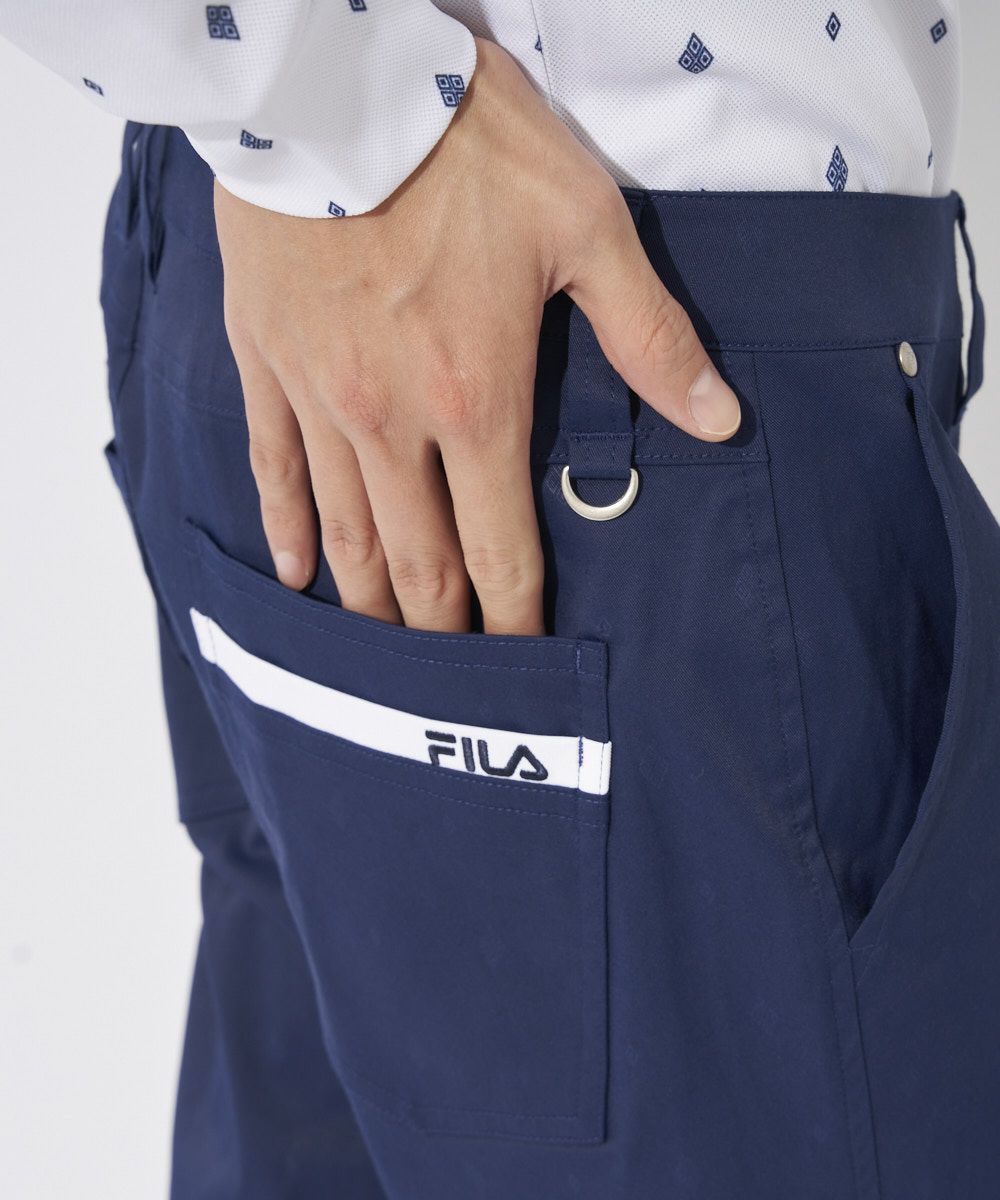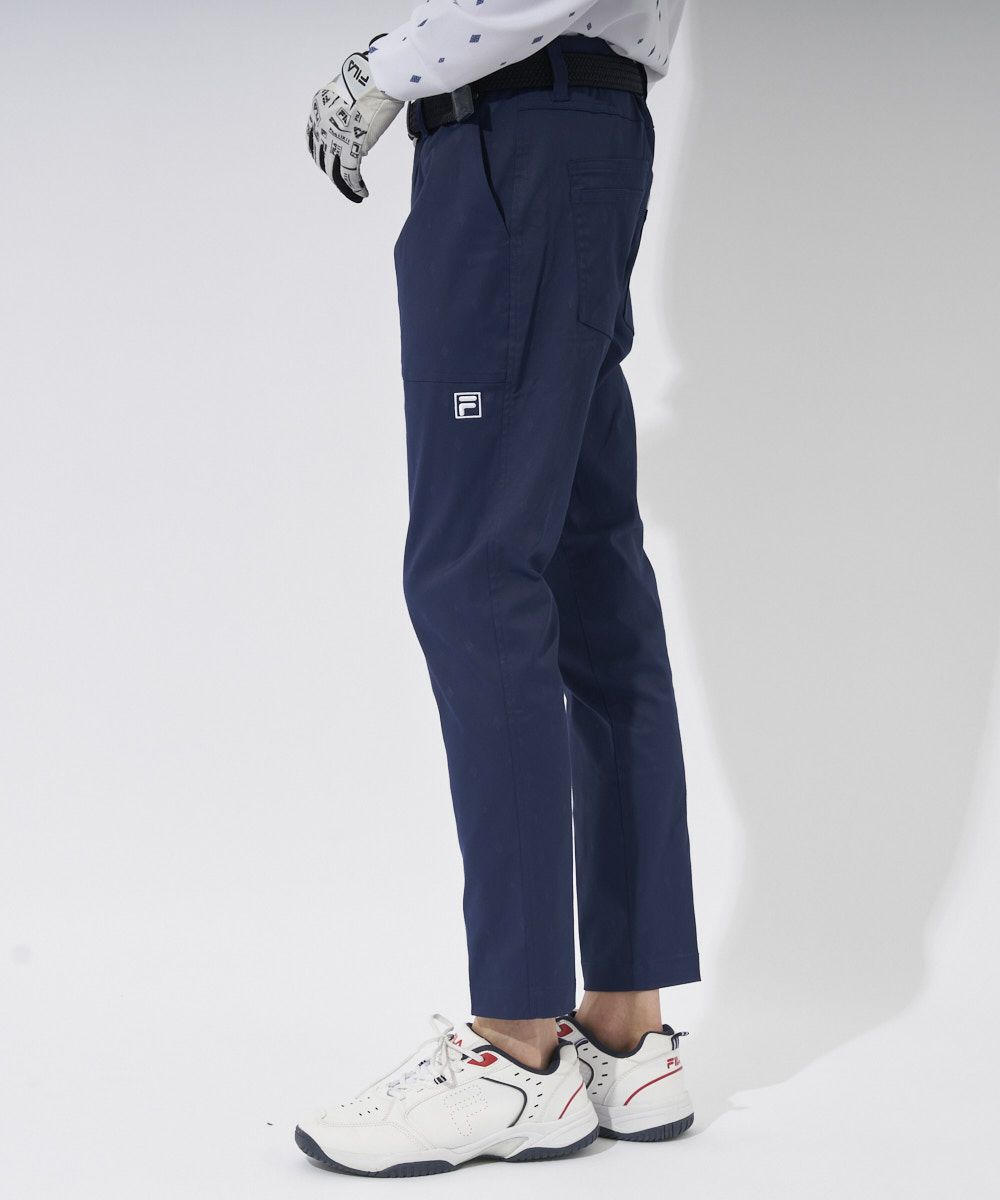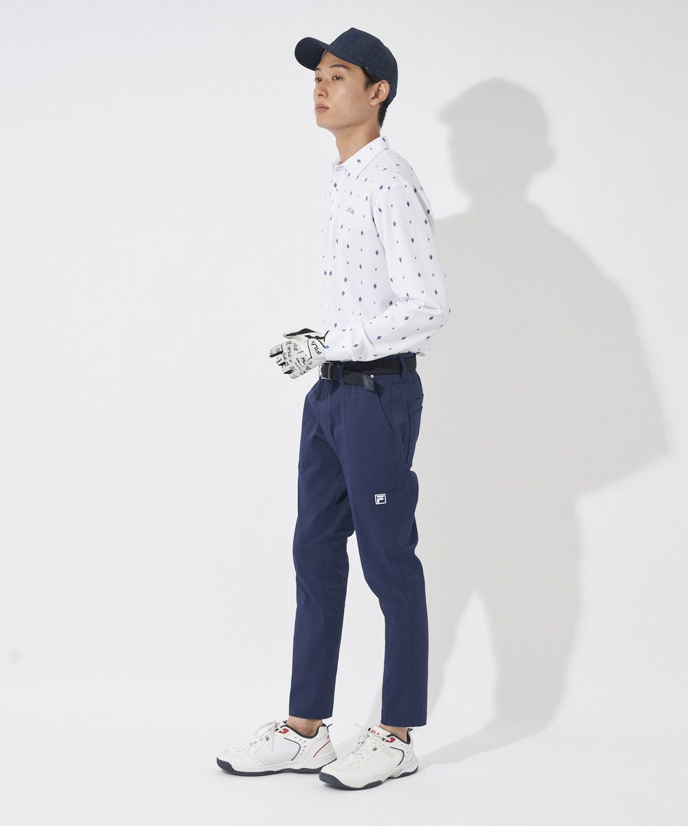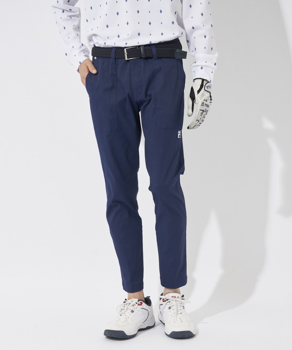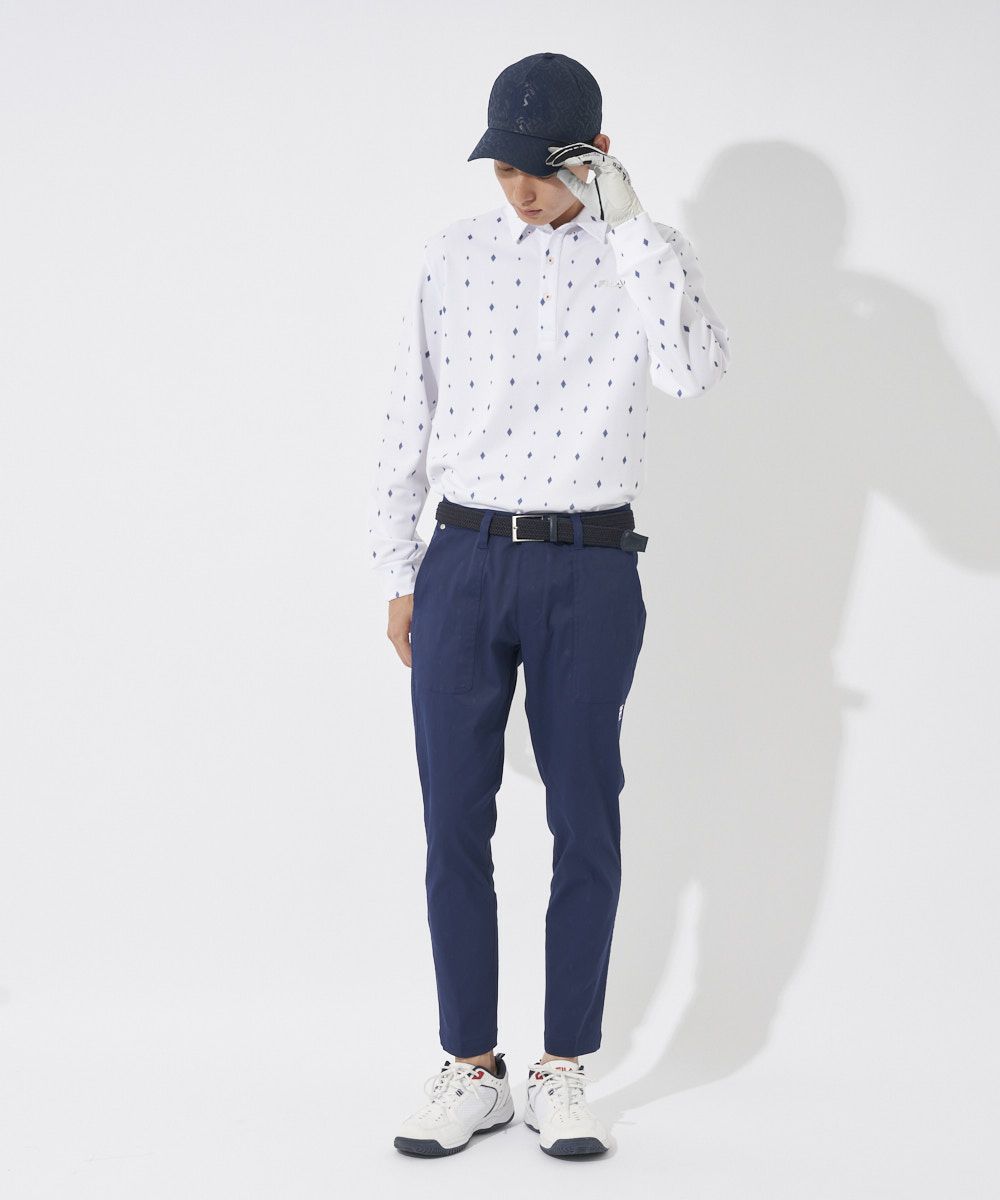 ストレッチの効いた軽量ツイル素材にエンボスで小柄の飛び柄を入れたパンツ。裾上げいらずの9分丈仕様。細身のテーパードシルエット。腰裏とパッチポケットを配色にしてアクセントを付けています。
