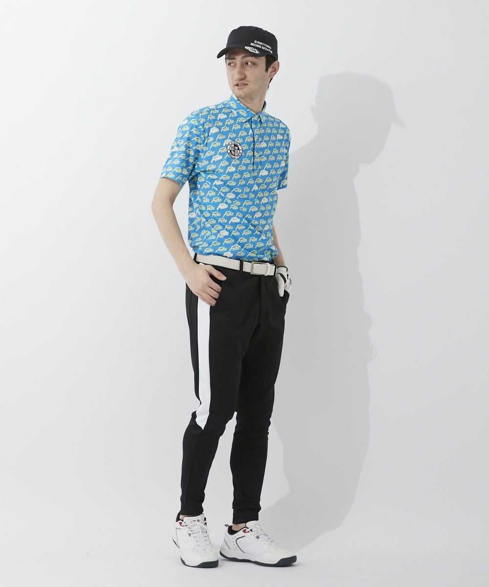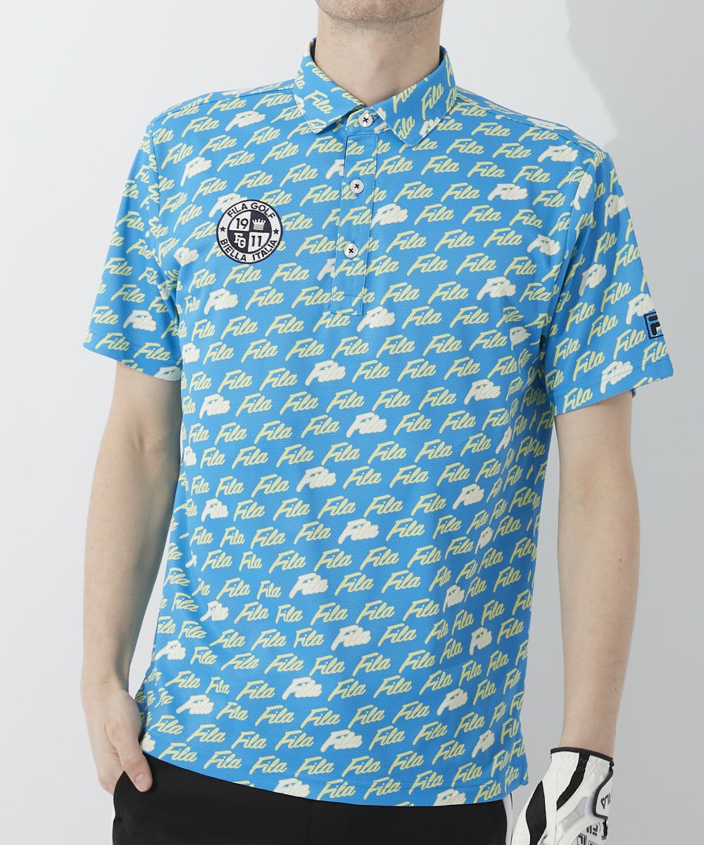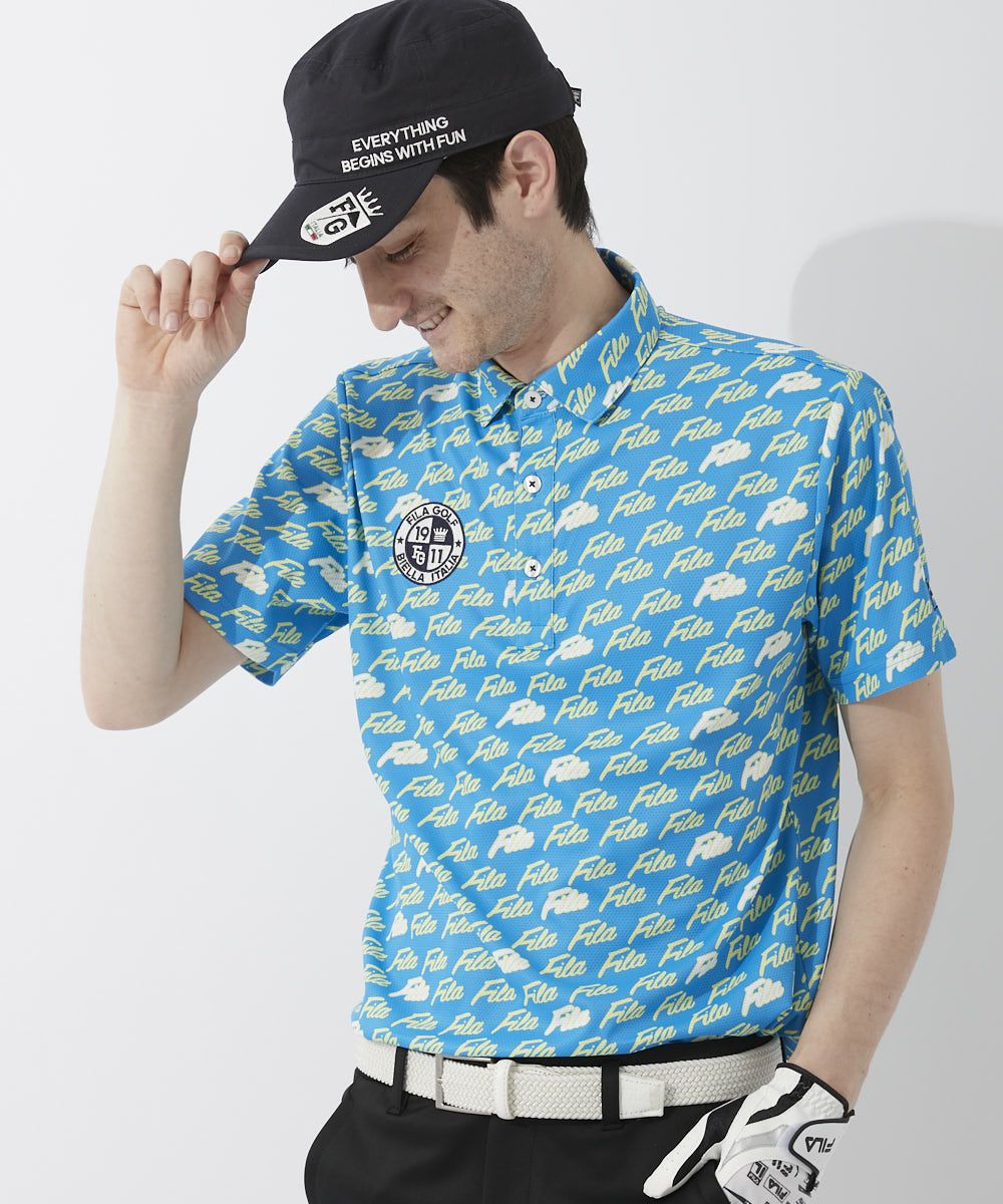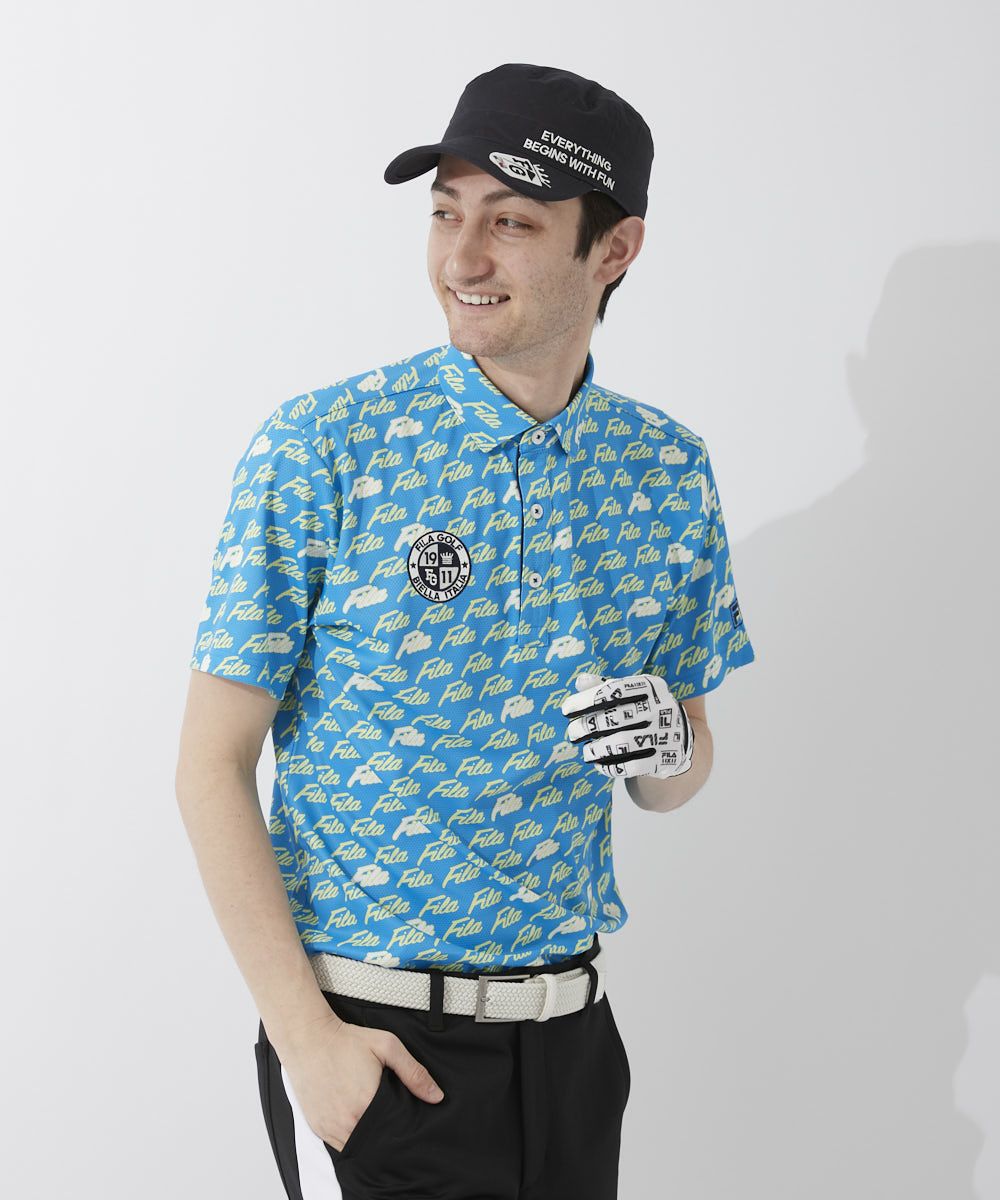 エコに配慮したリサイクル素材を使用した半袖シャツ。ホリゾンタルカラー仕様。FILA GOLFらしいPOPな筆記体ロゴプリントがポイント。裾にスリットを付けて着用時にお腹周りのシワを軽減させます。