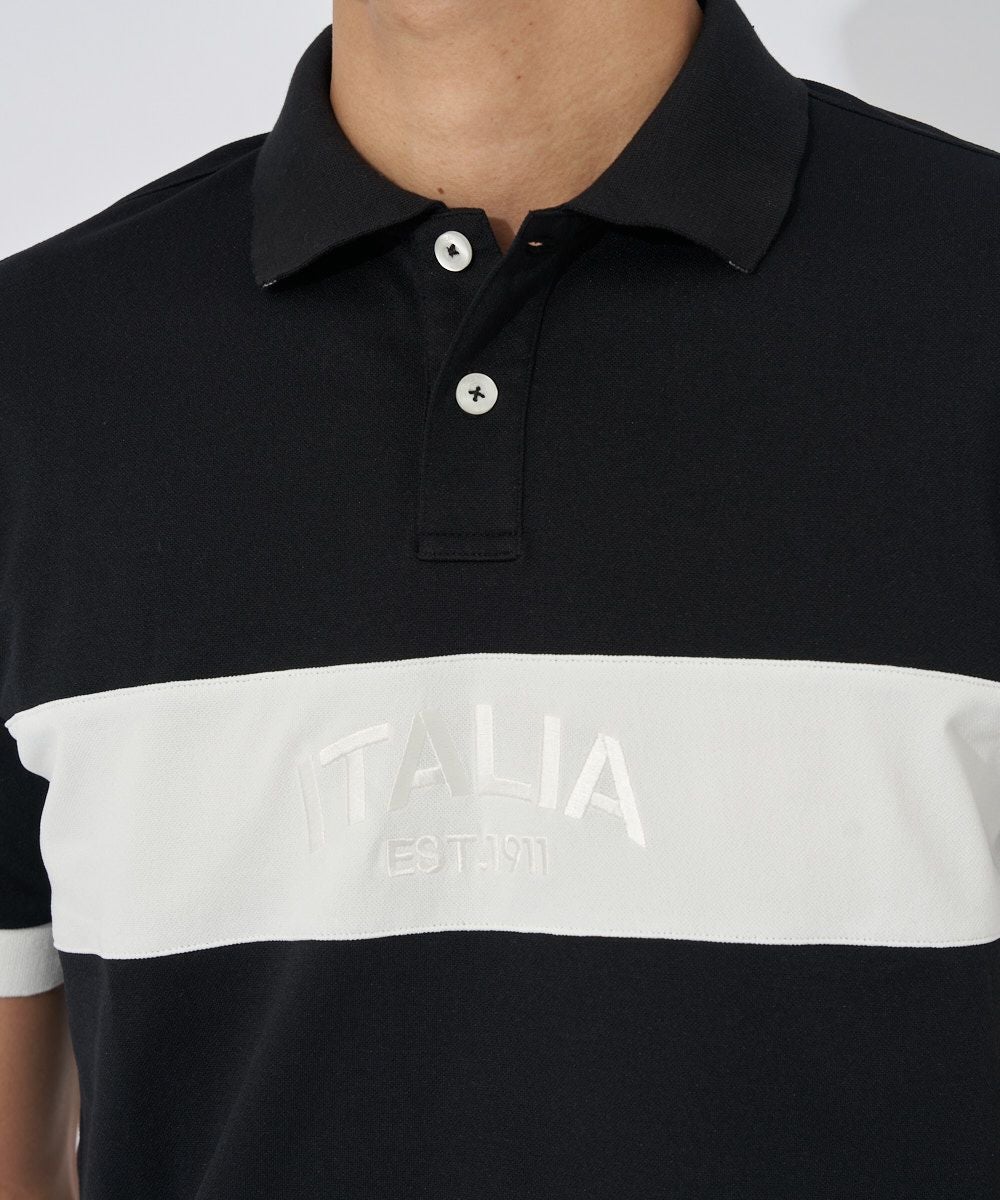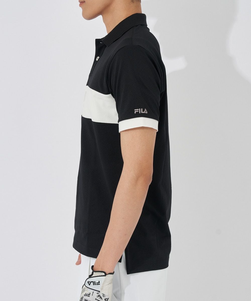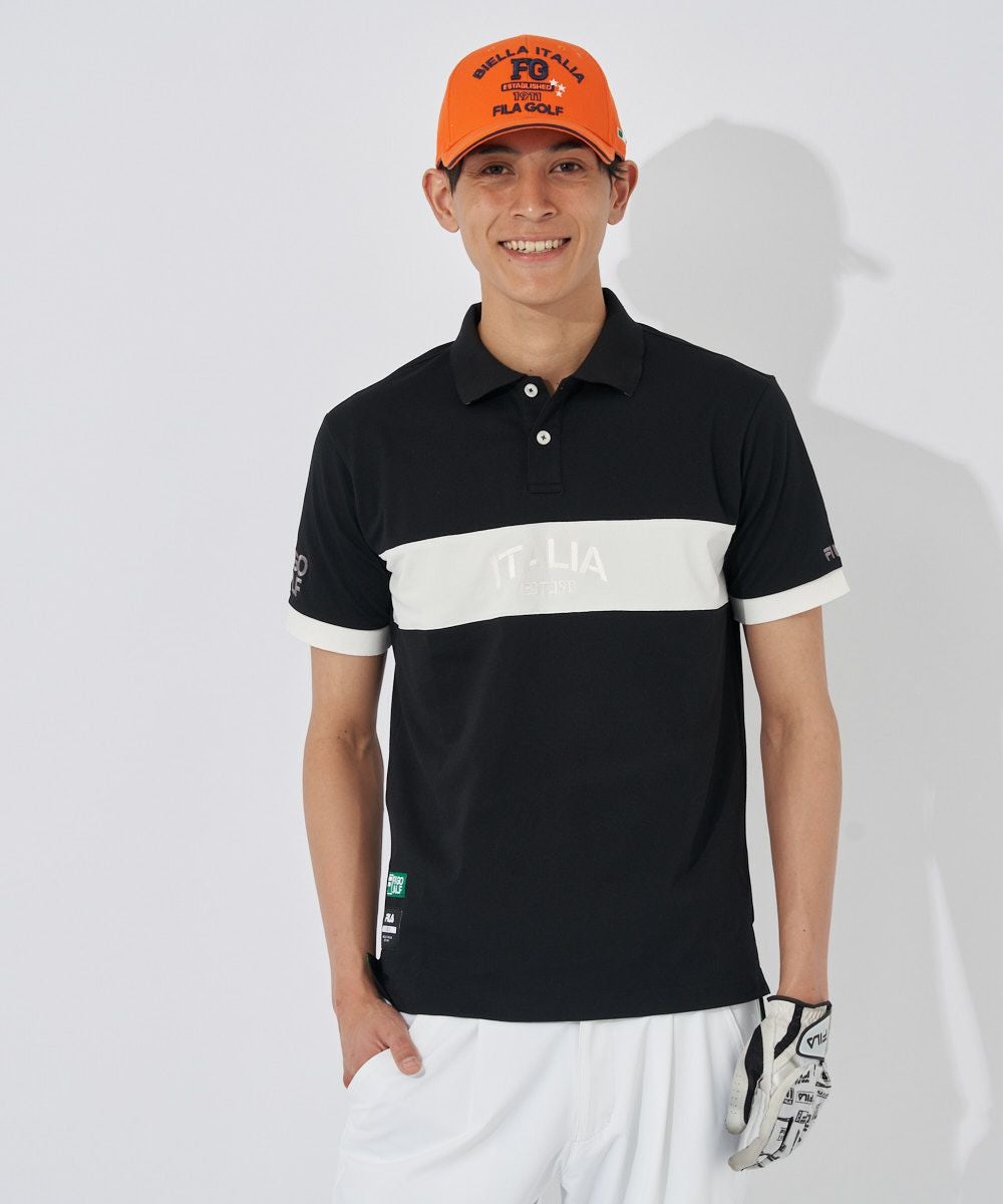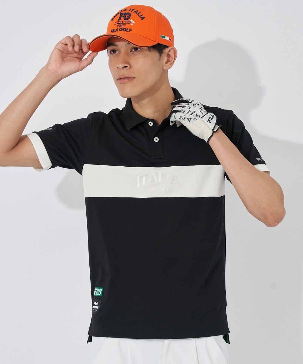 ストレッチカノコを使用した半袖シャツ。FILAらしい配色ライン切替デザイン。裾にスリットを付けて着用時にお腹周りのシワを軽減させます。FILA刺繍とトーントーンロゴ刺繍、FILAGOLF刺繍が入ります。FILAオリジナルの織りネームが付いています。