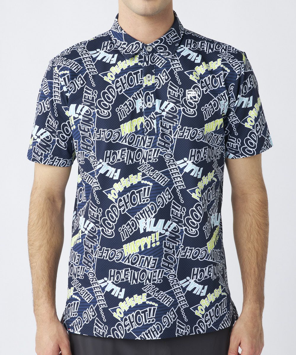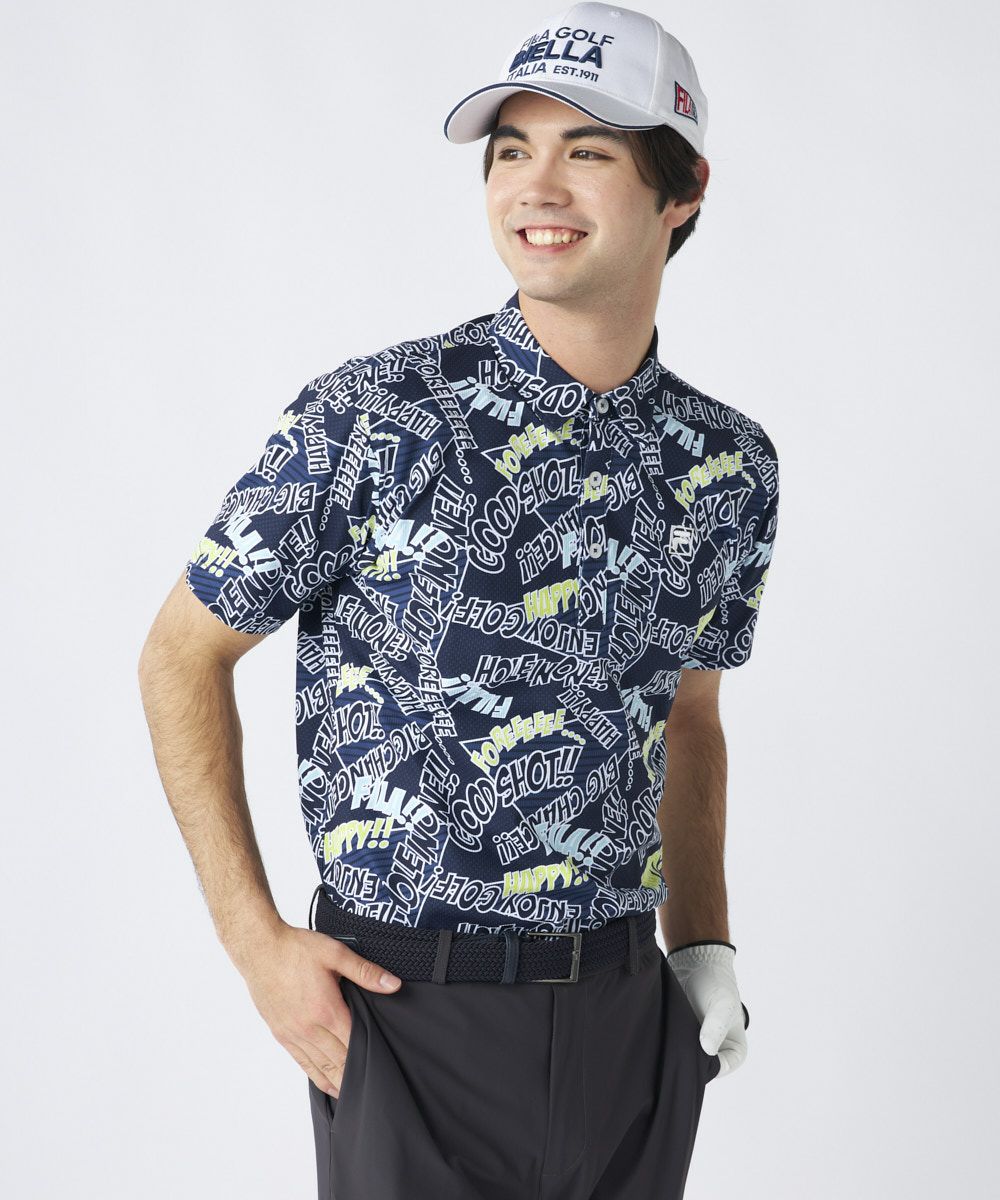 コミック調のデザインが特徴のポップなゴルフシャツです。配色もオシャレなので、ベーシックなボトムスに合わせるだけでおしゃれな印象に!