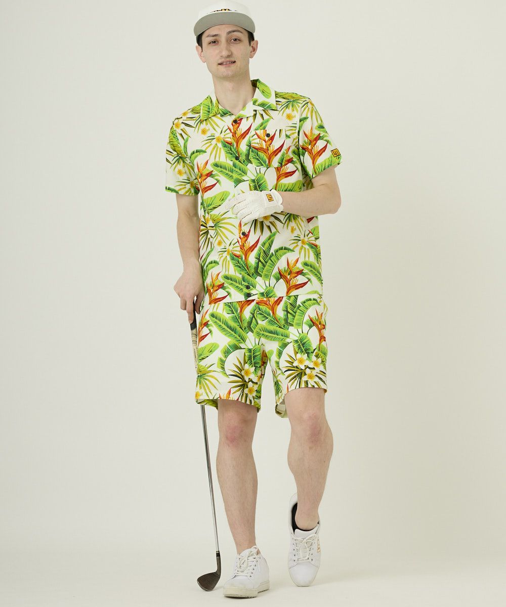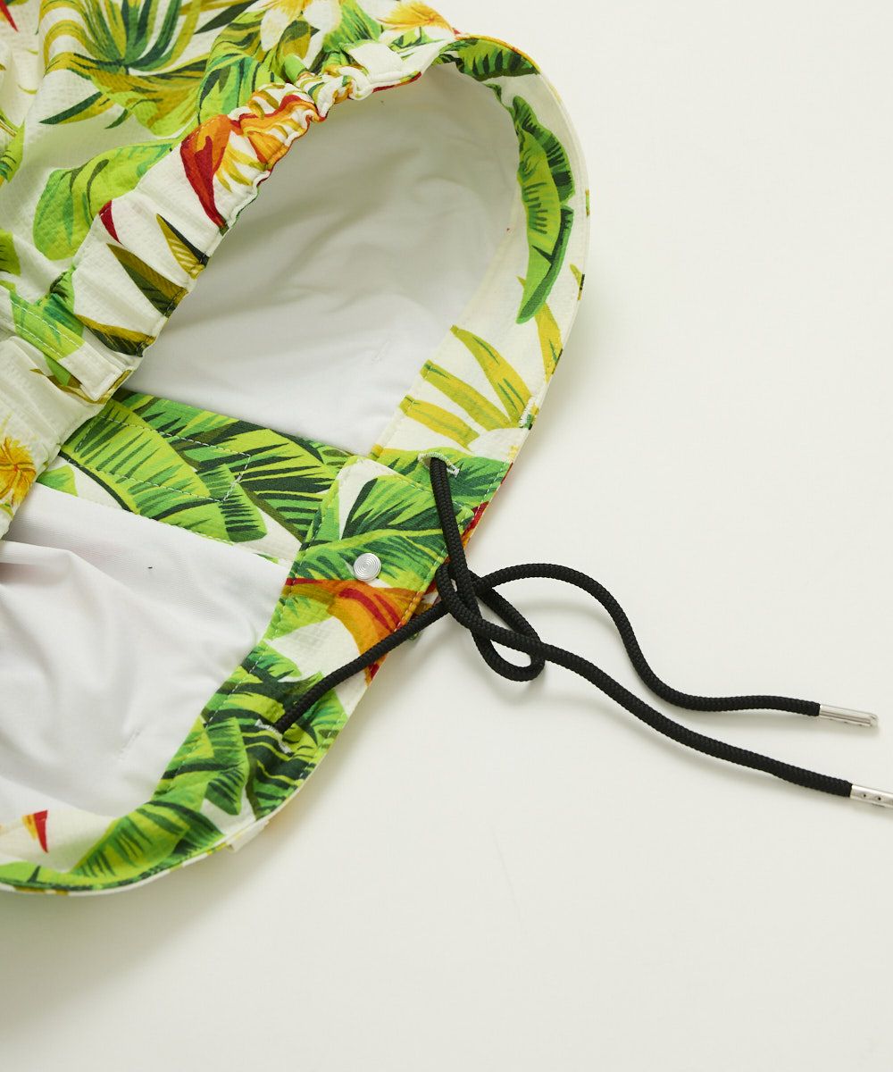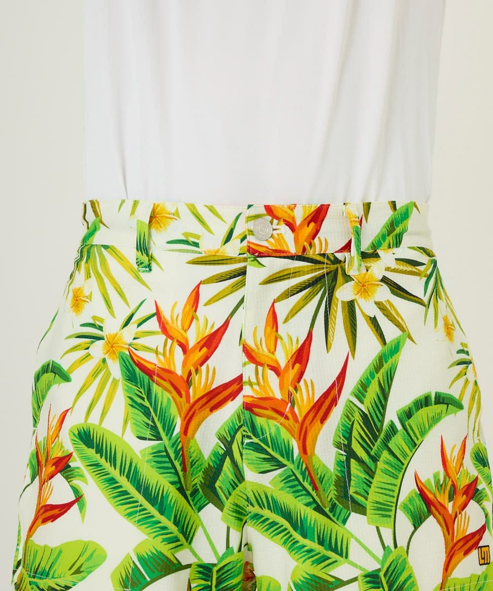 サラッとした肌障りのストレッチサッカー素材を使用したショートパンツ。シーズントレンドのリゾート柄展開しています。また上下でコーディネートできるアイテムです。