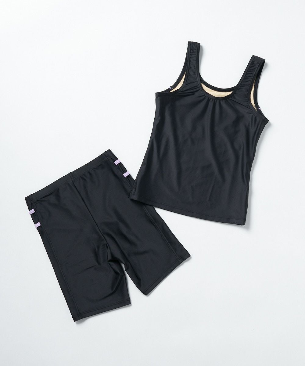 動きやすく、着替えやすいタンキニタイプ! 肌見せ部分が少ないので、いっぱい泳ぎたくて、体型が気になる女の子にオススメのデザインです♪
