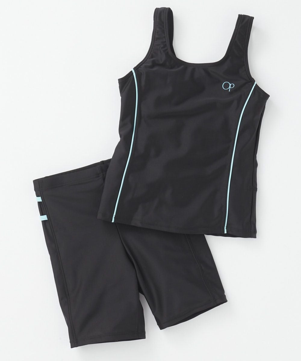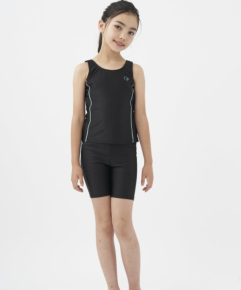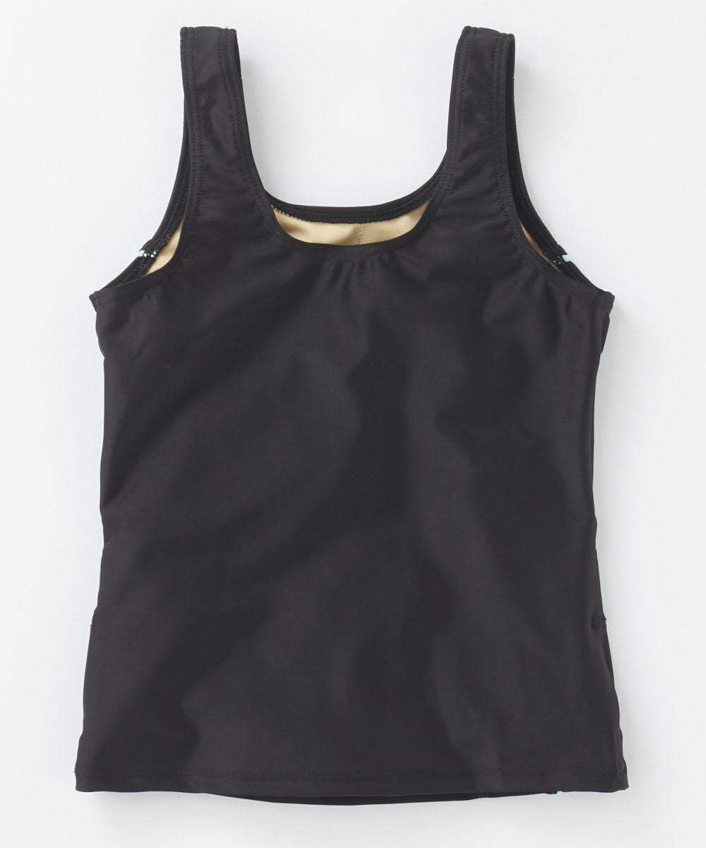 動きやすく、着替えやすいタンキニタイプ! 肌見せ部分が少ないので、いっぱい泳ぎたくて、体型が気になる女の子にオススメのデザインです♪
