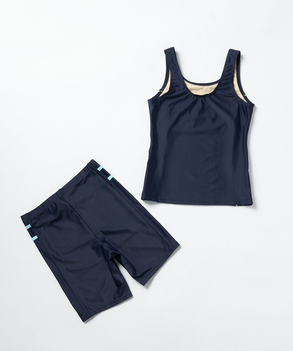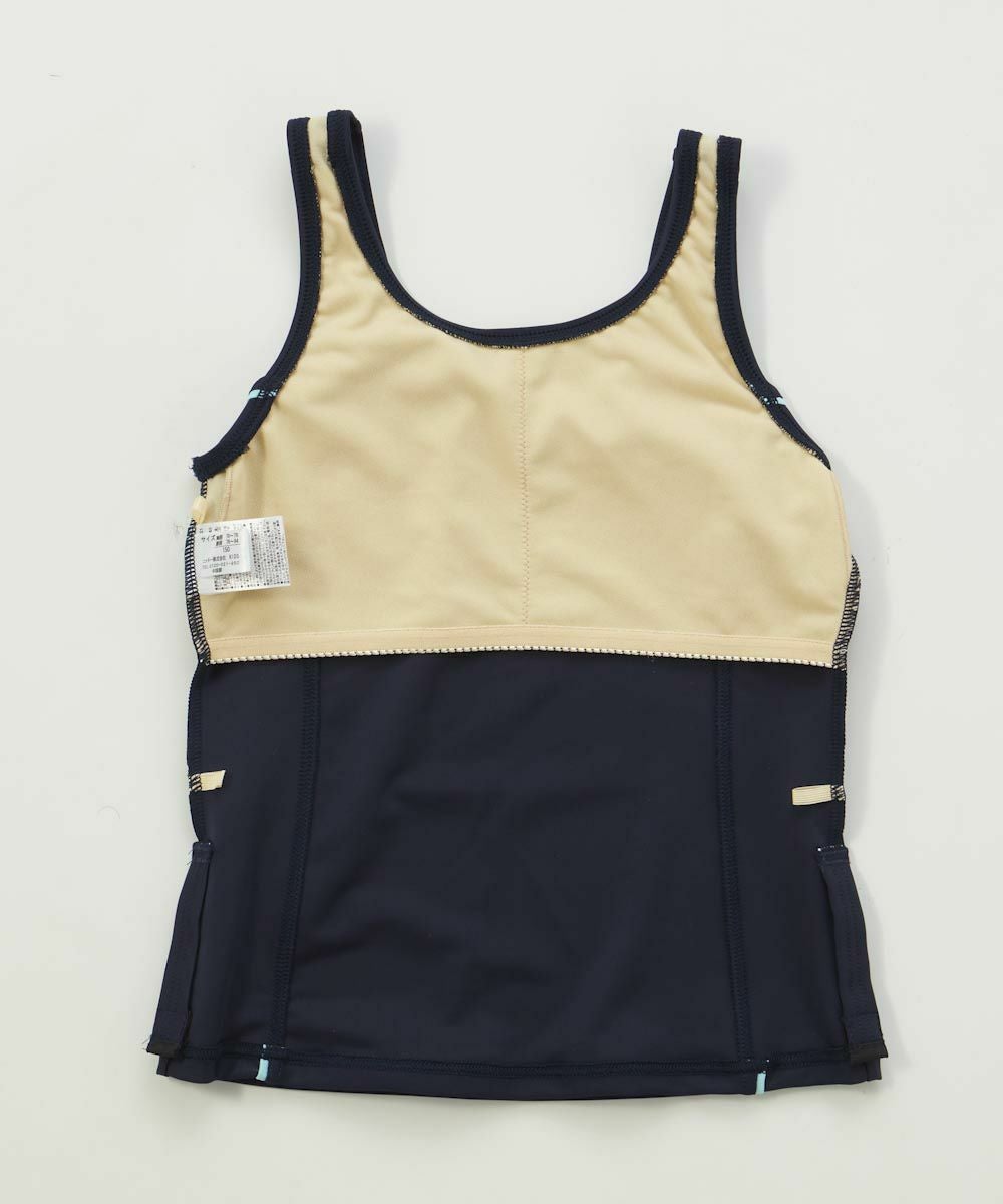 動きやすく、着替えやすいタンキニタイプ! 肌見せ部分が少ないので、いっぱい泳ぎたくて、体型が気になる女の子にオススメのデザインです♪