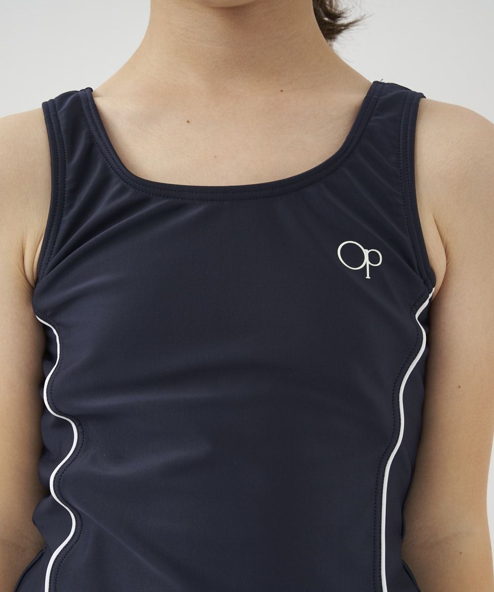 動きやすく、着替えやすいタンキニタイプ! 肌見せ部分が少ないので、いっぱい泳ぎたくて、体型が気になる女の子にオススメのデザインです♪