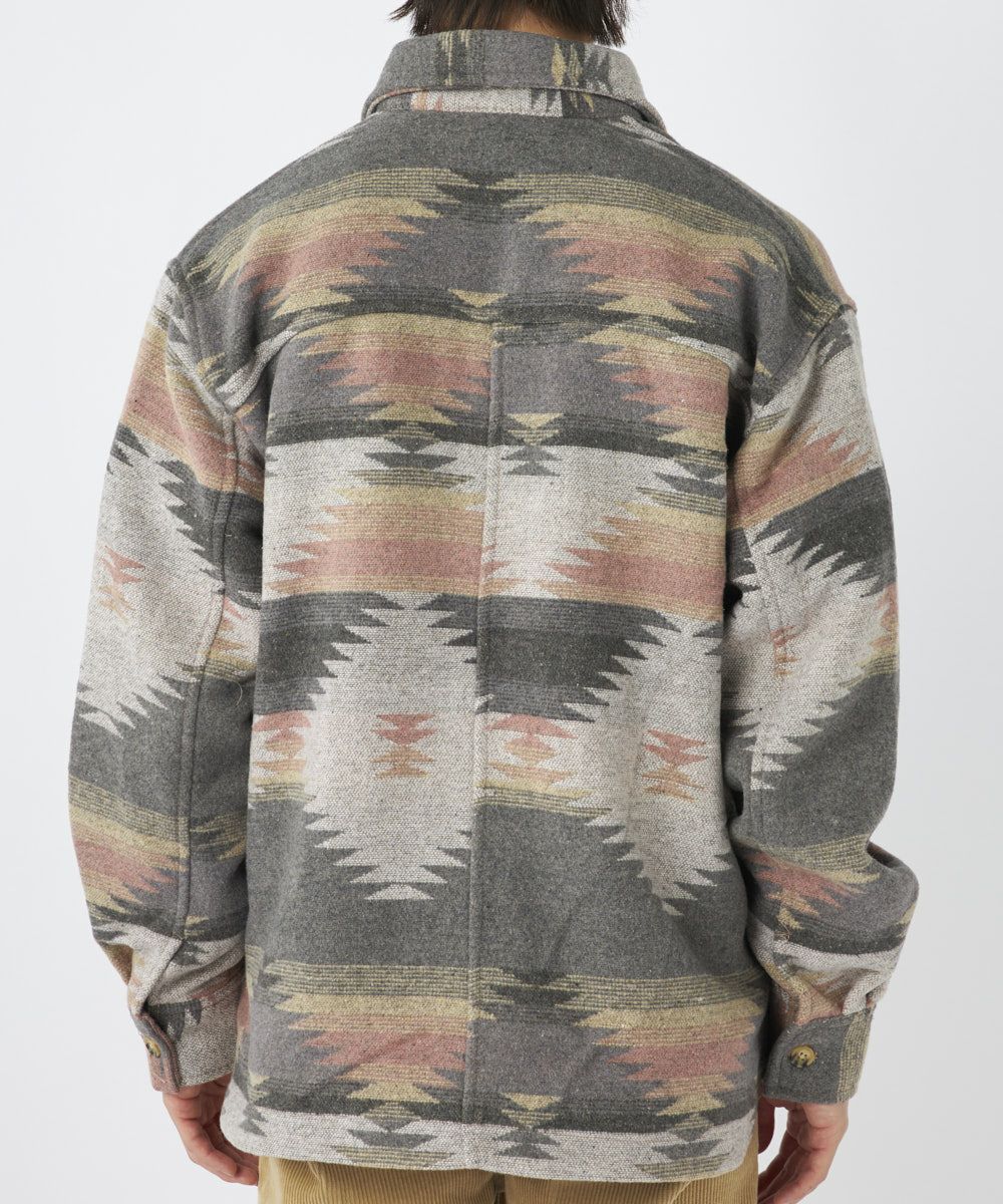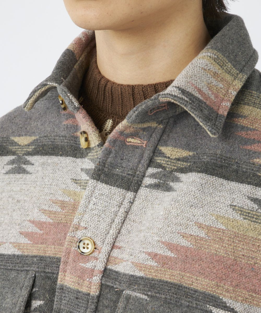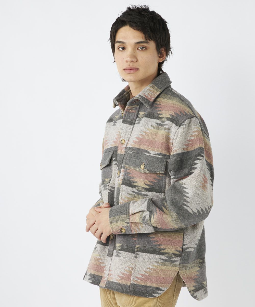 人気の民族柄を先染めした長袖シャツ。ポケット付きでおしゃれなアクセントを。