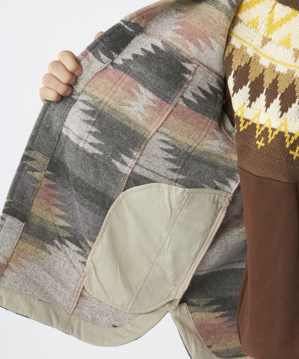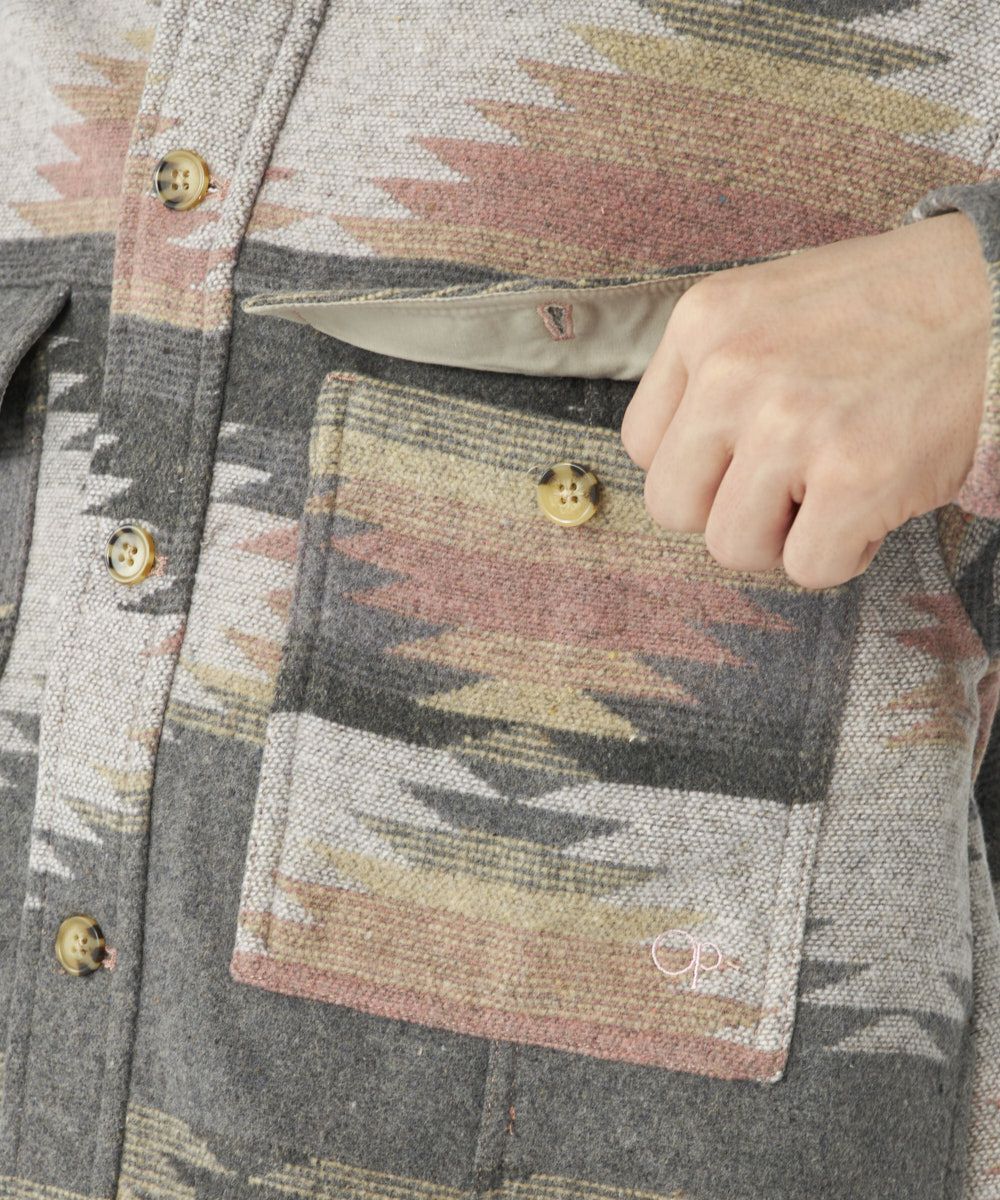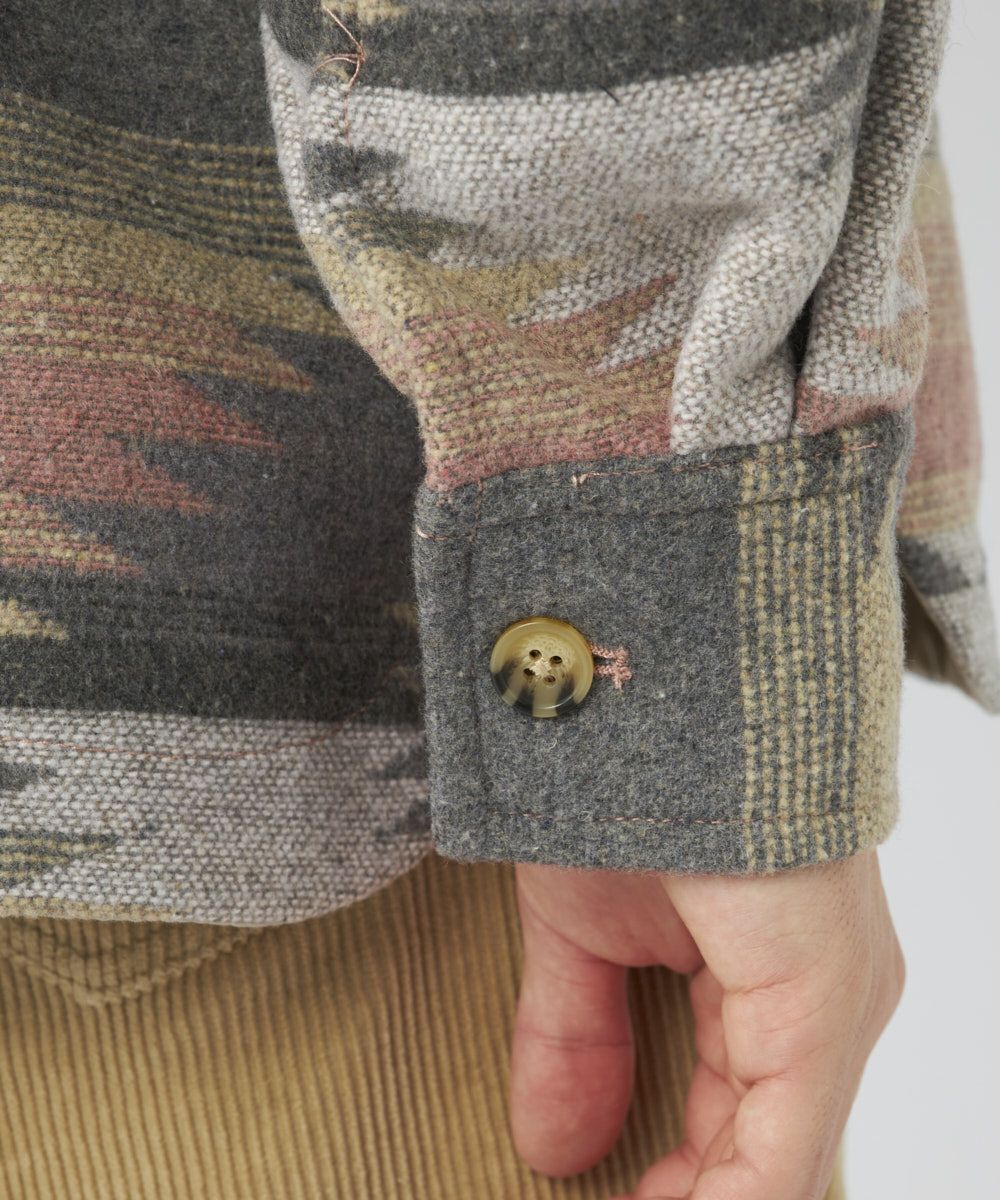 人気の民族柄を先染めした長袖シャツ。ポケット付きでおしゃれなアクセントを。