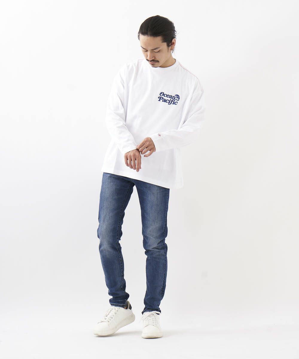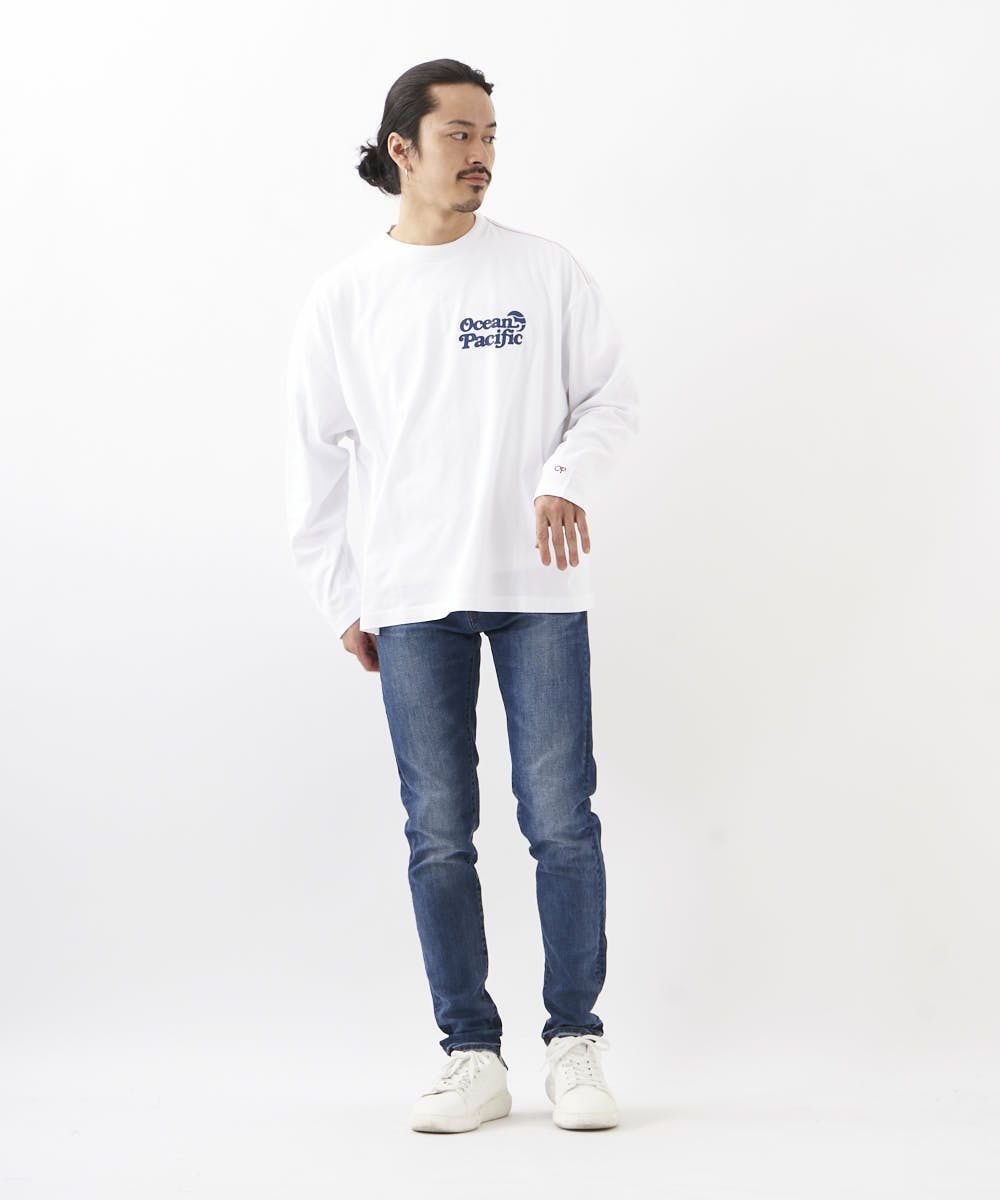 バックのロゴプリントがUSEDっぽく、こなれ感を演出してくれる長袖Tシャツ。肩と首元のラインがアクセント。