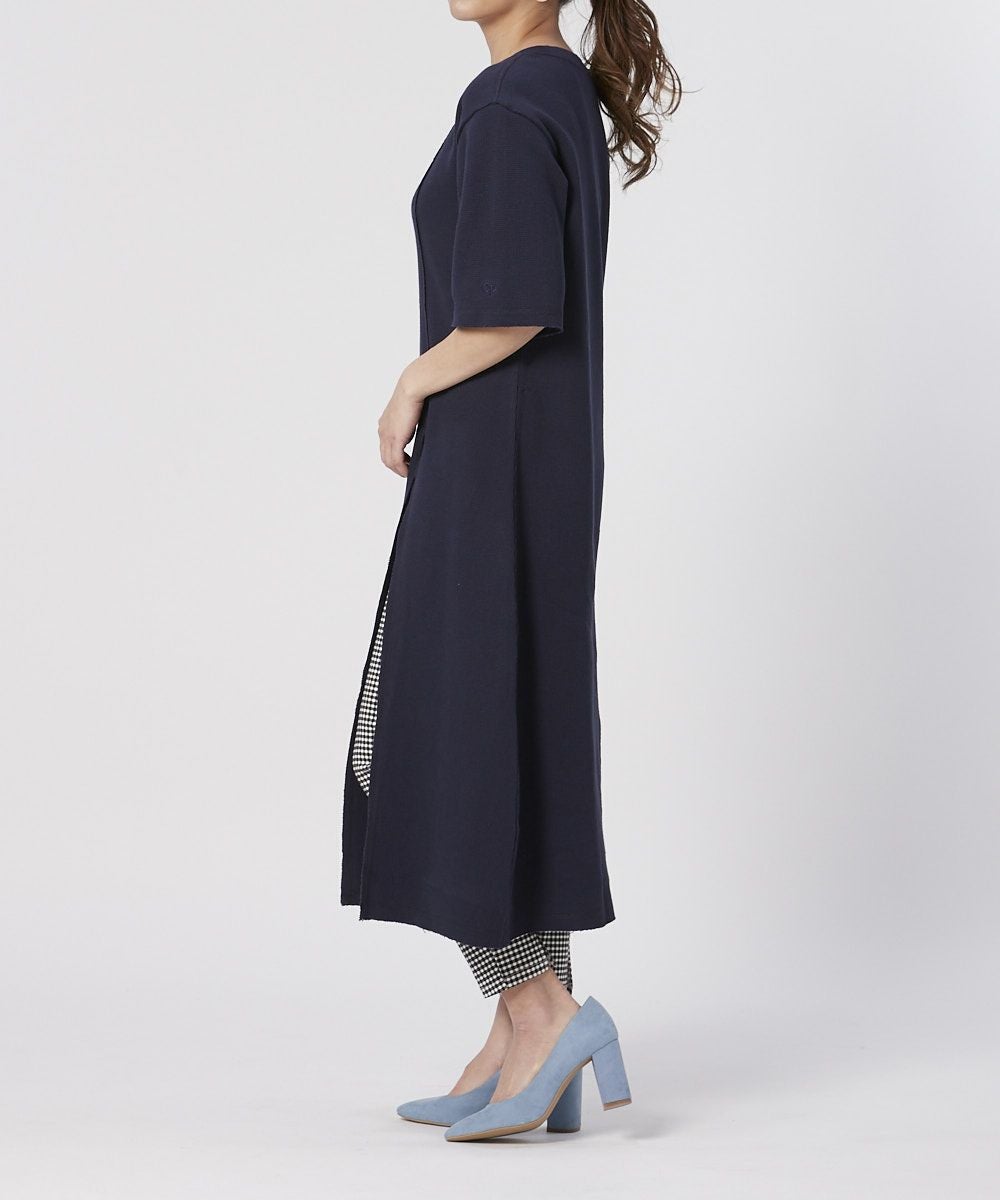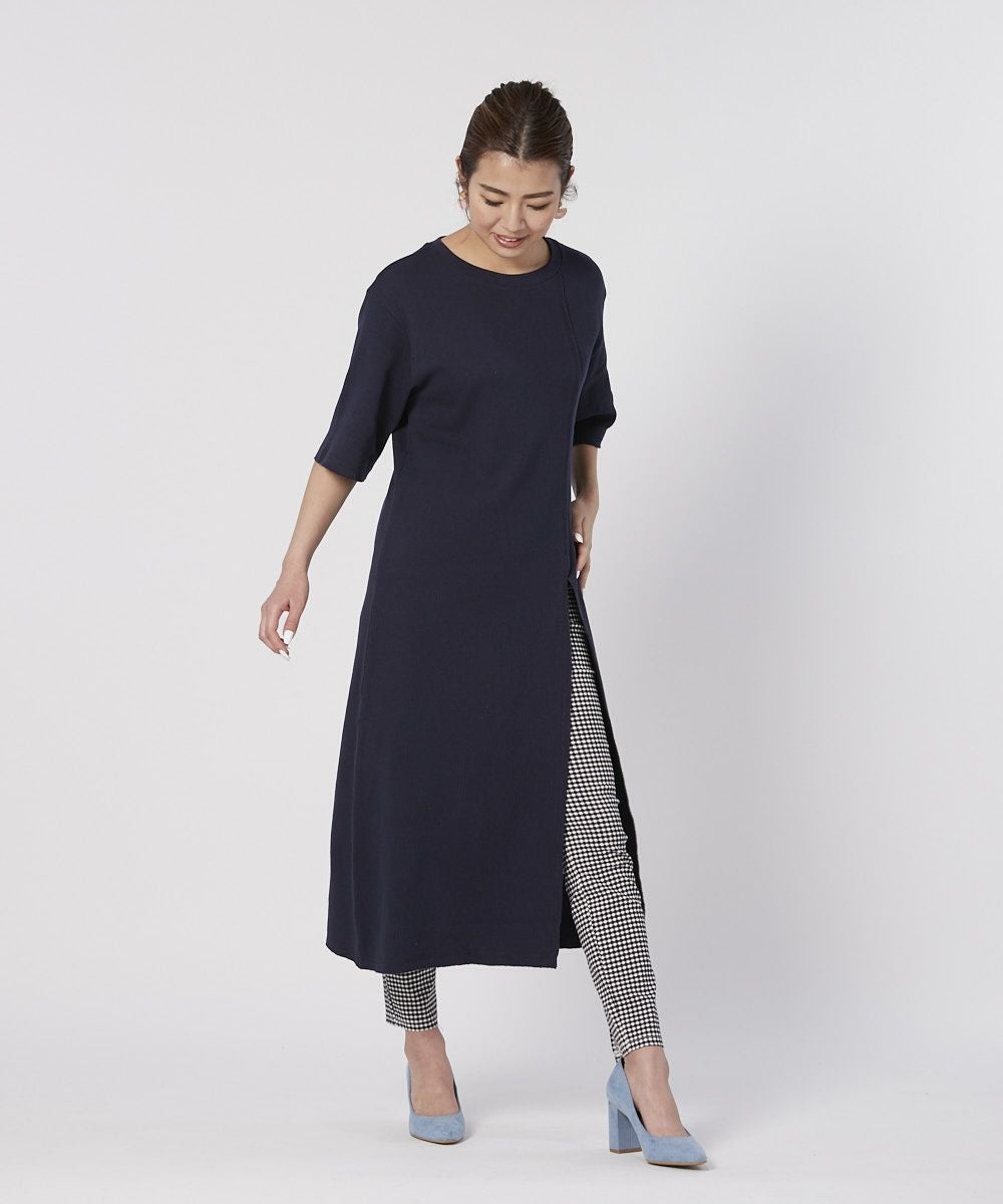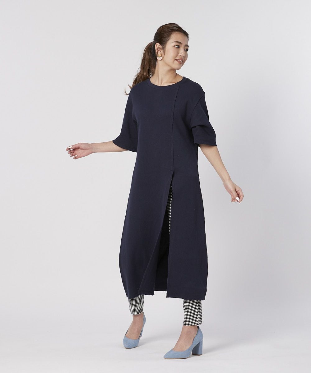 ワッフル素材のスリットワンピ。デニムやレギンスボトムなどと合わせて。フェスやアウトドアにもおしゃれコーデとして使える一着。
