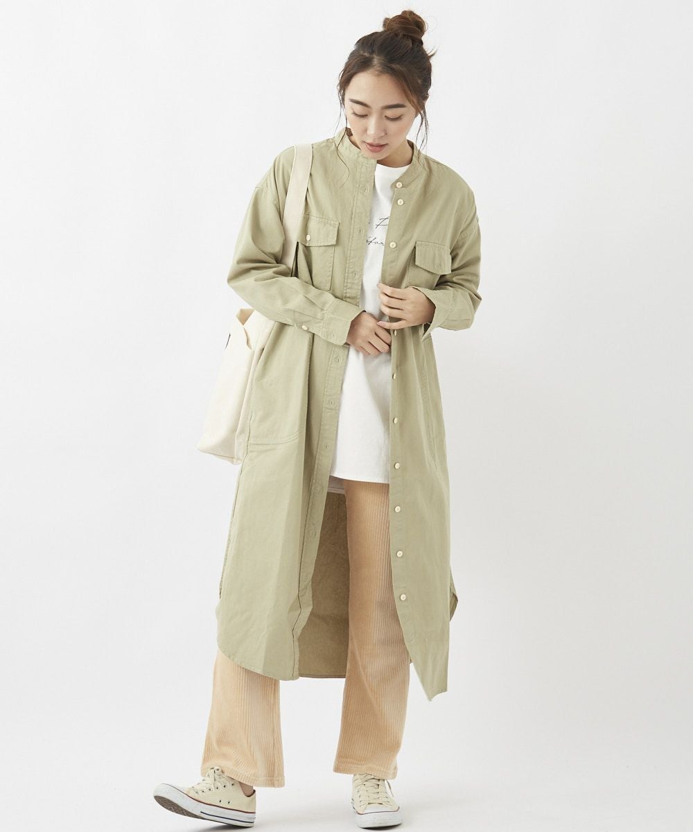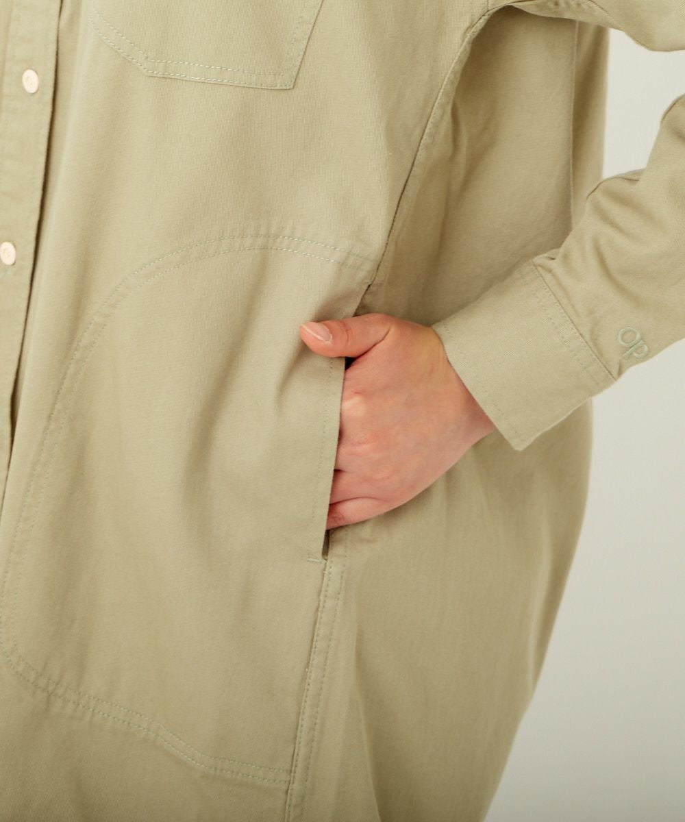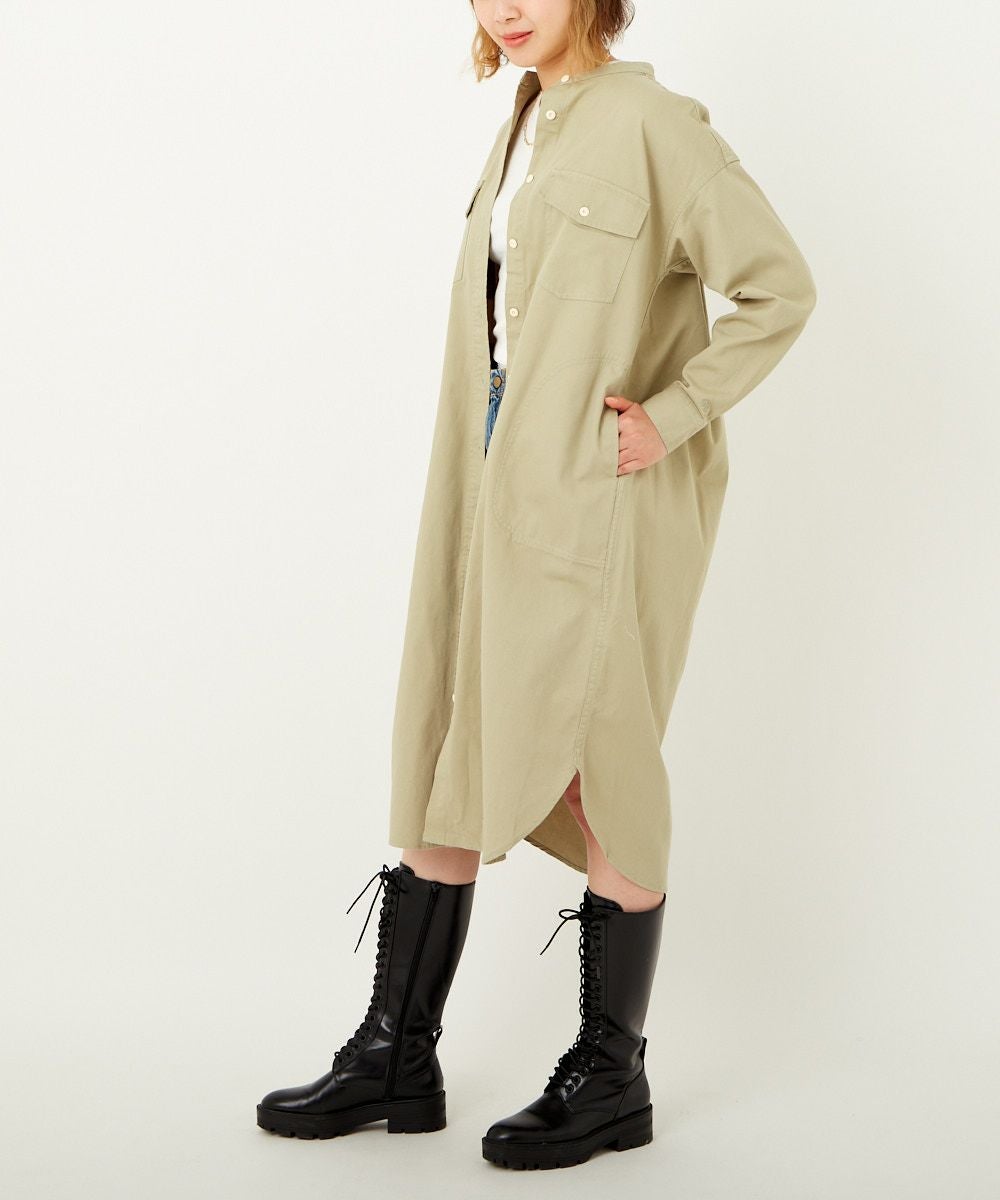 製品染めのコットンツイルシャツ。軽い羽織としてはもちろん、ワンピースとしても着用できる丈感がポイント。