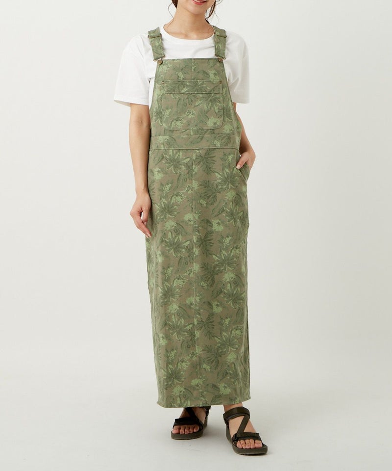 ボタニカル柄のジャンパースカート。ワンマイルにもぴったり。ゆったりシルエットでリラックスできる仕様に!総柄で涼しく夏のリゾートにもぴったり!