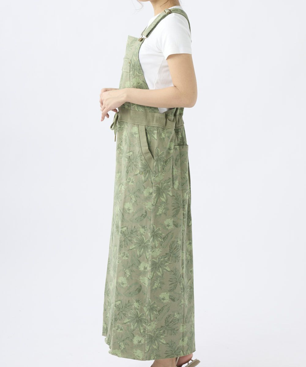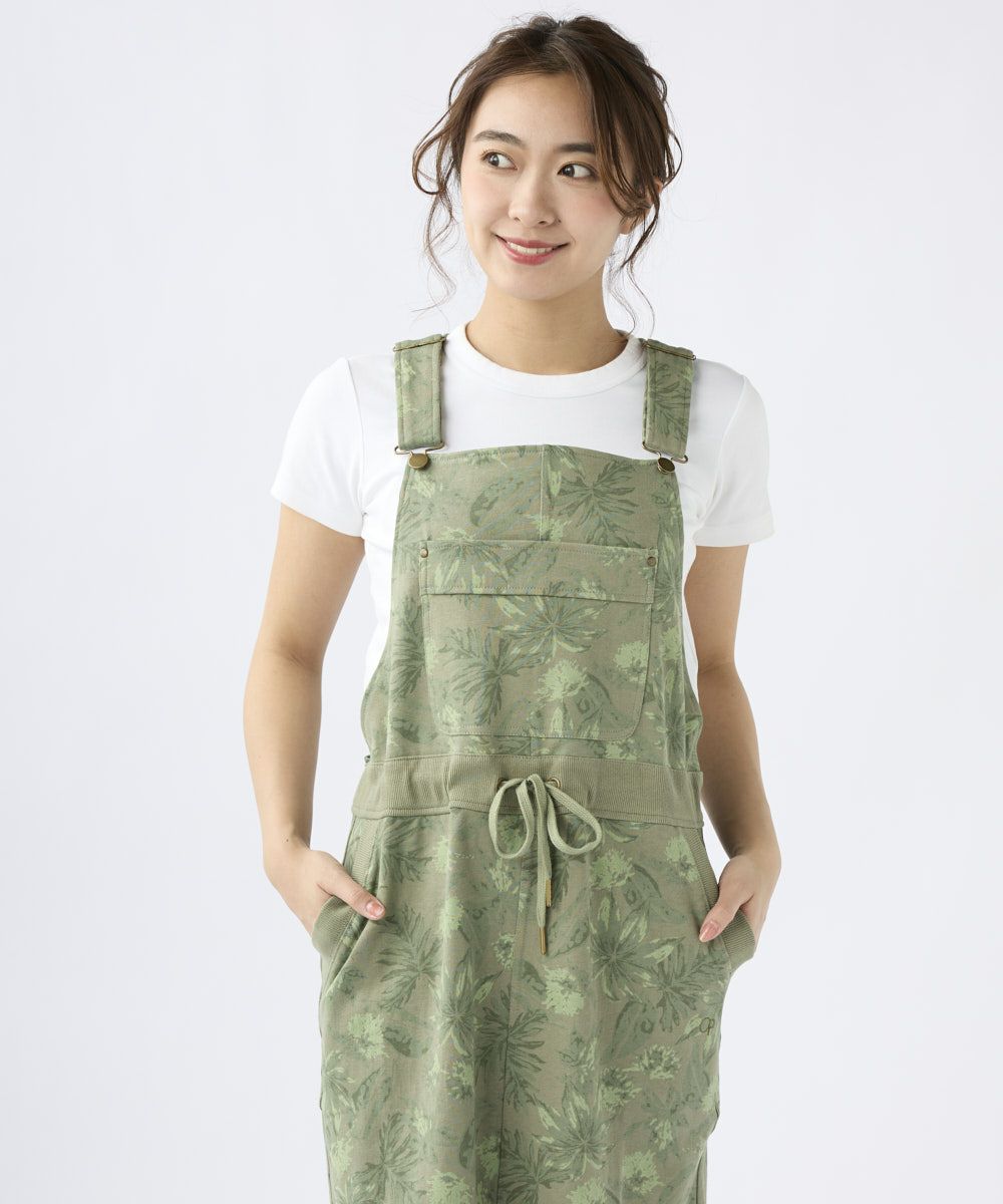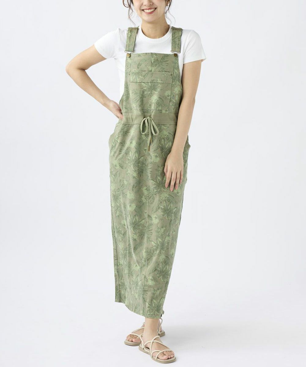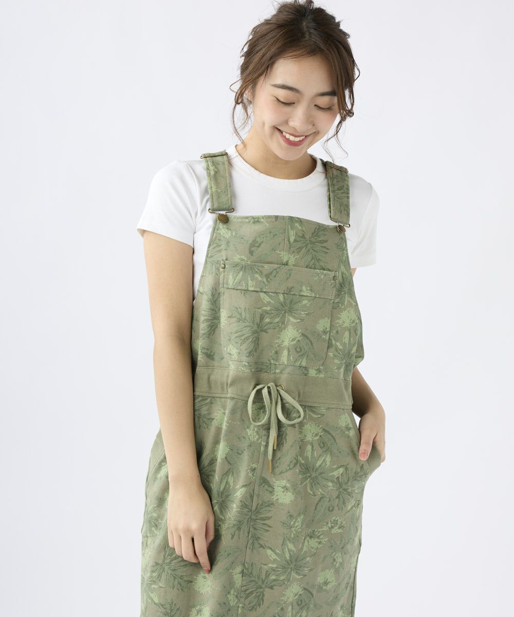 ボタニカル柄のジャンパースカート。ワンマイルにもぴったり。ウエストが調整できるので、妊婦の方にもおすすめ。